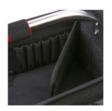 Torba posiada kieszenie zarówno na zewnętrznych ściankach, jak i wewnątrz. Pozwala to na segregację narzędzi według częstotliwości użycia — narzędzia sięgane najczęściej można umieścić w kieszeniach zewnętrznych, a pozostałe w przestrzeni głównej.