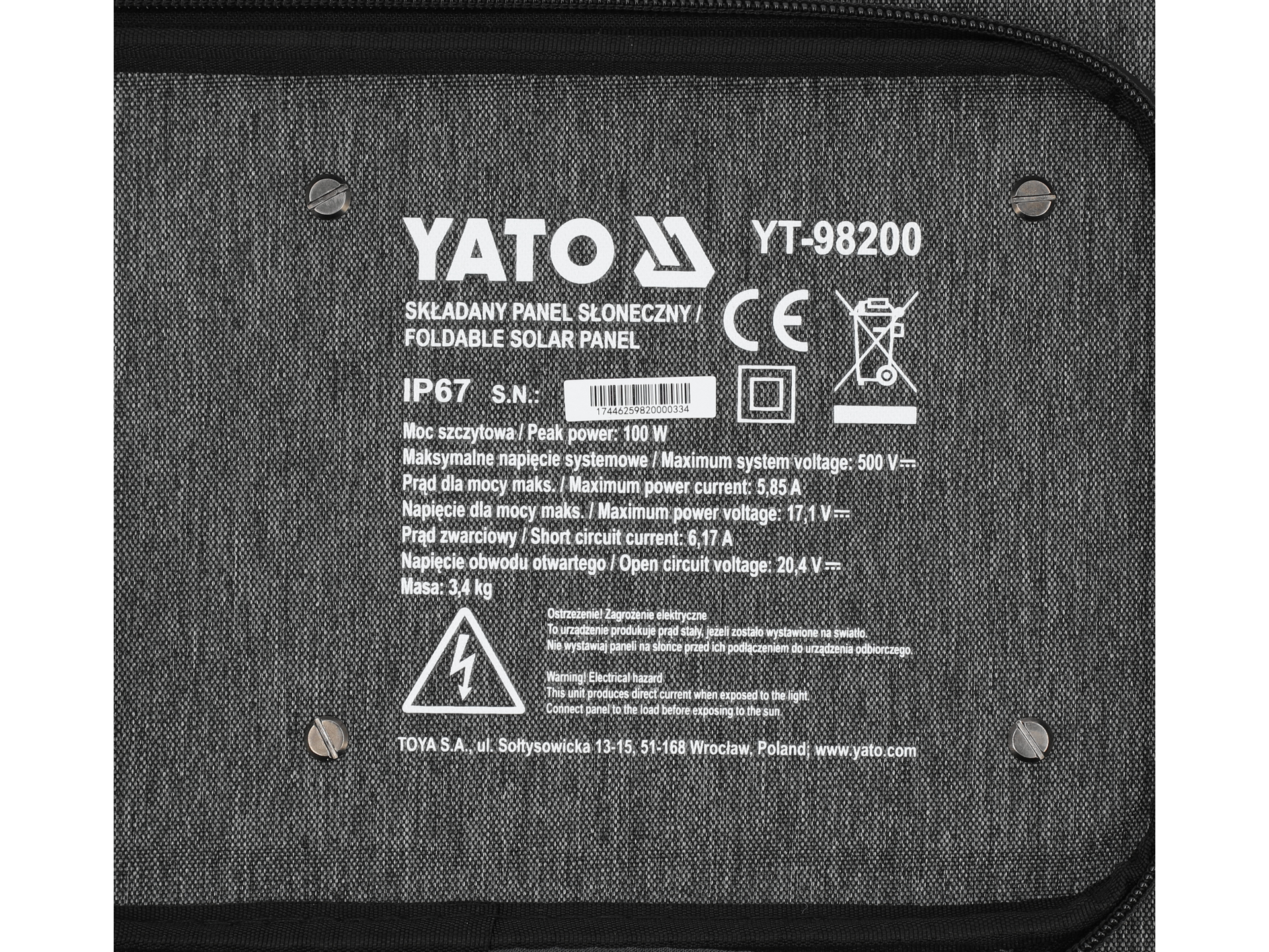 Certyfikacja IP67 potwierdza pełną ochronę przed kurzem oraz możliwość zanurzenia w wodzie na głębokość do 1 metra przez 30 minut. Panel może pracować podczas deszczu, jednak nie jest przeznaczony do stałej eksploatacji w wodzie.