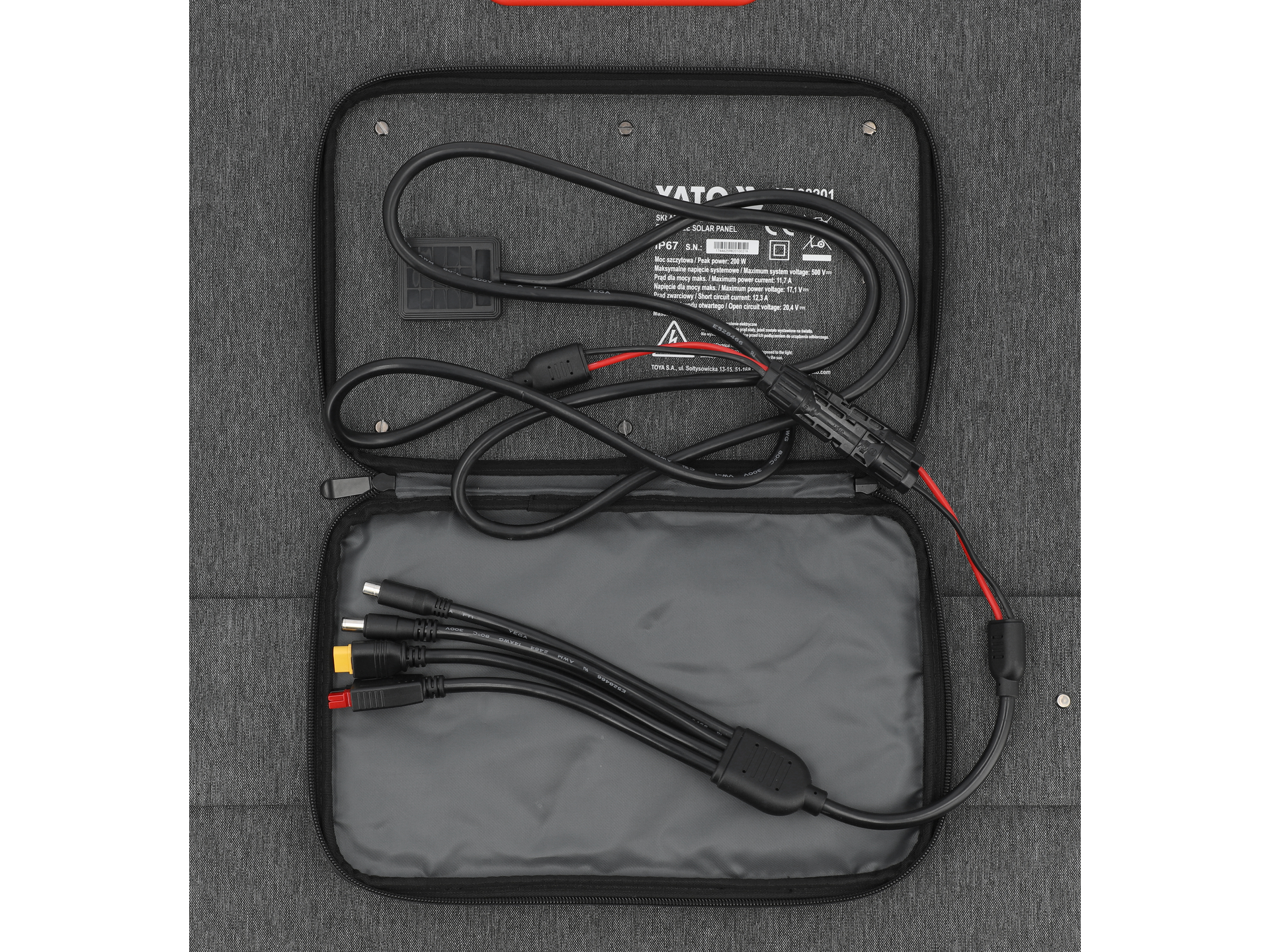 Zestaw zawiera adapter z czterema wyjściami: DC7909 (standardowe laptopy), DC8020 (starsze modele laptopów), XT60 (stacje energetyczne i sprzęt RC) oraz Anderson (urządzenia przemysłowe i automotive). Kabel solarny o długości 2m zakończony złączem pozwala na bezpośrednie podłączenie do stacji YATO YT-83090, YT-83091, YT-83092 oraz większości konkurencyjnych modeli.