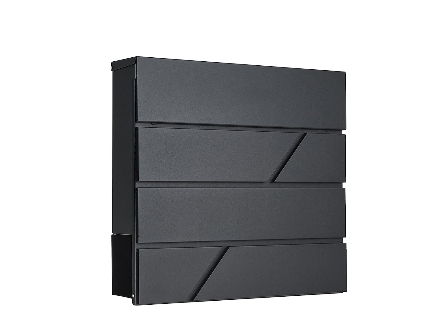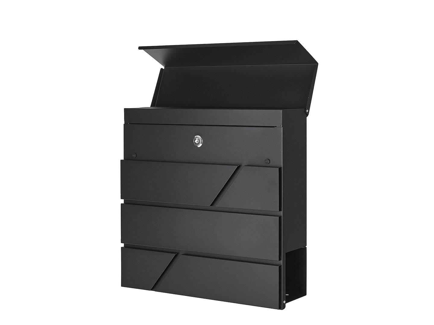 Drzwiczki zamykane na zamek z dwoma kluczami w zestawie zabezpieczają zawartość przed dostępem osób trzecich. Geometryczne przetłoczenia na froncie pełnią funkcję zarówno estetyczną, jak i usztywniającą blachę.