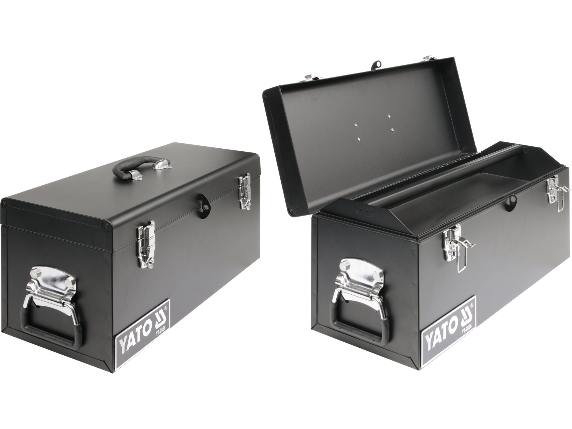 Metalowa skrzynka narzędziowa z blachy stalowej lakierowanej proszkowo. Konstrukcja z komorą główną, wyjmowaną półką i dwoma zamkami z możliwością zabezpieczenia kłódką.