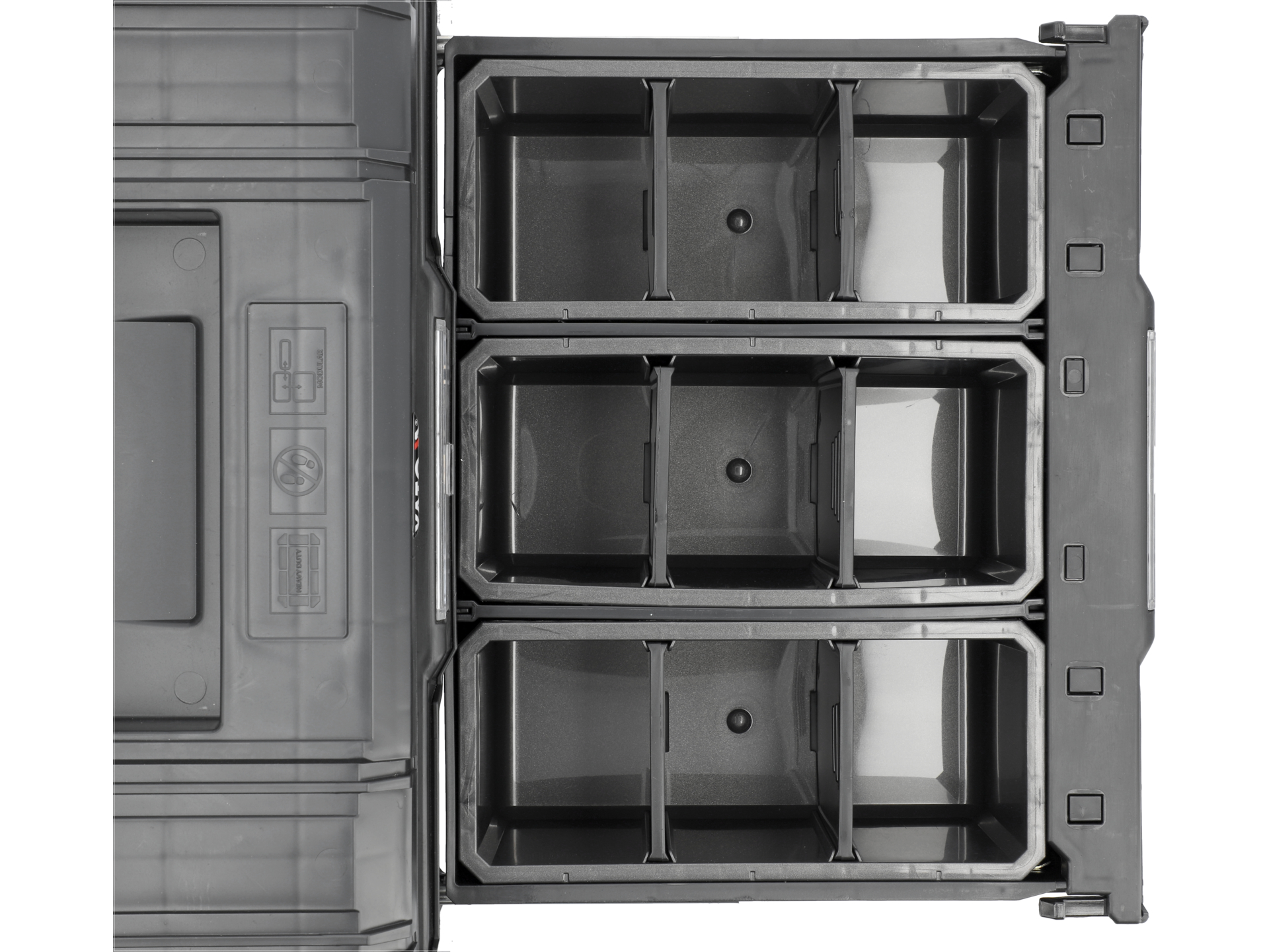 Skrzynka YATO YT-08973 wyposażona jest w demontowalne przegrody i kubełki, które umożliwiają indywidualną konfigurację przestrzeni. System blokowania szuflad zapobiega ich przypadkowemu wysunięciu, a metalowe prowadnice gwarantują łatwy dostęp i demontaż. Dodatkową zaletą jest możliwość zawieszenia skrzynki na ścianie, co oszczędza miejsce i ułatwia dostęp do narzędzi.