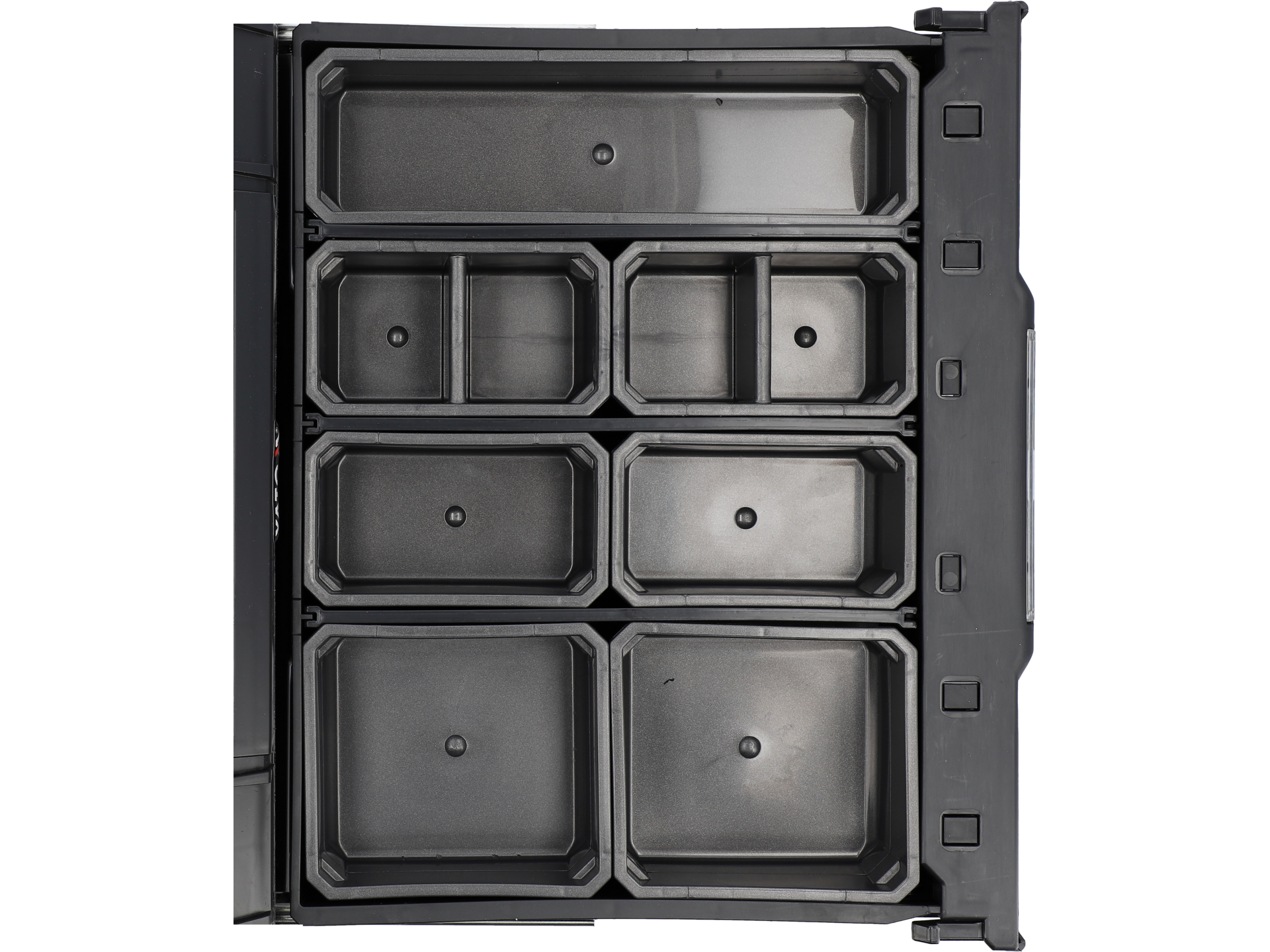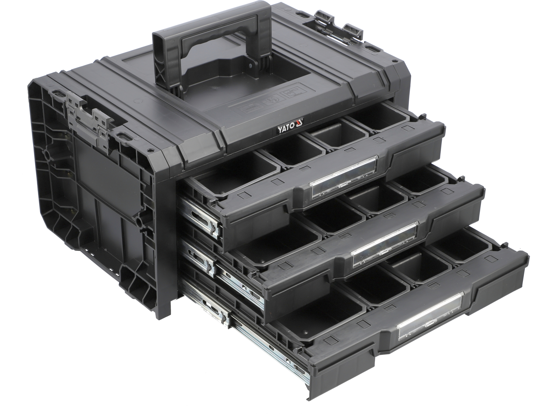 Modułowa skrzynka warsztatowa z trzema szufladami o pojemności 4,5 l każda, wyposażona w metalowe prowadnice i demontowalne przegrody. Kompatybilna z systemami S12 i S1 marki YATO, umożliwia budowę mobilnego stanowiska warsztatowego.