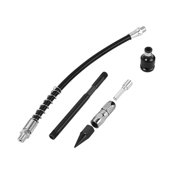 Elastyczny wężyk ułatwia precyzyjne podanie smaru w miejscach, do których trudno podejść sztywną końcówką.