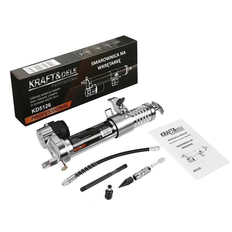 SMAROWNICA NA WKRĘTARKĘ Z WĘŻYKIEM KD5126 / KD5126 / KRAFT&DELE to solidna smarownica na wkrętarkę dla osób, które chcą smarować szybciej i wygodniej, bez ręcznego pompowania. Jeśli szukasz narzędzia do regularnej konserwacji maszyn, pojazdów i urządzeń, model KD5126 będzie praktycznym uzupełnieniem warsztatu.