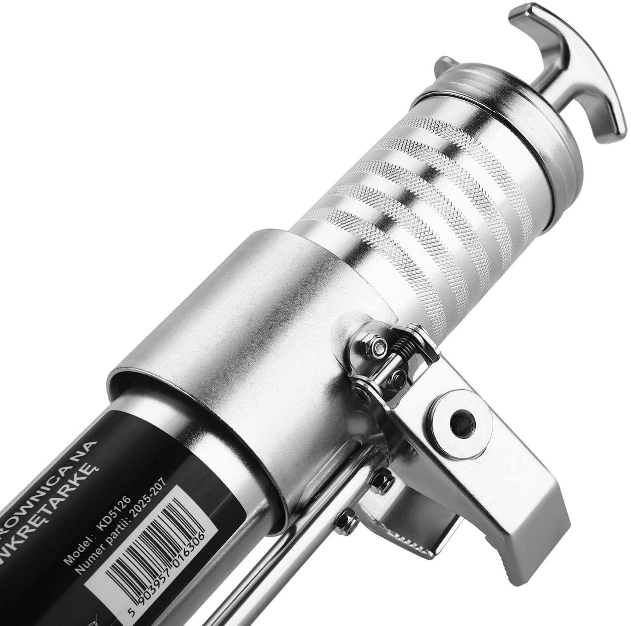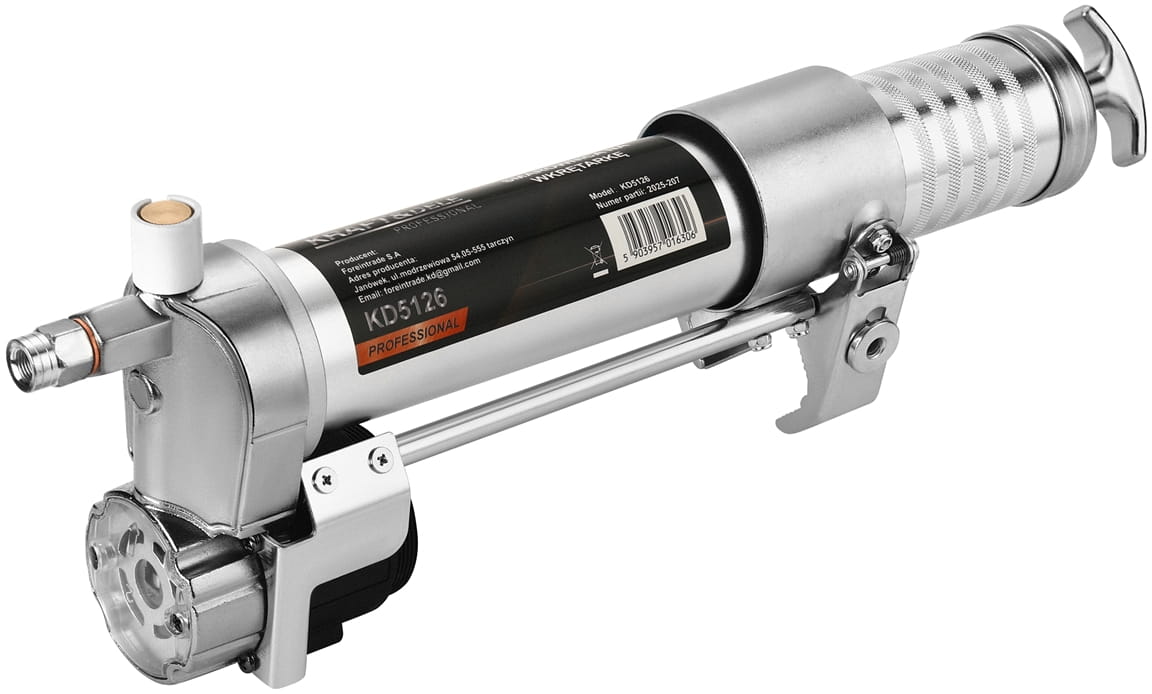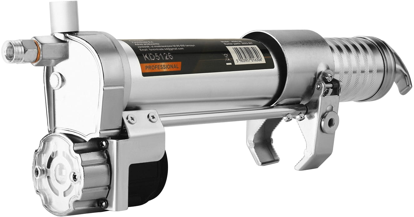 Smarownica KD5126 to narzędzie warsztatowe współpracujące z wkrętarką lub wiertarką wyposażoną w uchwyt 1/4". Napęd mechaniczny przenoszony ze wkrętarki zastępuje ręczne pompowanie, co skraca czas smarowania i zmniejsza wysiłek fizyczny podczas konserwacji maszyn, pojazdów oraz urządzeń przemysłowych i rolniczych.