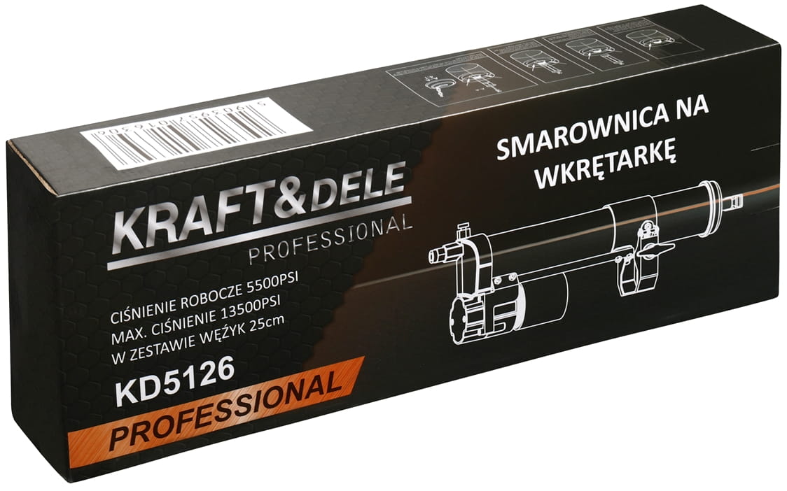 Smarownica KD5126 wymaga wkrętarki lub wiertarki z uchwytem bitowym 1/4" (HEX). Przed użyciem należy upewnić się, że narzędzie napędowe dysponuje wystarczającym momentem obrotowym do tłoczenia smaru o właściwej konsystencji. Narzędzie współpracuje zarówno z wkrętarkami akumulatorowymi, jak i sieciowymi.