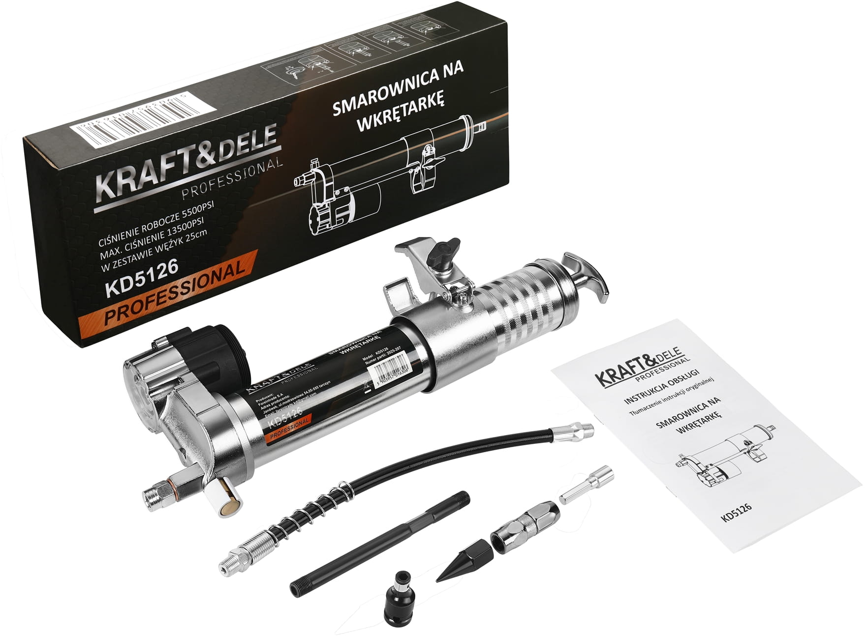 | Zawartość zestawu | Smarownica HEX 1/4", elastyczny wężyk, adaptery, przedłużka |