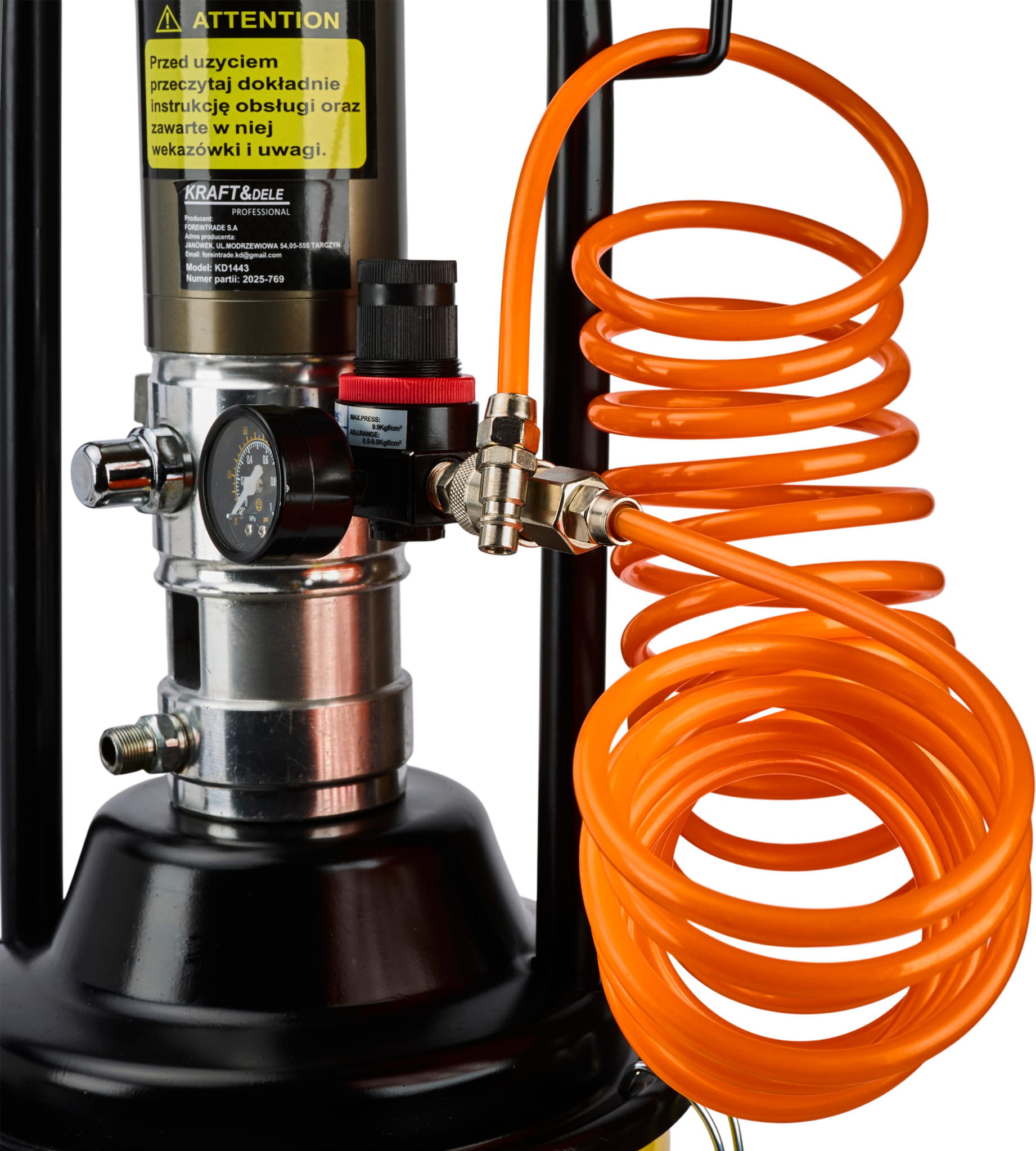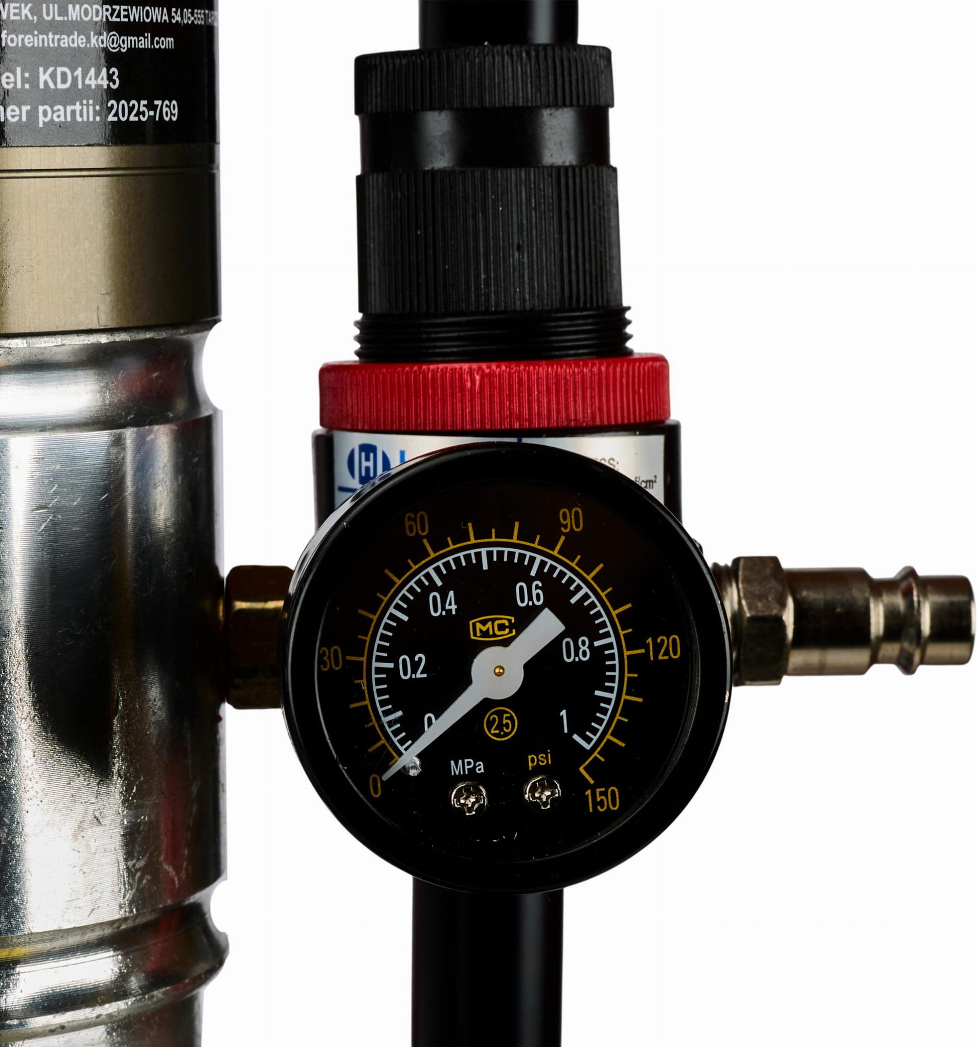 KD1443 to pneumatyczna smarownica tłoczkowa marki KRAFT&DELE przeznaczona do profesjonalnego smarowania elementów mechanicznych w warsztatach, zakładach przemysłowych i gospodarstwach rolnych. Urządzenie pracuje na sprężonym powietrzu i tłoczy smar pod wysokim ciśnieniem, eliminując konieczność stosowania ręcznych smarowniczek przy punktach smarnych trudno dostępnych lub wymagających dużej siły podawania smaru.