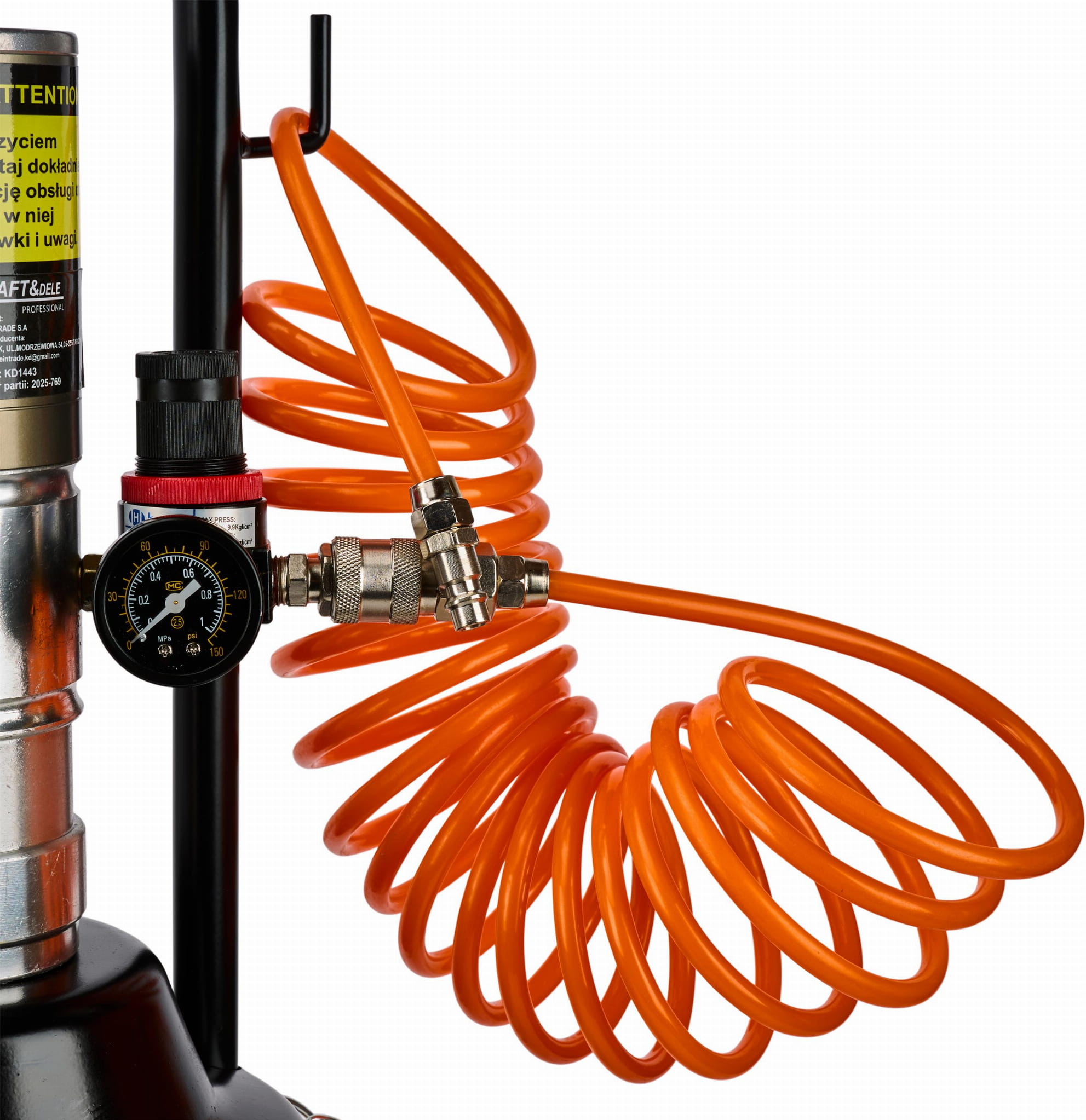 Smarownica KD1443 wymaga zasilania sprężonym powietrzem w zakresie 3–7 bar. Przed podłączeniem należy sprawdzić, czy posiadana sprężarka osiąga minimalne ciśnienie robocze 3 bar przy wymaganym przepływie. Do obsługi urządzenia wystarczy standardowa sprężarka warsztatowa z zbiornikiem od 24 L wzwyż. Przyłącze powietrza należy wyposażyć w filtroodwadniacz, aby zapobiec przedostawaniu się wilgoci do mechanizmu tłoczkowego.