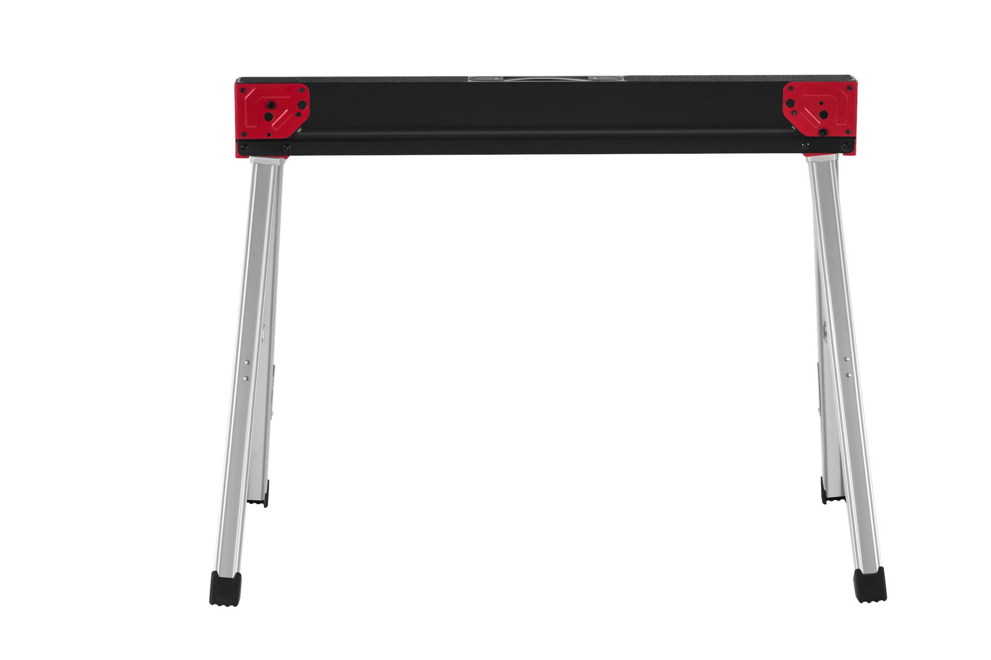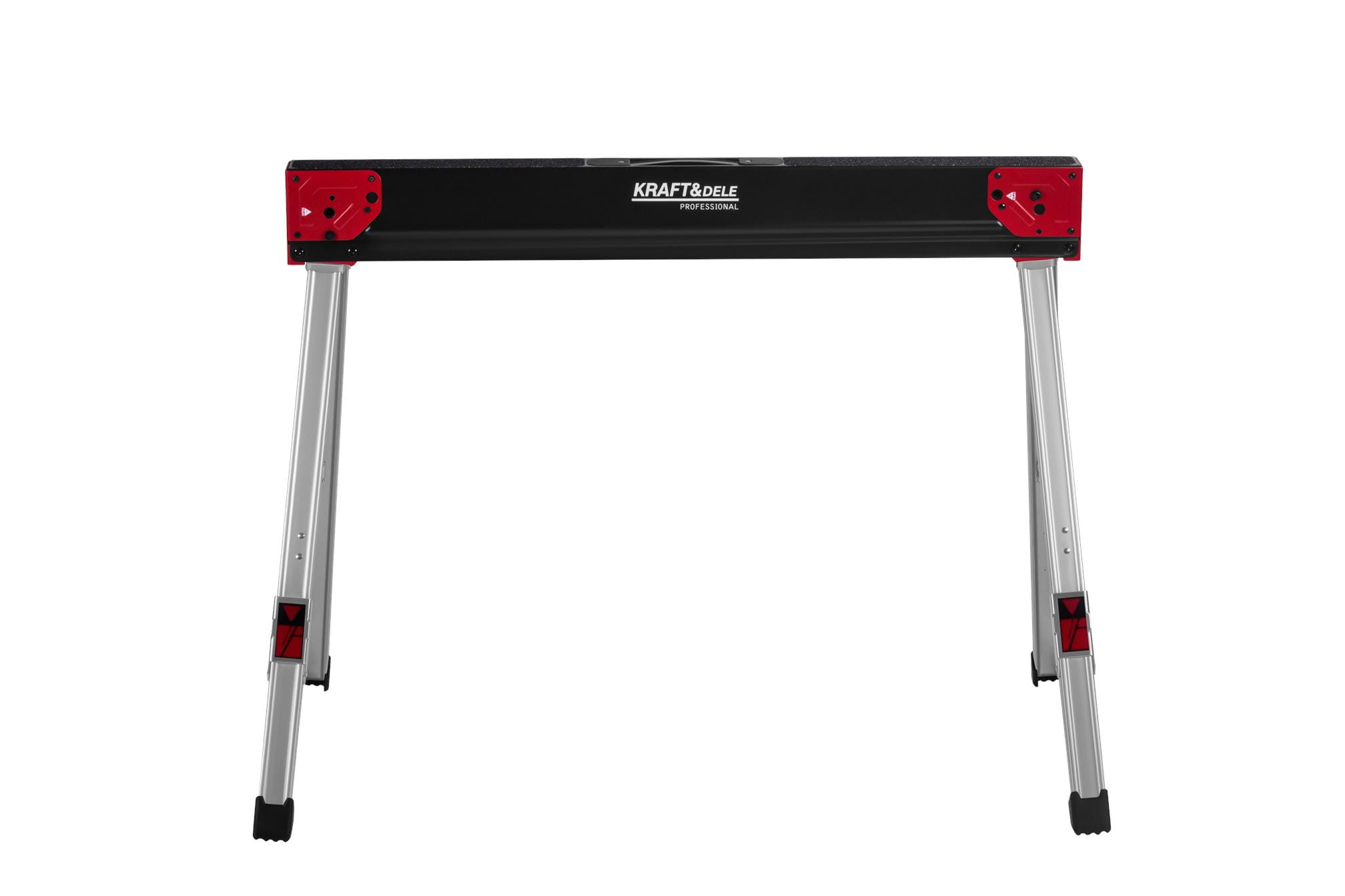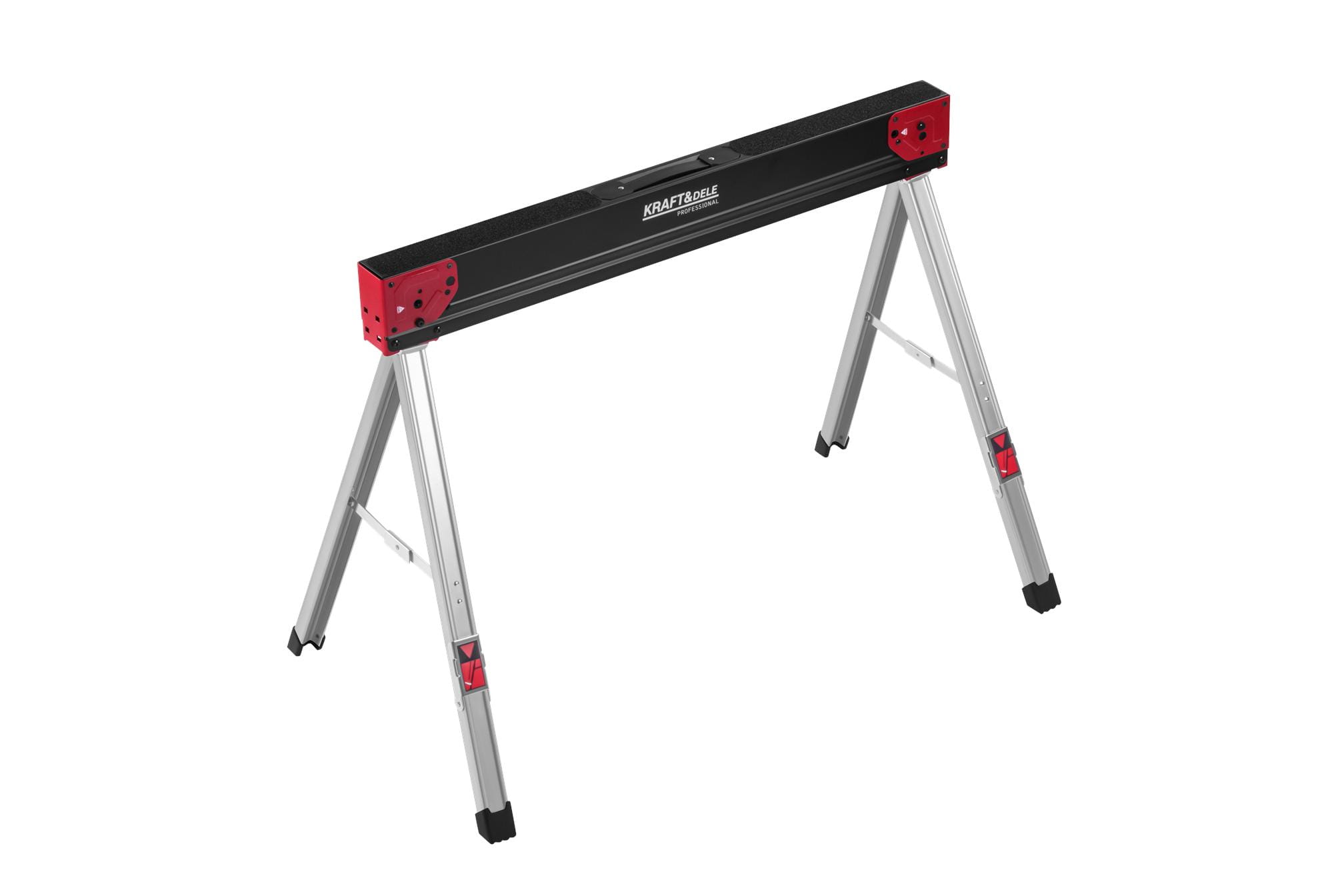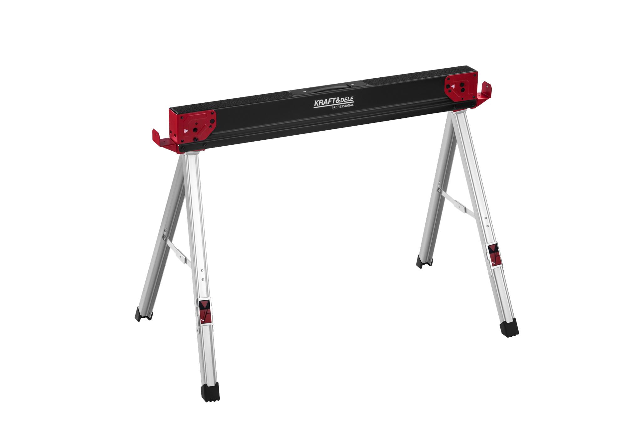 Nogi rozkłada się za pomocą przycisku — bez użycia narzędzi i bez konieczności montażu. Po złożeniu koziołek ma wymiary 95 × 7 × 11,5 cm, co pozwala przechowywać go w samochodzie dostawczym, skrzynce narzędziowej lub szafie warsztatowej.
