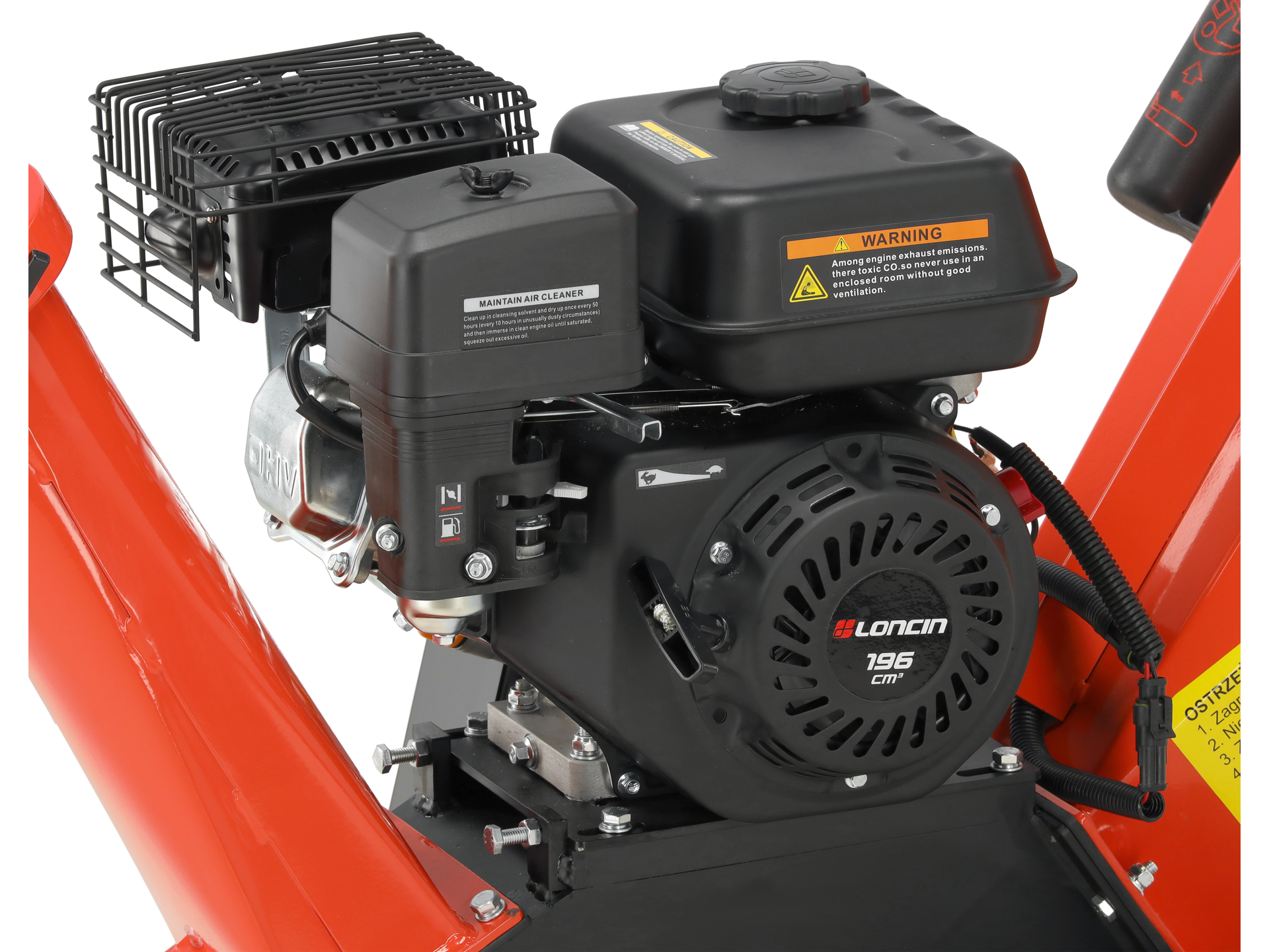Profesjonalny rozdrabniacz spalinowy z silnikiem czterosuwowym LONCIN G200F o mocy 4,8 kW. Urządzenie przeznaczone do przetwarzania gałęzi o średnicy do 100 mm na zrębki nadające się do kompostowania, produkcji ściółki lub wykorzystania jako materiał opałowy.