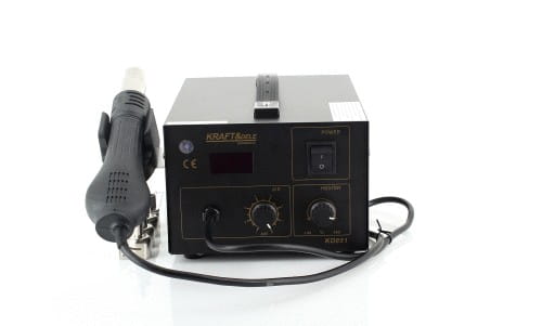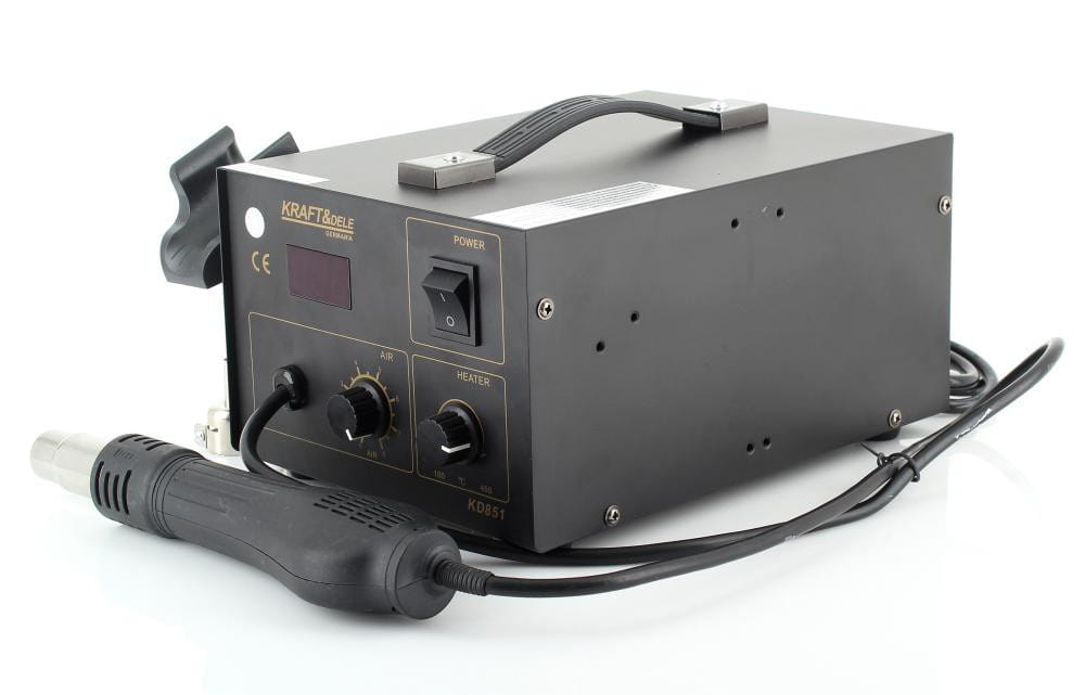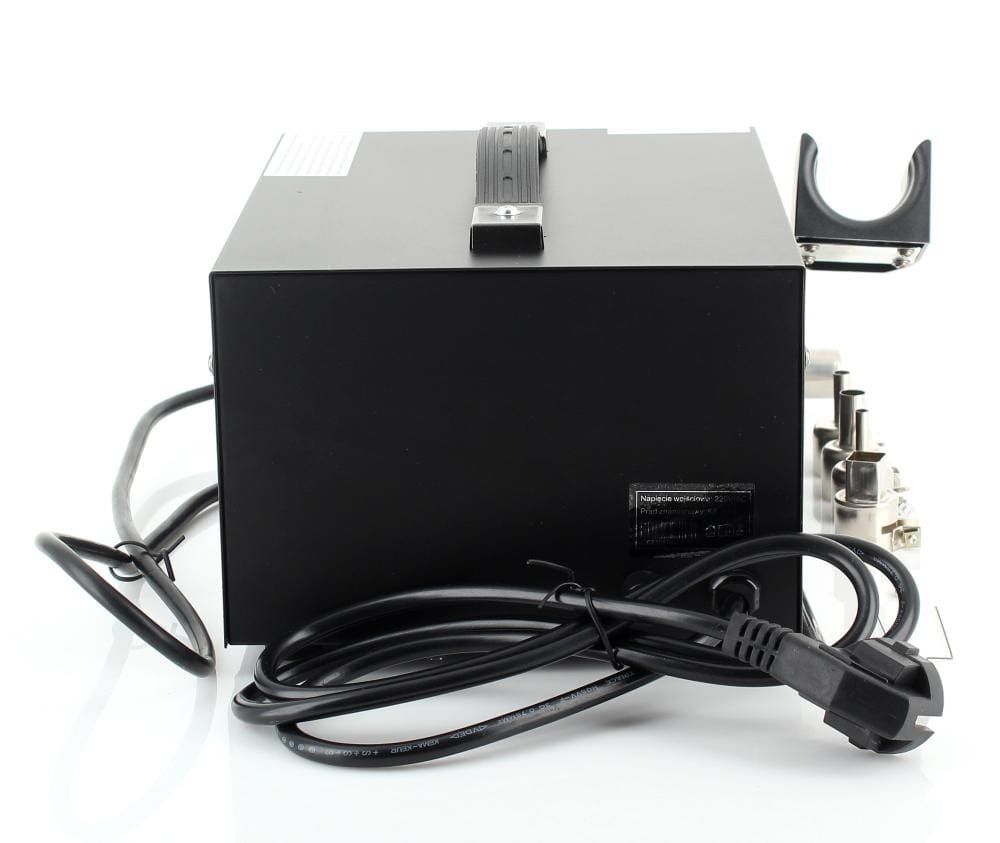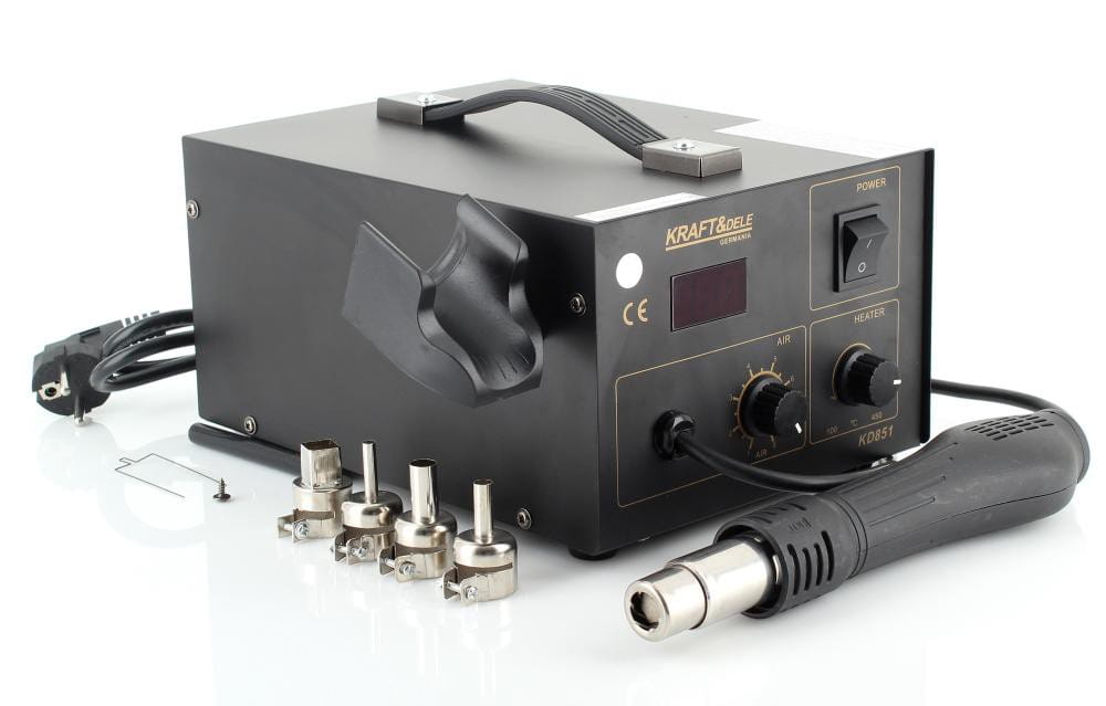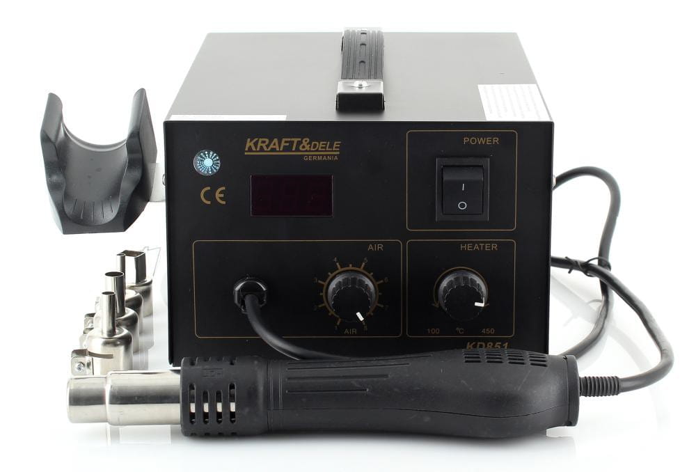 KD851 to urządzenie do spawania tworzyw sztucznych wyposażone w funkcję 2w1 oraz zestaw 4 wymiennych dysz, umożliwiające naprawę i łączenie elementów plastikowych w różnych konfiguracjach roboczych.