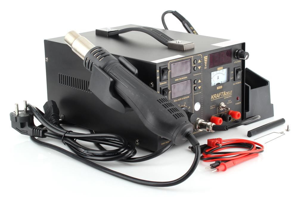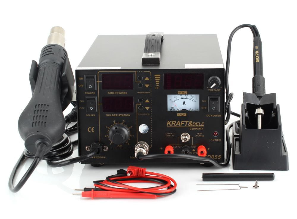 KD855 to kombinowane urządzenie łączące stację lutowniczą z kolbą 60 W oraz spawarkę do plastiku z gorącym powietrzem o przepływie do 240 l/min. Zakres regulacji temperatury 100–480°C, mikroprocesorowy system PID oraz cztery dysze w zestawie pozwalają na precyzyjną pracę zarówno przy naprawach elementów plastikowych, jak i lutowaniu elektroniki.