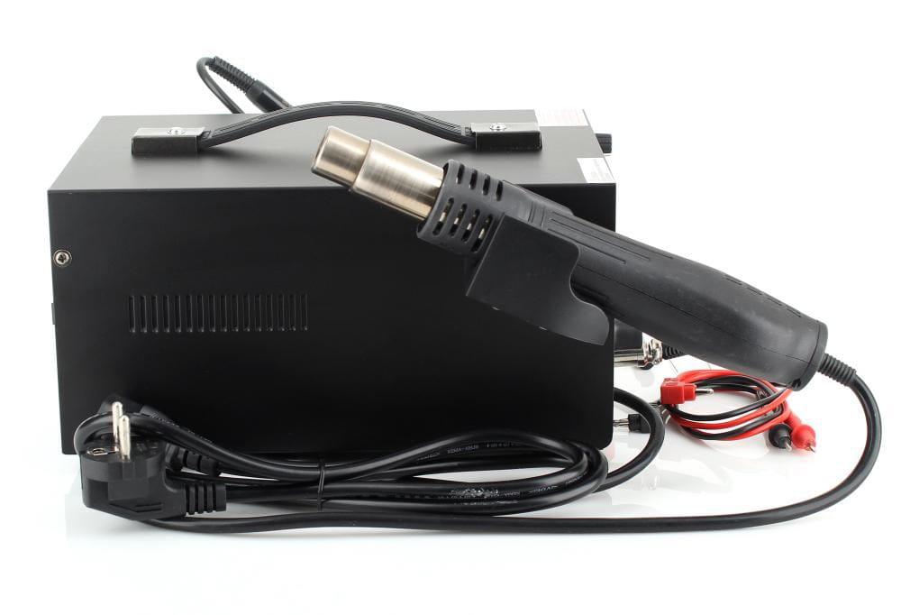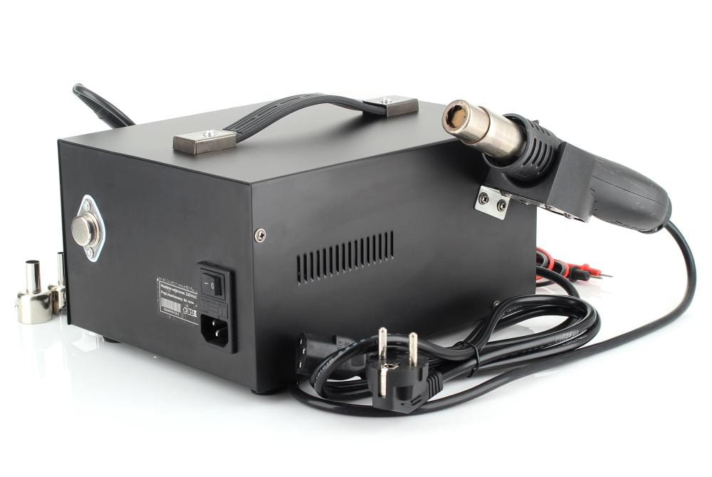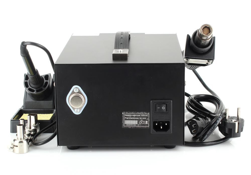 Urządzenie posiada trzy oddzielne wyświetlacze LED: temperaturę grota, temperaturę gorącego powietrza oraz miernik. Regulacja odbywa się za pomocą pokręteł, co umożliwia płynne dostosowanie parametrów bez konieczności przechodzenia przez menu. Długość kolby wynosi 120 cm, a przewód zasilający 2 m – co zapewnia swobodę manewrowania na stanowisku pracy.