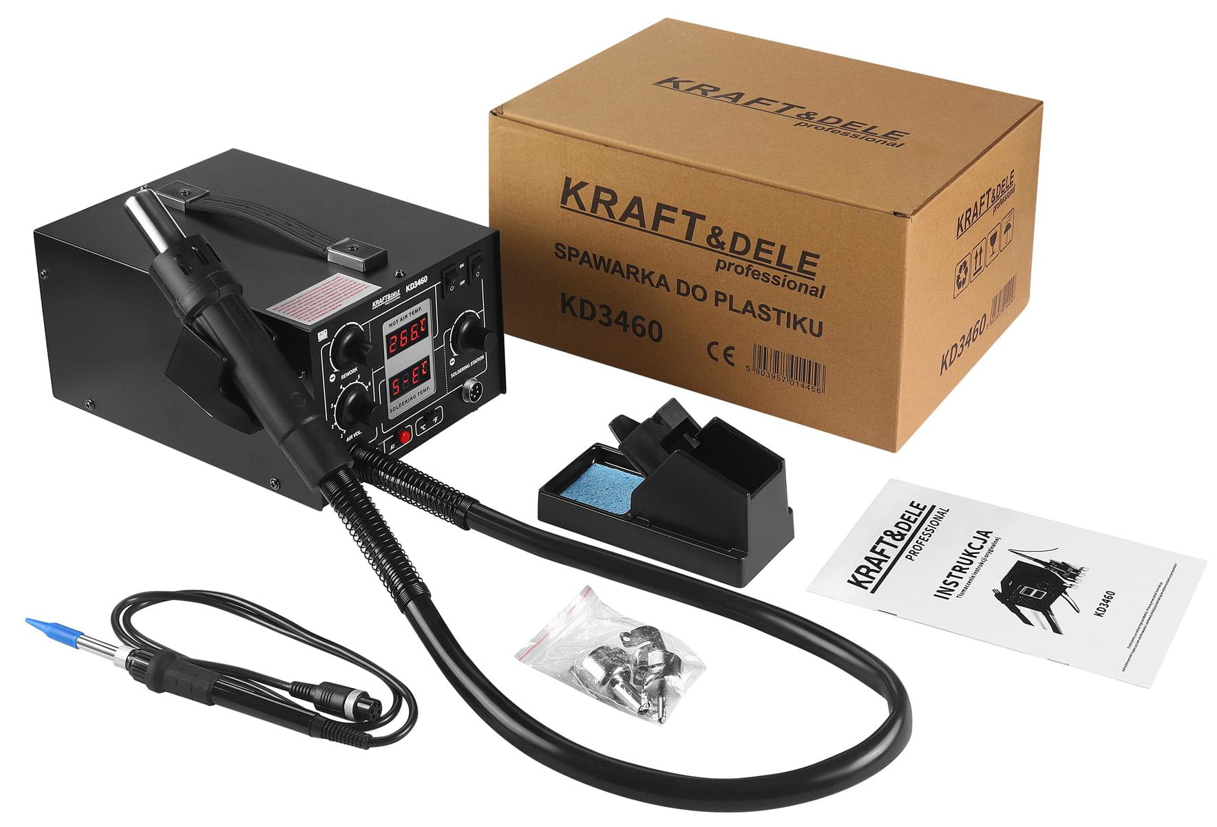 W skład zestawu wchodzi: stacja KD3460, lutownica, końcówki robocze, podstawka pod lutownicę, gąbka do czyszczenia grotu oraz instrukcja obsługi w języku polskim.