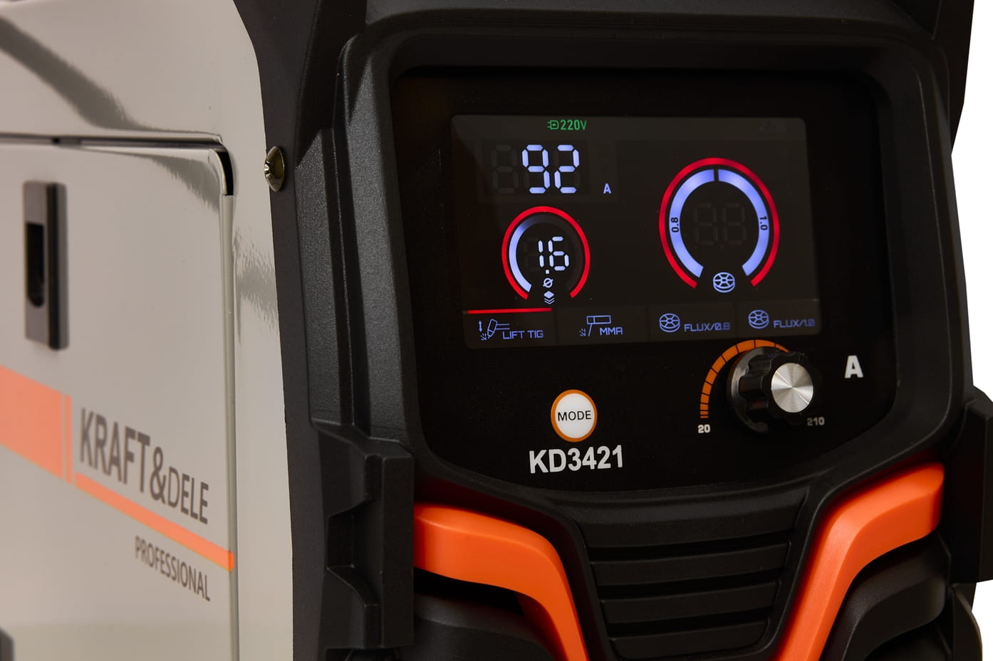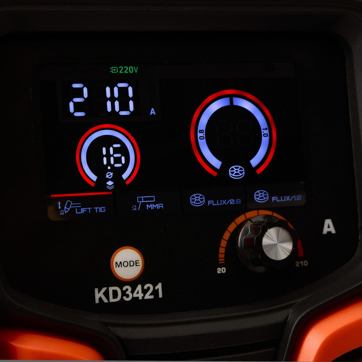 KD3421 to jednofazowa spawarka inwertorowa IGBT obsługująca trzy metody spawania: MIG z drutem samoosłonowym (Flux), TIG Lift oraz MMA elektrodą otuloną. Urządzenie pracuje przy zasilaniu 230V i osiąga maksymalny prąd spawania 220A, przy czym cykl pracy 100% jest realizowany właśnie przy tej wartości — co oznacza brak konieczności przerw technologicznych podczas ciągłej pracy.