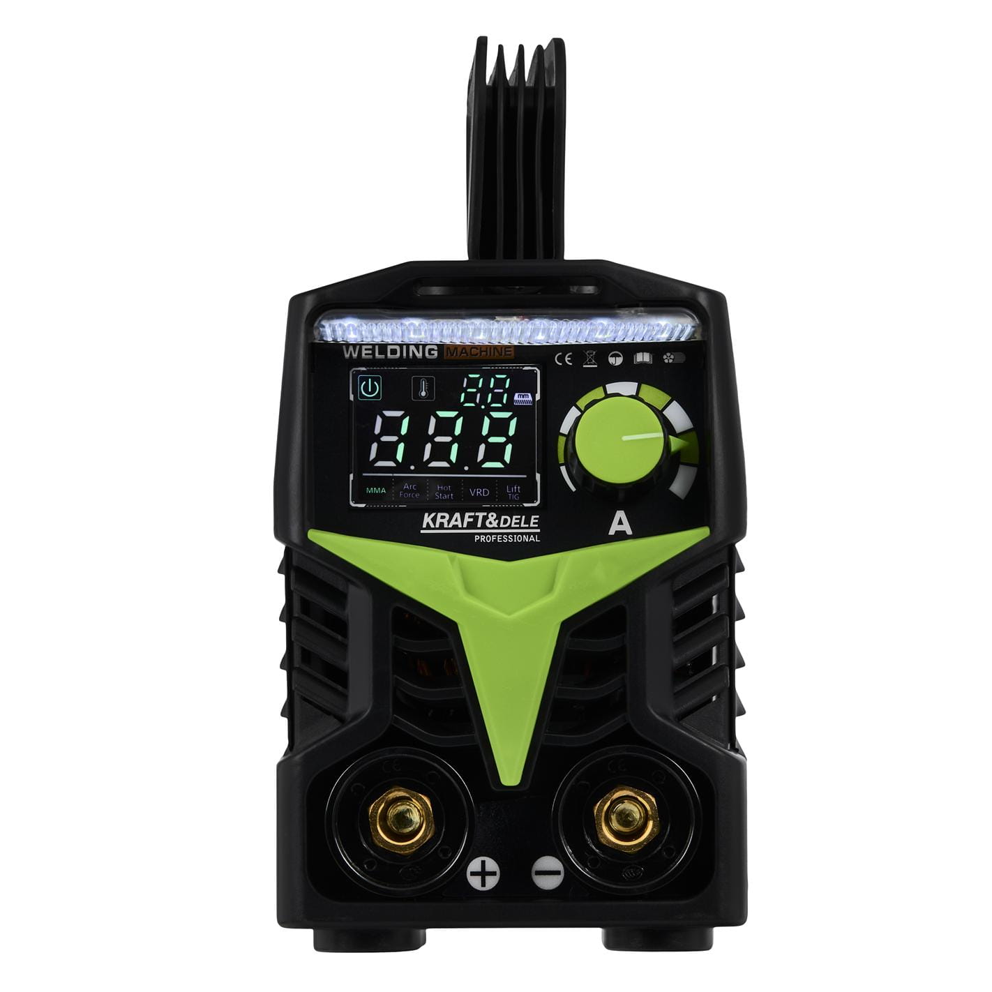 VRD (Voltage Reduction Device) automatycznie obniża napięcie na uchwycie spawalniczym, gdy łuk nie jest zajarzony. Zmniejsza to ryzyko porażenia prądem podczas przerw w pracy — szczególnie istotne przy spawaniu w warunkach zwiększonego zawilgocenia lub w pozycjach wymuszonych. Napięcie robocze przywracane jest automatycznie w momencie ponownego kontaktu elektrody z materiałem.