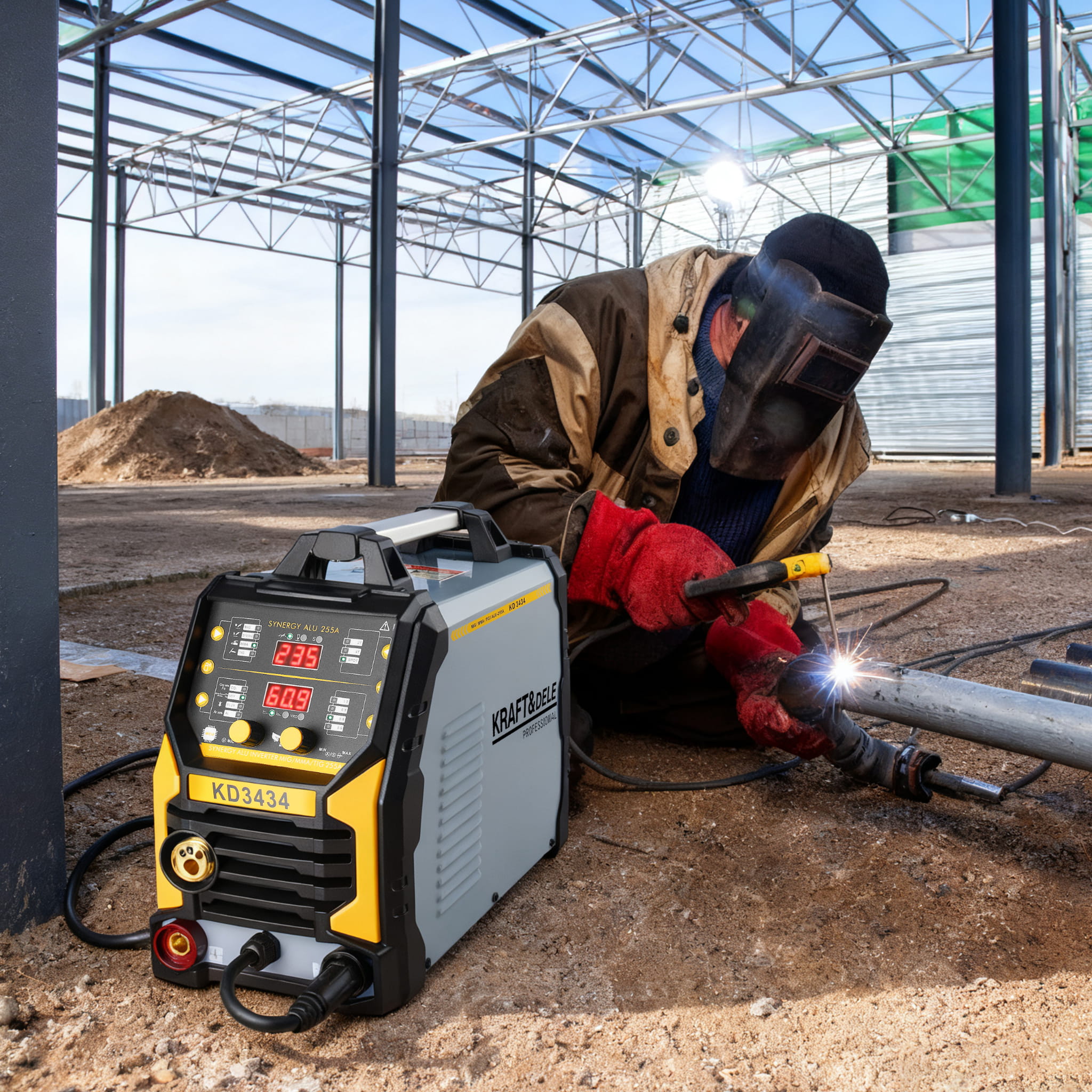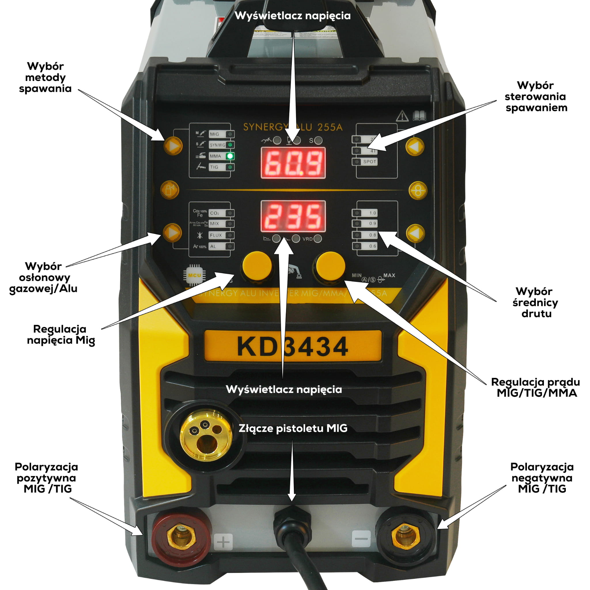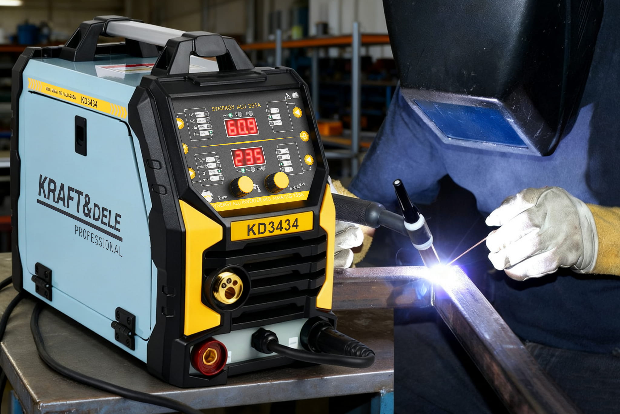 KD3434 to spawarka inwertorowa obsługująca trzy metody spawania — MIG Flux, MMA oraz TigLift — w jednym urządzeniu zasilanym ze standardowego gniazda 230V. Maksymalny prąd spawania wynosi 255A, co pozwala na pracę z elektrodami do 4,0 mm i drutem spawalniczym 0,8–1,0 mm.
