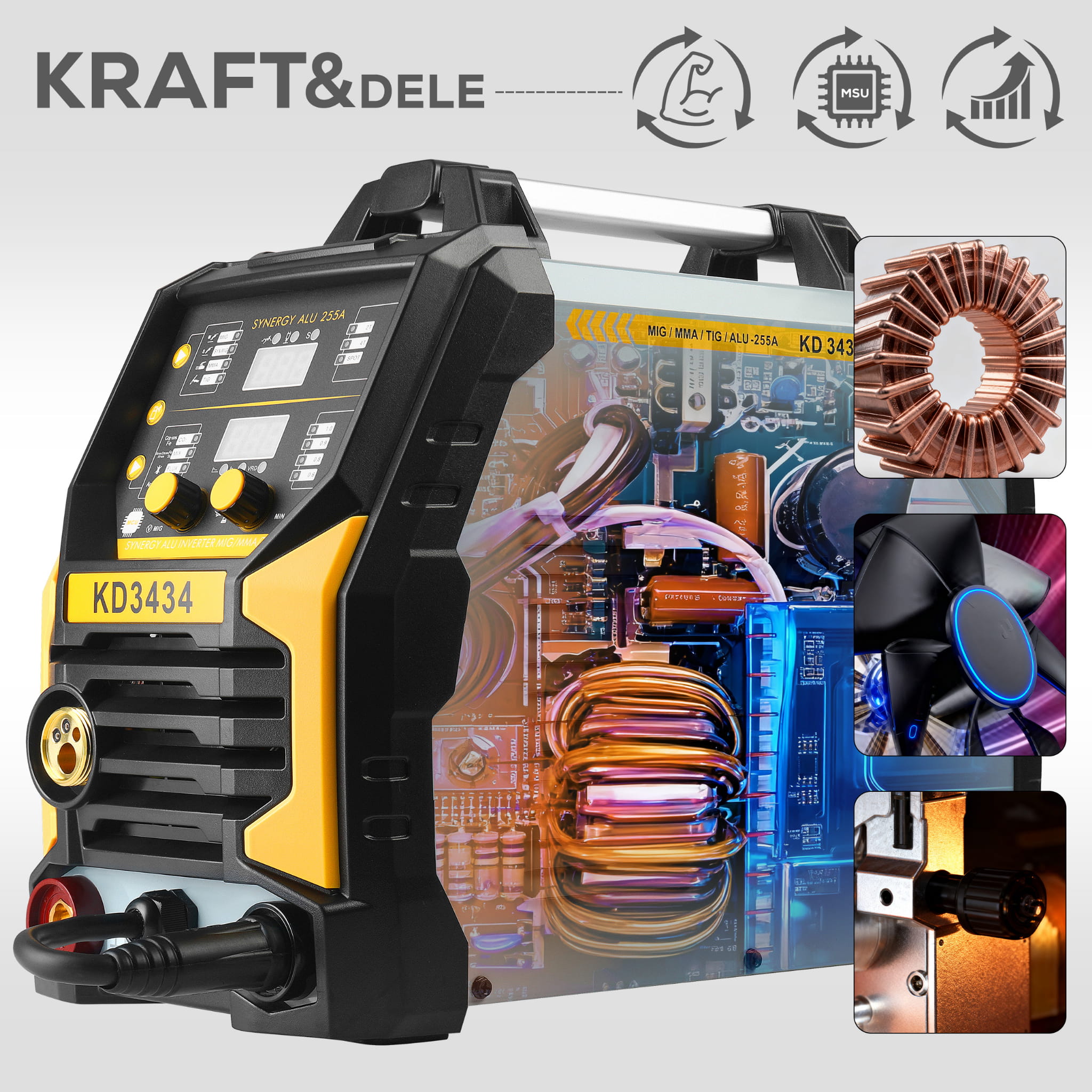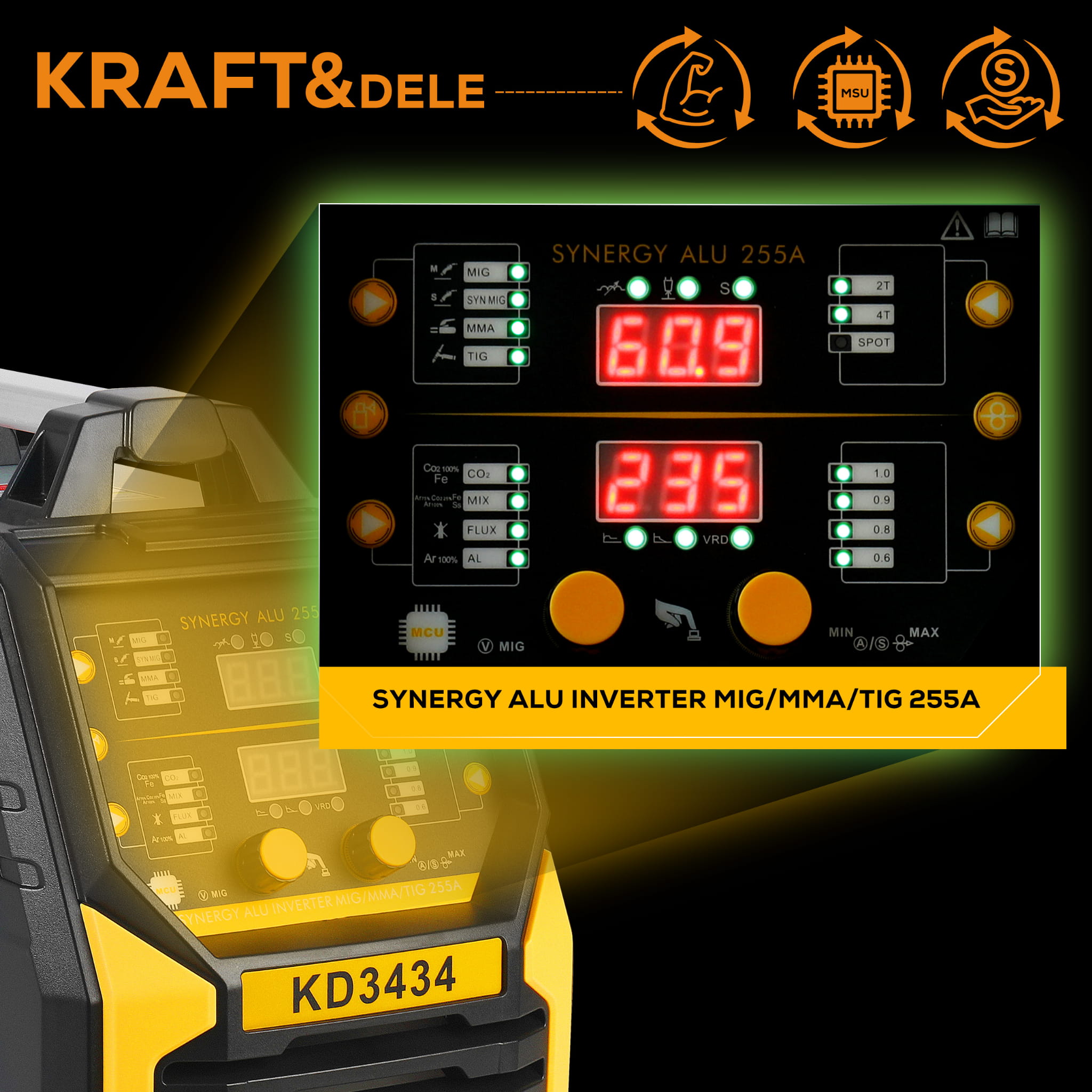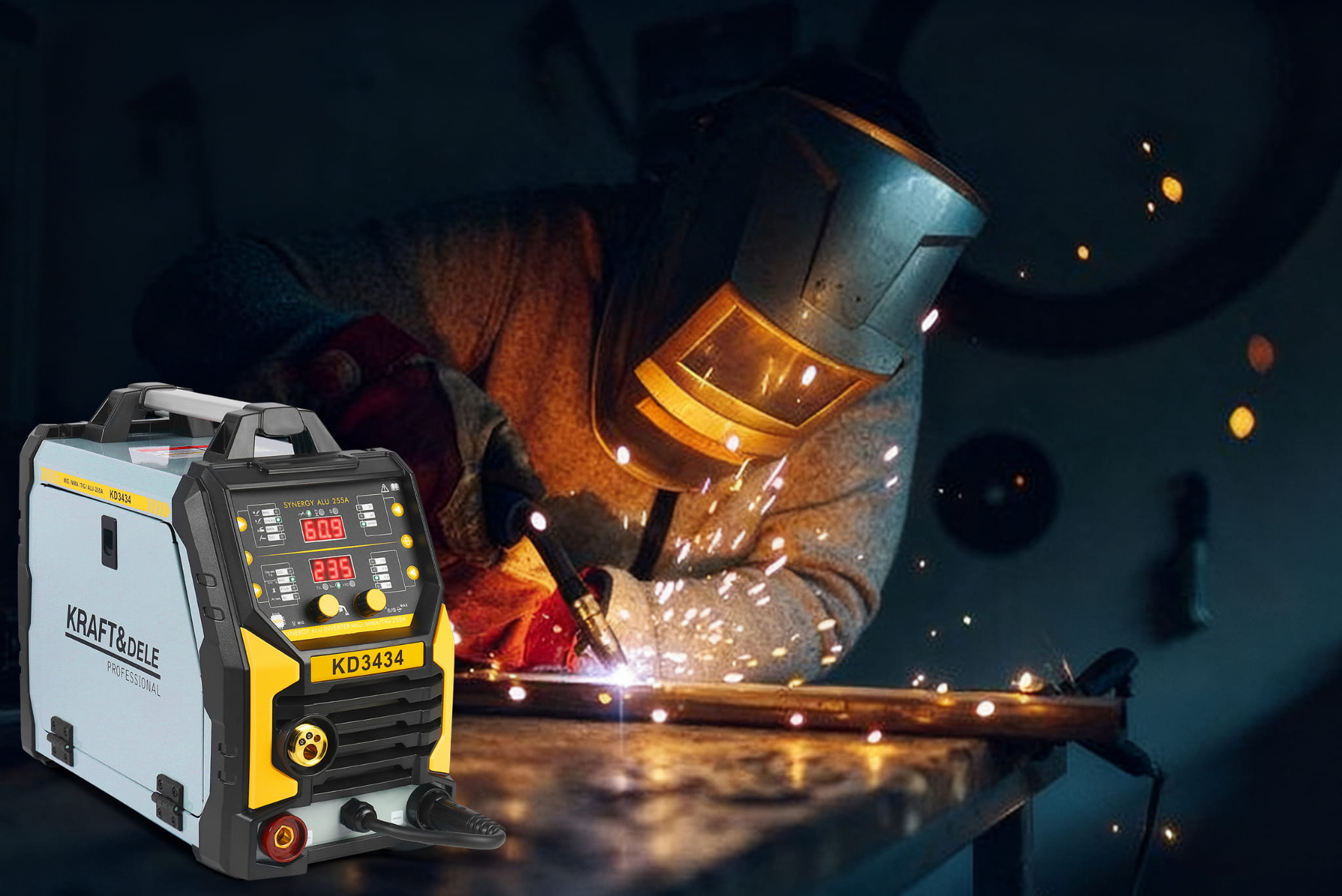 KD3434 to spawarka inwertorowa obsługująca trzy metody spawania — MIG Flux, MMA oraz TigLift — w jednym urządzeniu zasilanym ze standardowego gniazda 230V. Maksymalny prąd spawania wynosi 255A, co pozwala na pracę z elektrodami do 4,0 mm i drutem spawalniczym 0,8–1,0 mm.
