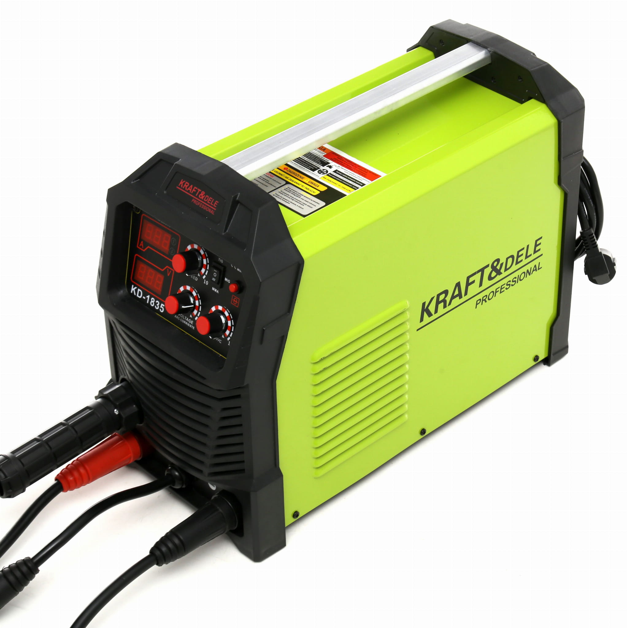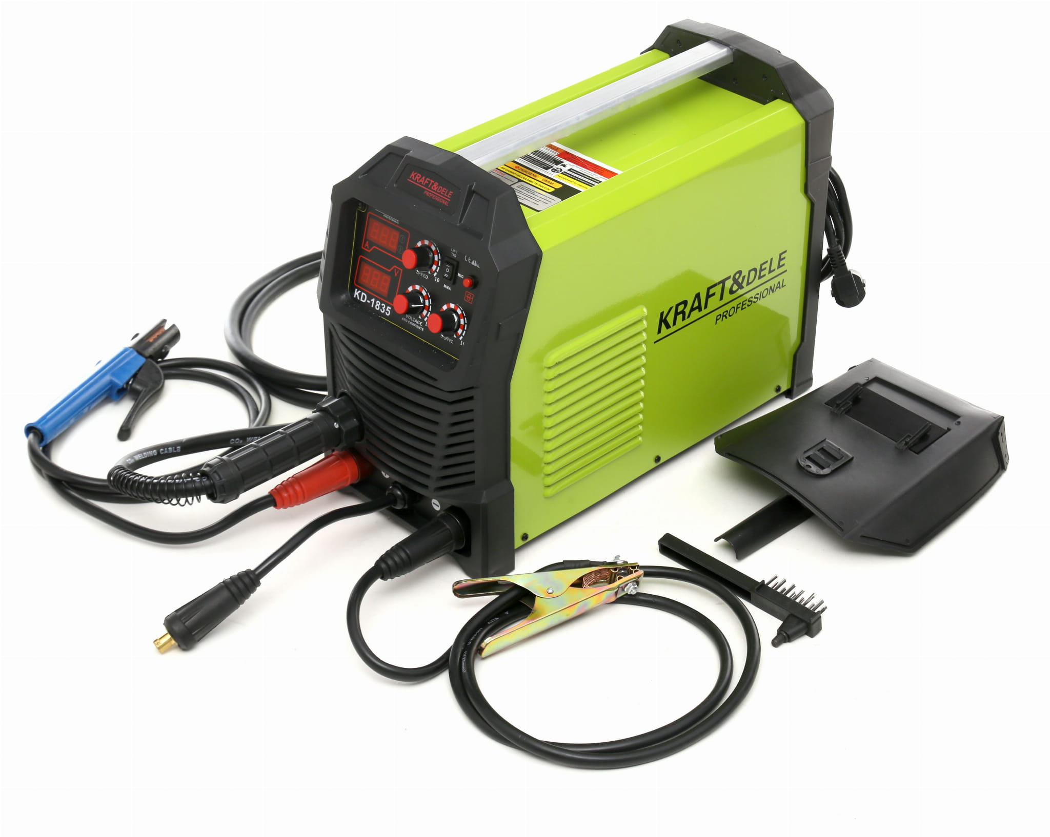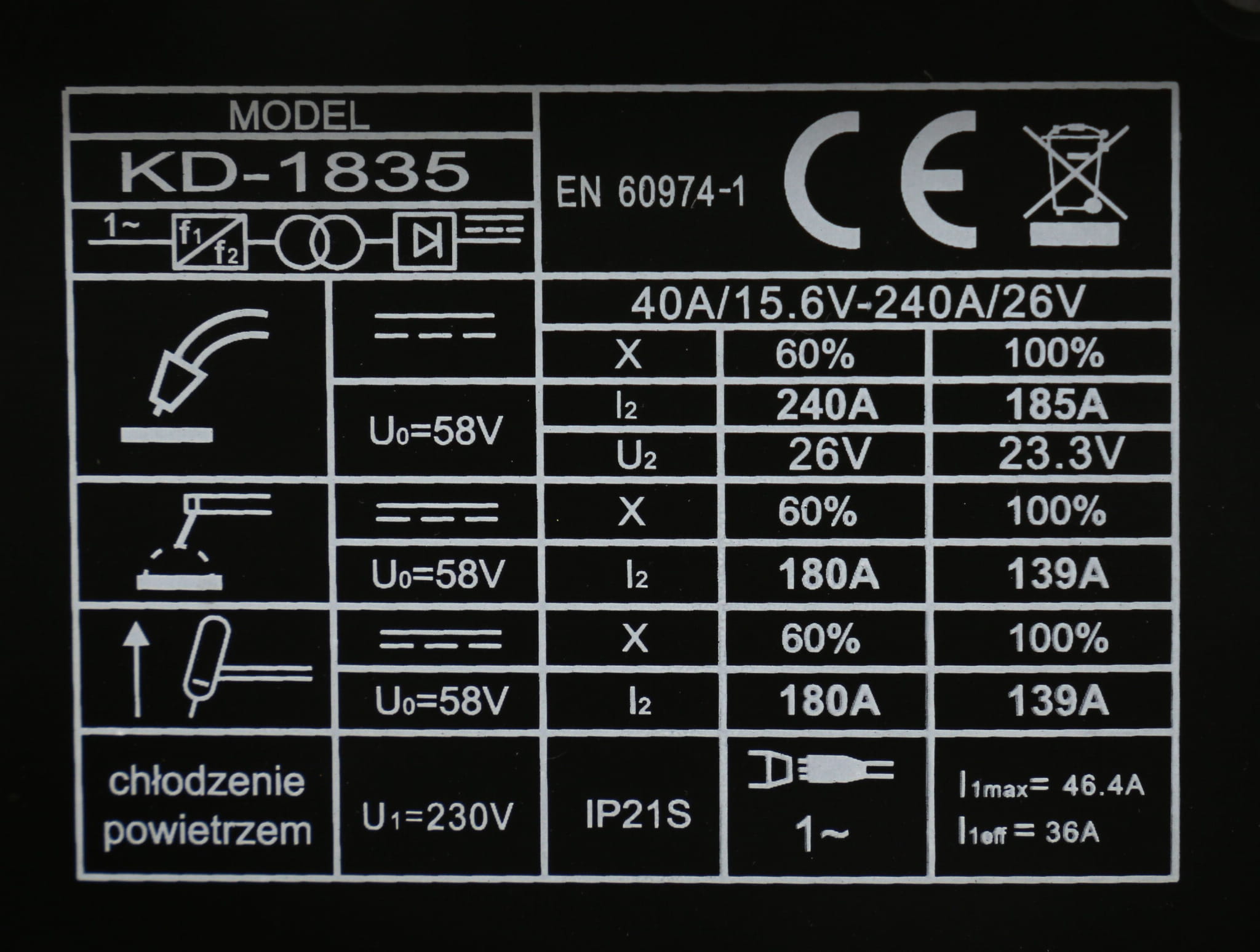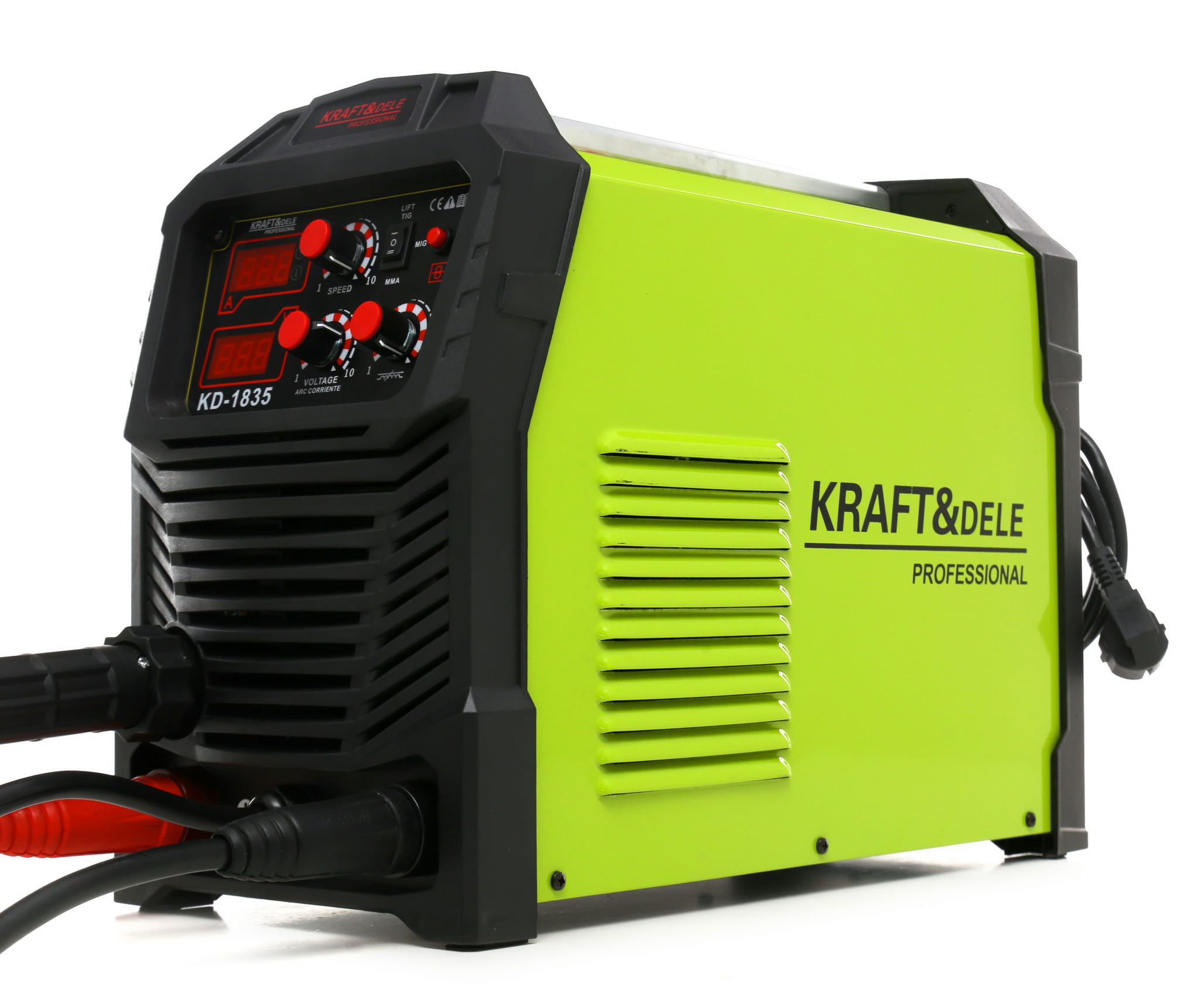 KD1835 to spawarka inwertorowa z technologią IGBT, obsługująca trzy metody spawania: MIG/MAG (z podajnikiem drutu), MMA (elektrodą otuloną) oraz TIG-Lift (spawanie wolframem z zajarzeniem przez dotyk). Urządzenie pracuje z jednofazowej sieci 230V, co umożliwia użytkowanie zarówno w warunkach warsztatowych, jak i terenowych.