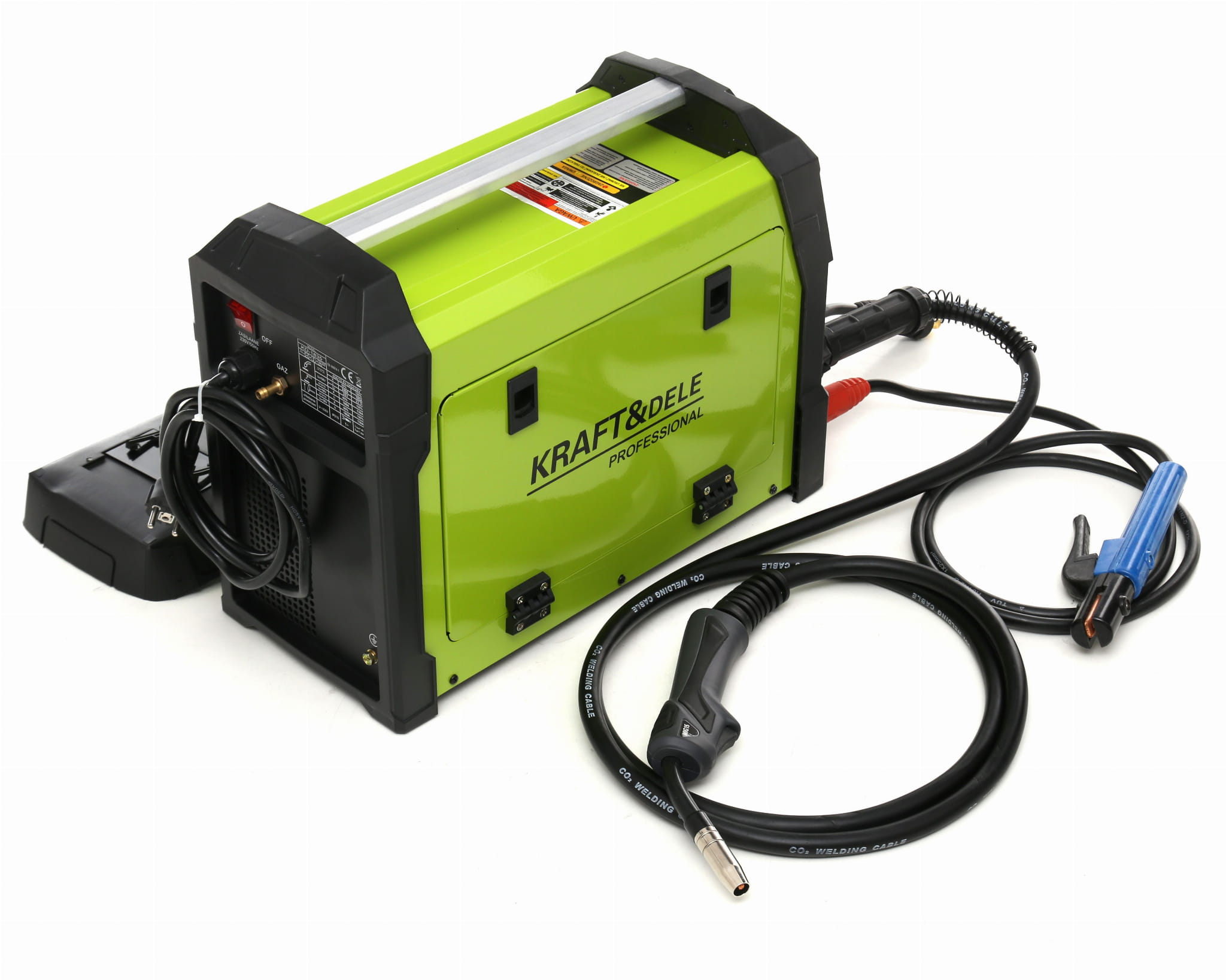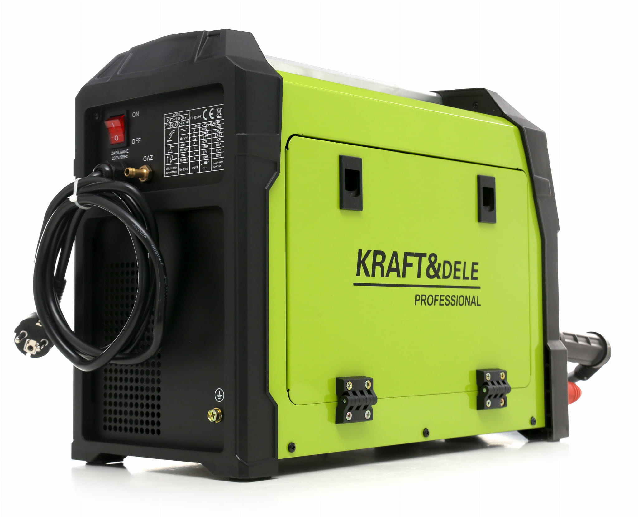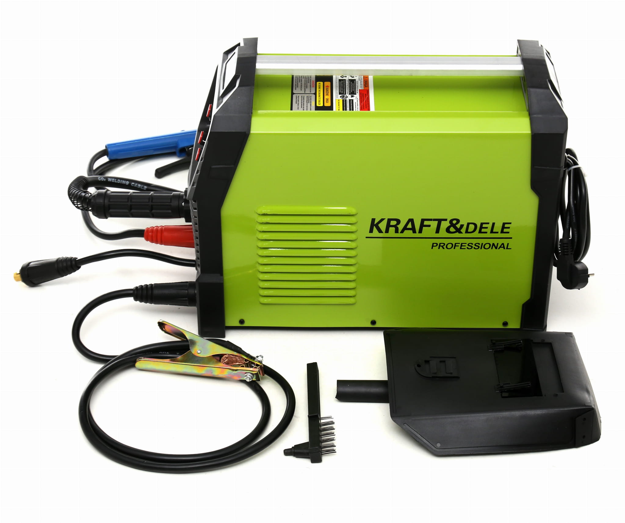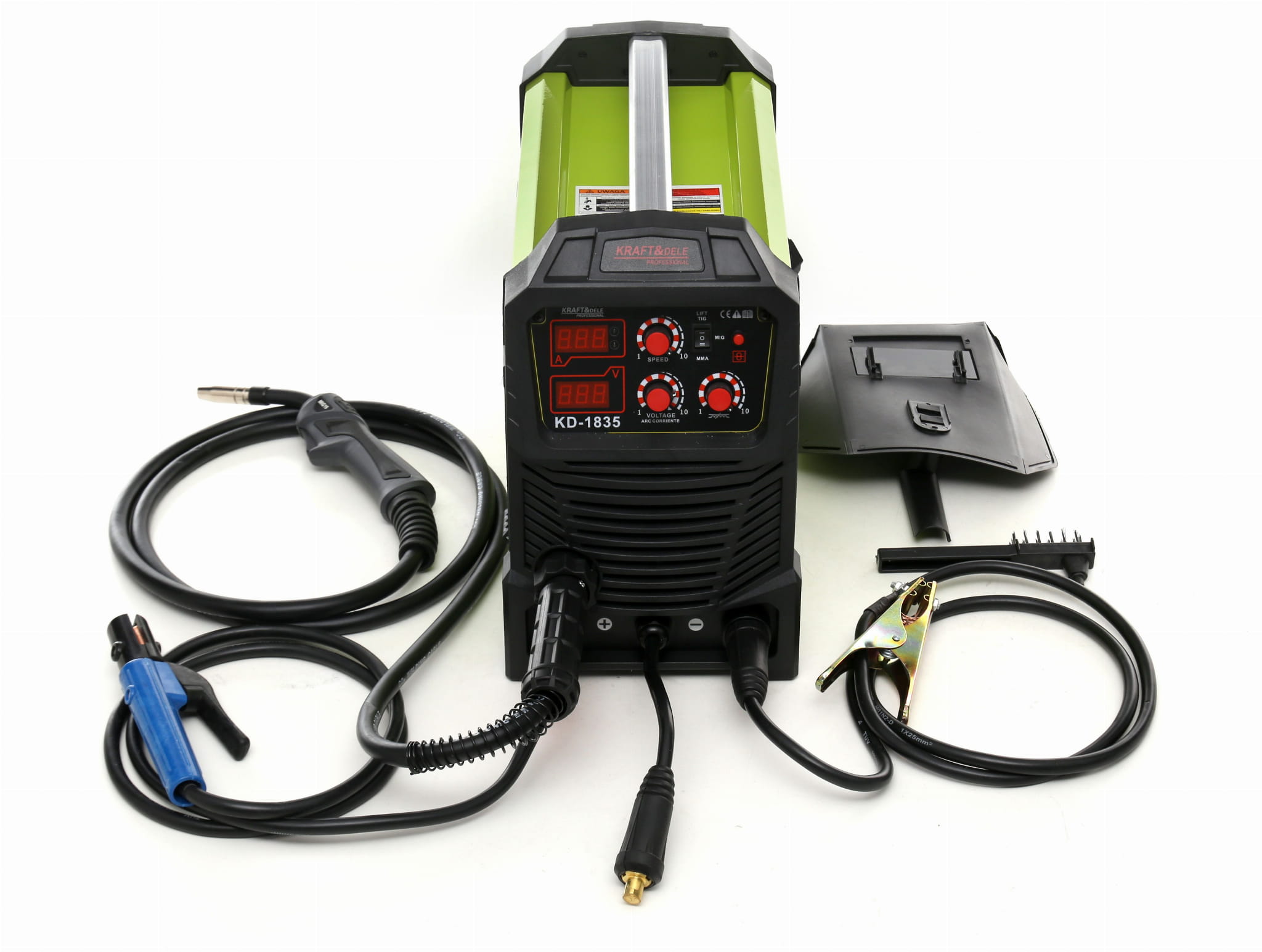 KD1835 to spawarka inwertorowa z technologią IGBT, obsługująca trzy metody spawania: MIG/MAG (z podajnikiem drutu), MMA (elektrodą otuloną) oraz TIG-Lift (spawanie wolframem z zajarzeniem przez dotyk). Urządzenie pracuje z jednofazowej sieci 230V, co umożliwia użytkowanie zarówno w warunkach warsztatowych, jak i terenowych.