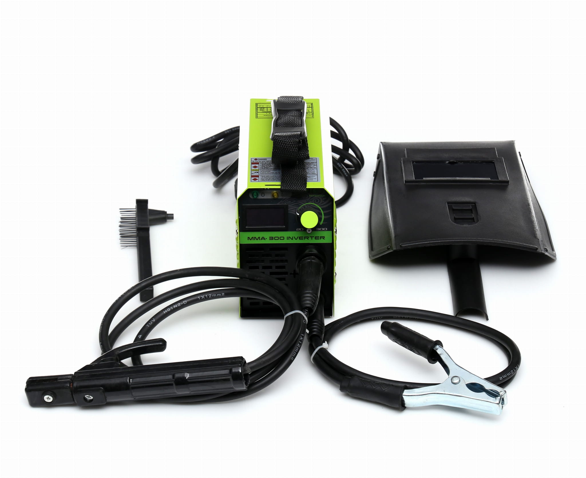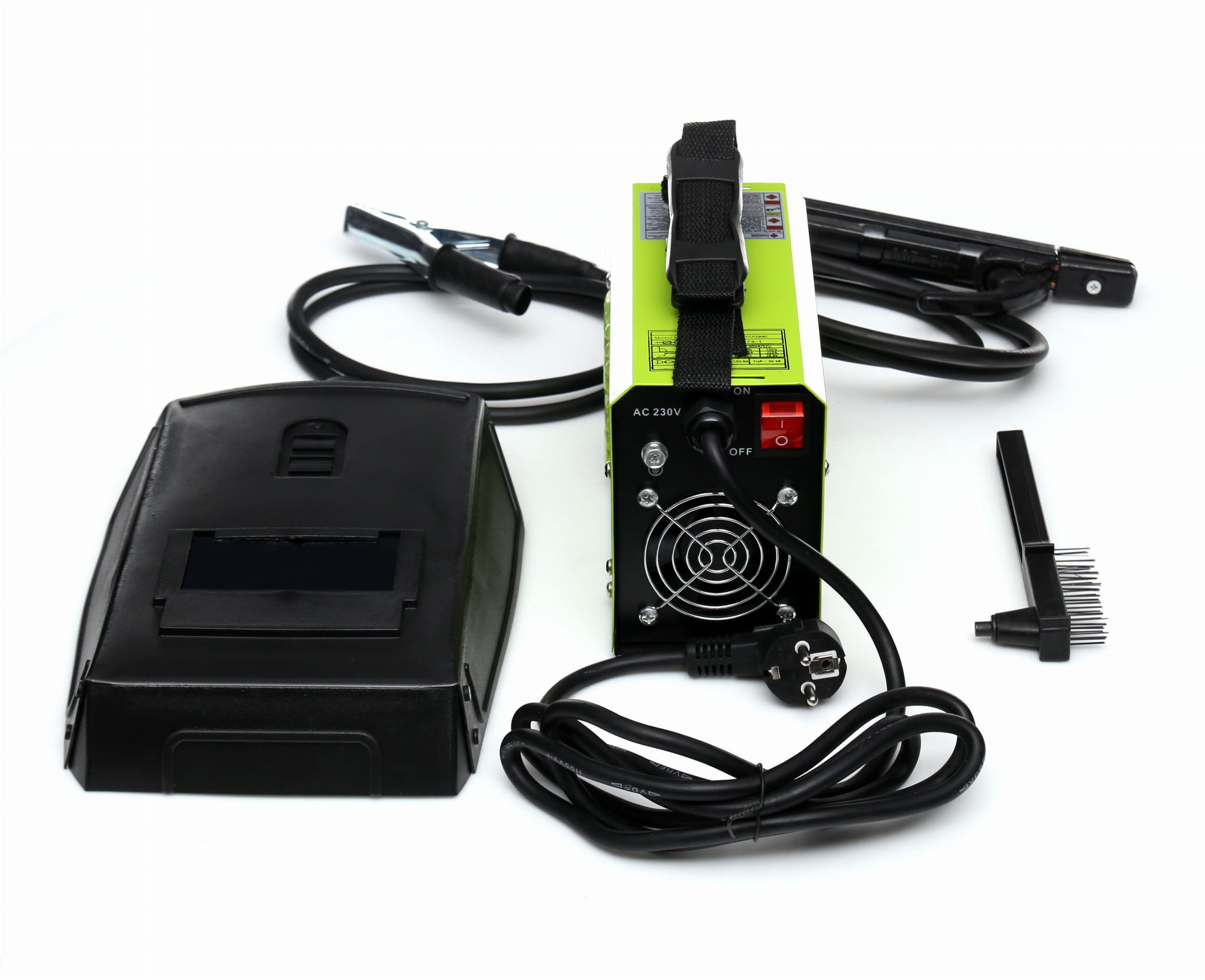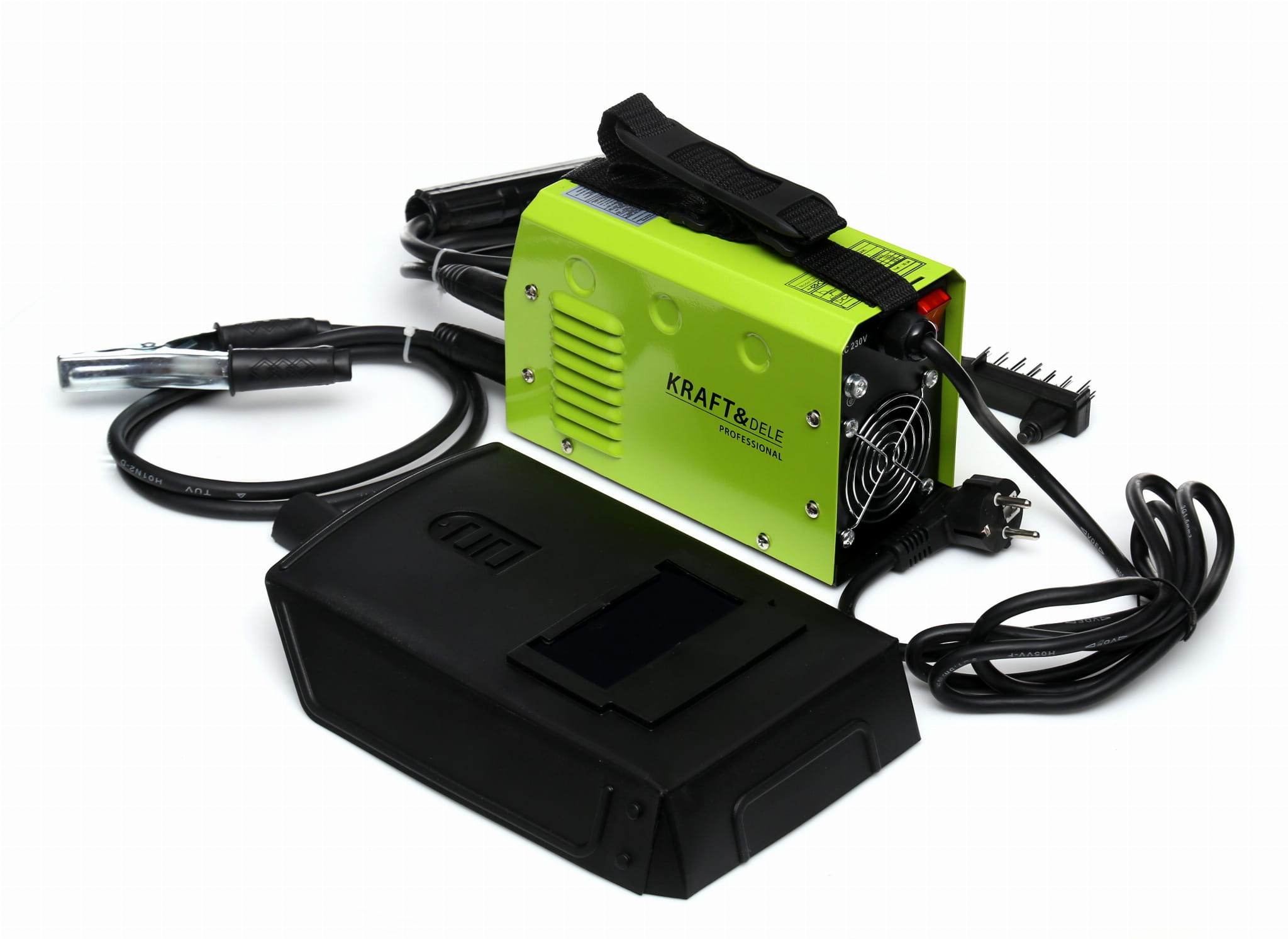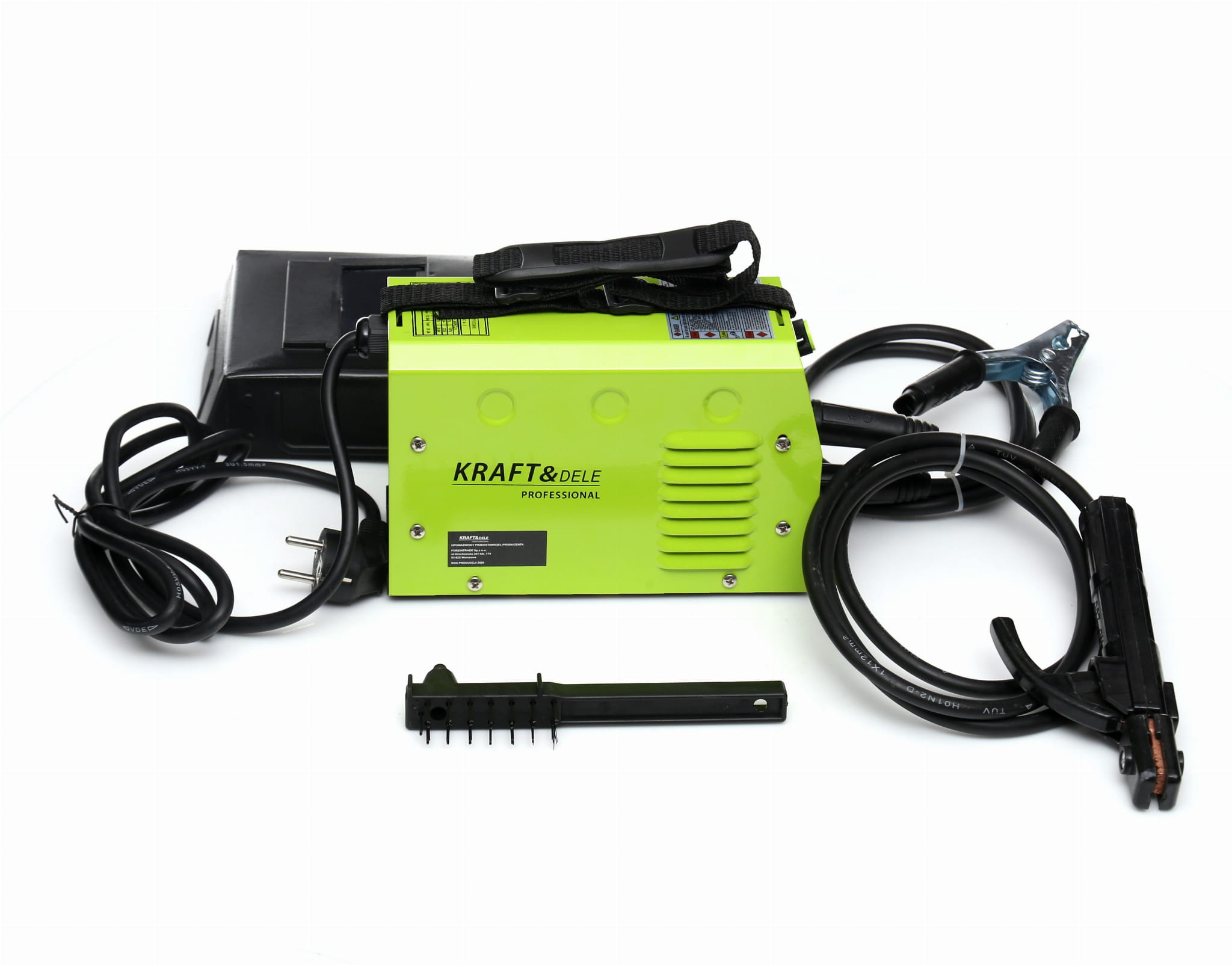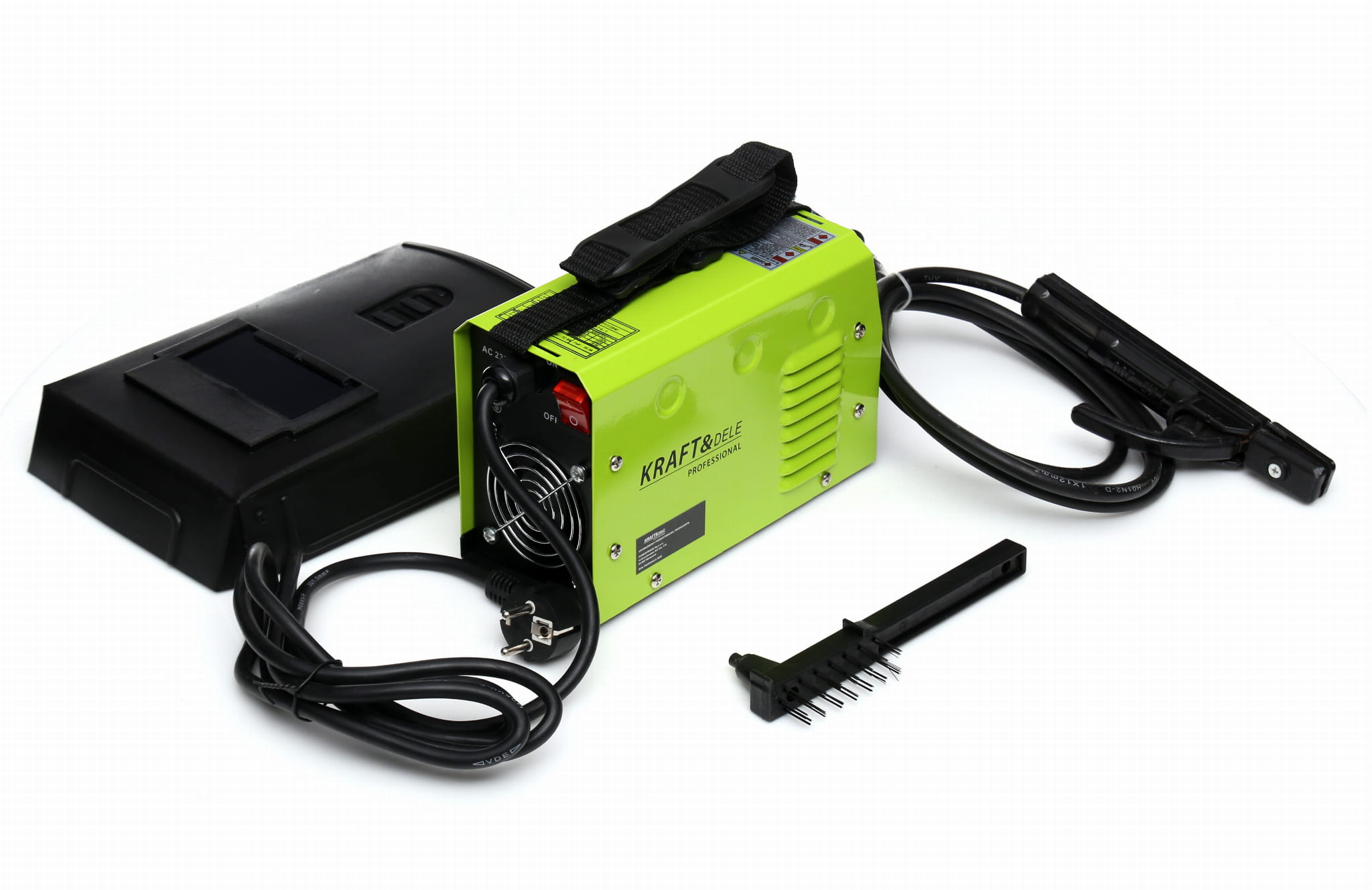 Spawarka inwertorowa MMA KD1862, przewód spawalniczy MMA DIN z uchwytem elektrody, przewód masowy DIN z zaciskiem, tarcza ochronna z szybą, młotek ze szczotką do żużla, instrukcja obsługi w języku polskim.