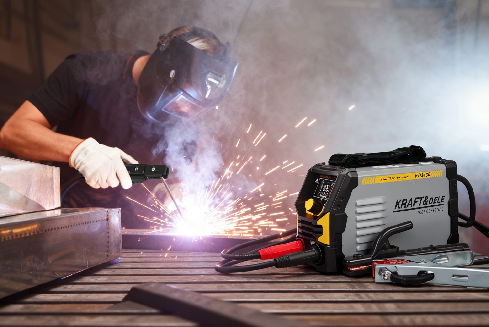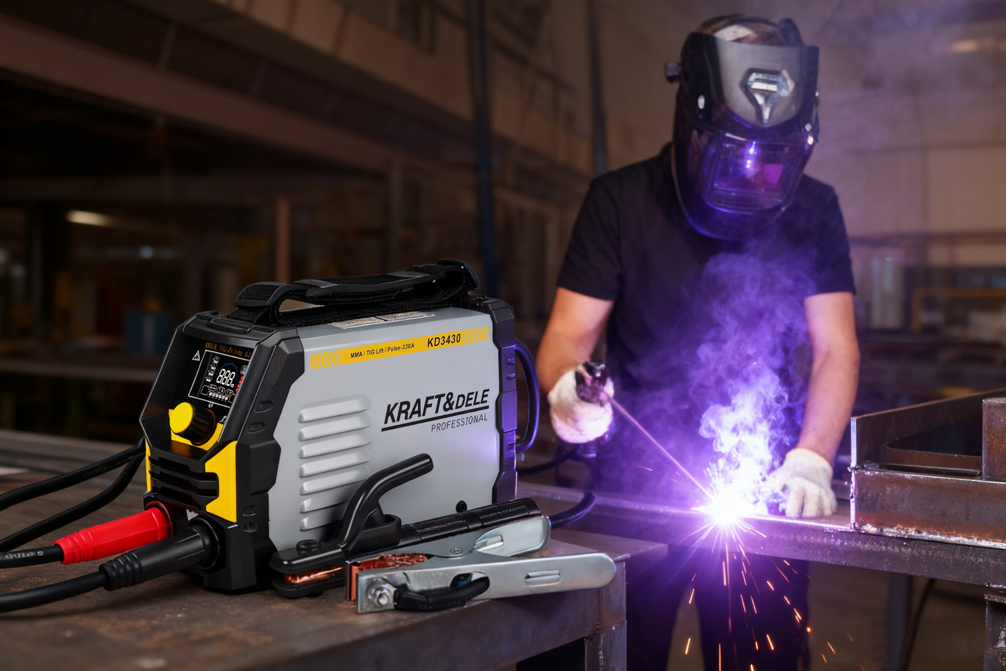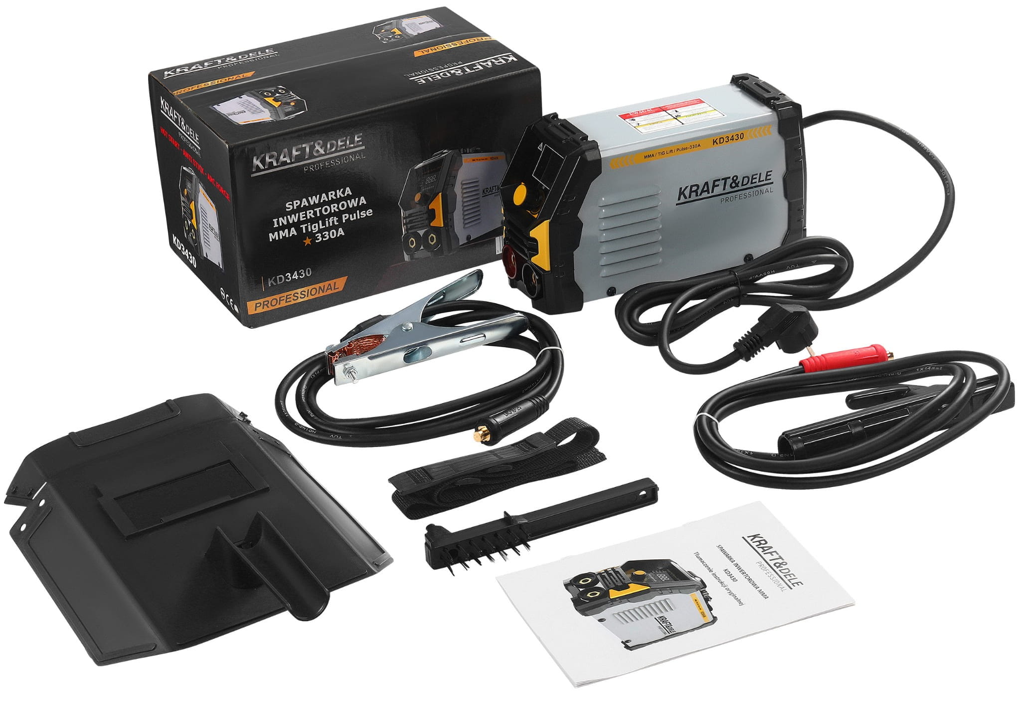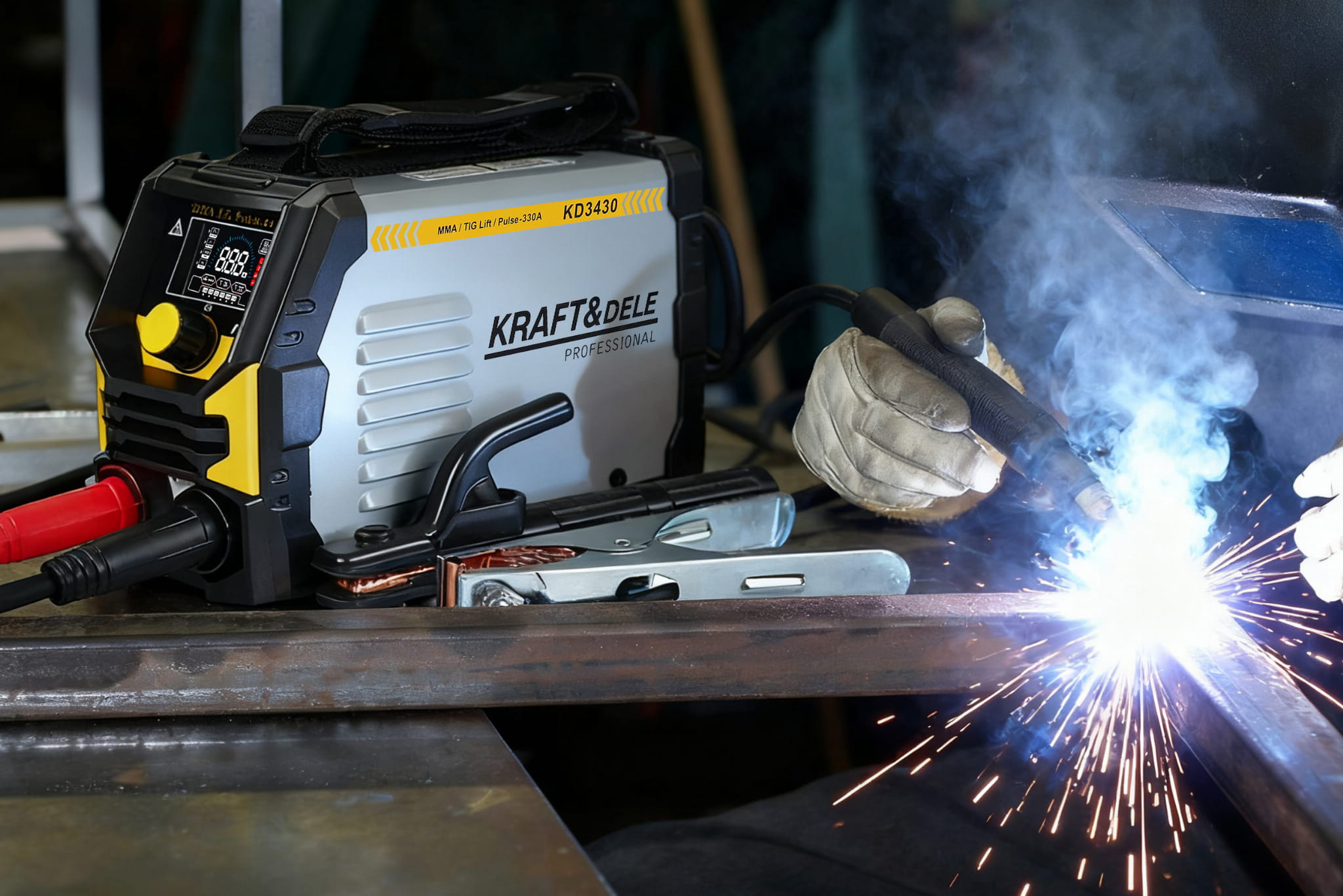 KD3430 to jednofazowa spawarka inwertorowa obsługująca trzy metody spawania: MMA (elektrodą otuloną), TIG Lift (spawanie wolframowe z zajarzeniem przez dotyk) oraz Pulse (spawanie pulsacyjne). Urządzenie zasilane napięciem 230V pracuje w zakresie prądu 20–330A i waży 3,7 kg, co pozwala na użytkowanie zarówno w warsztacie stacjonarnym, jak i na wyjeździe.