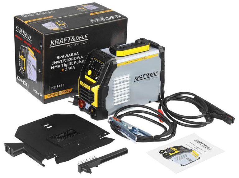 SPAWARKA INWERTOROWA MMA TigLift Pulse 340A KD3431 KRAFT&DELE (KD3431) to solidna, poręczna spawarka inwertorowa do prac MMA, Tig Lift oraz Pulse, zaprojektowana z myślą o wygodzie i stabilnej pracy. Jeśli szukasz urządzenia do warsztatu, domu lub na budowę, model KD3431 zapewnia szeroki zakres prądu, obsługę elektrod do 5 mm oraz zestaw akcesoriów do startu.