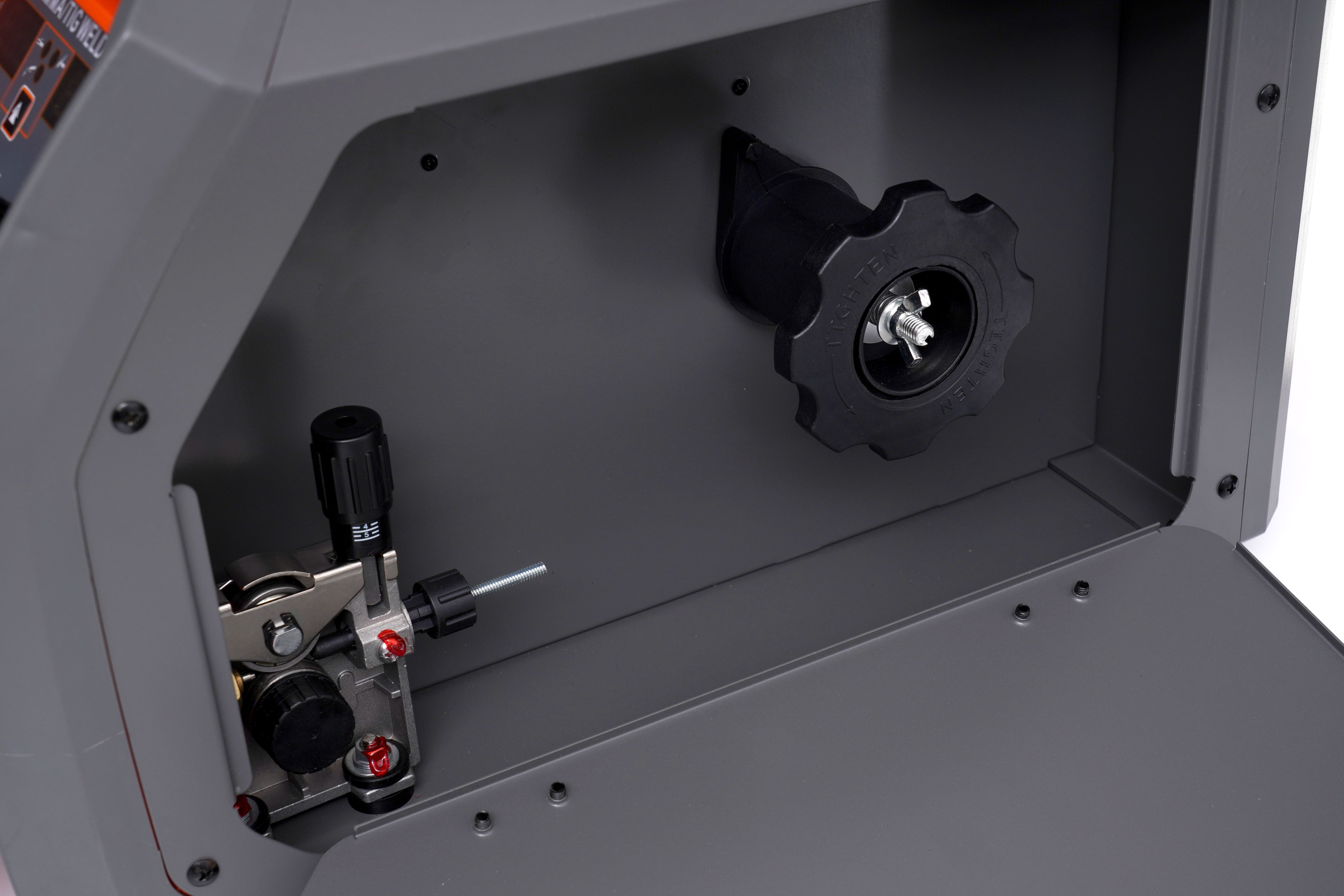 Potencjometr i podwójny wyświetlacz LCD ułatwiają ustawienie parametrów, co przekłada się na stabilniejsze spoiny i mniej poprawek.