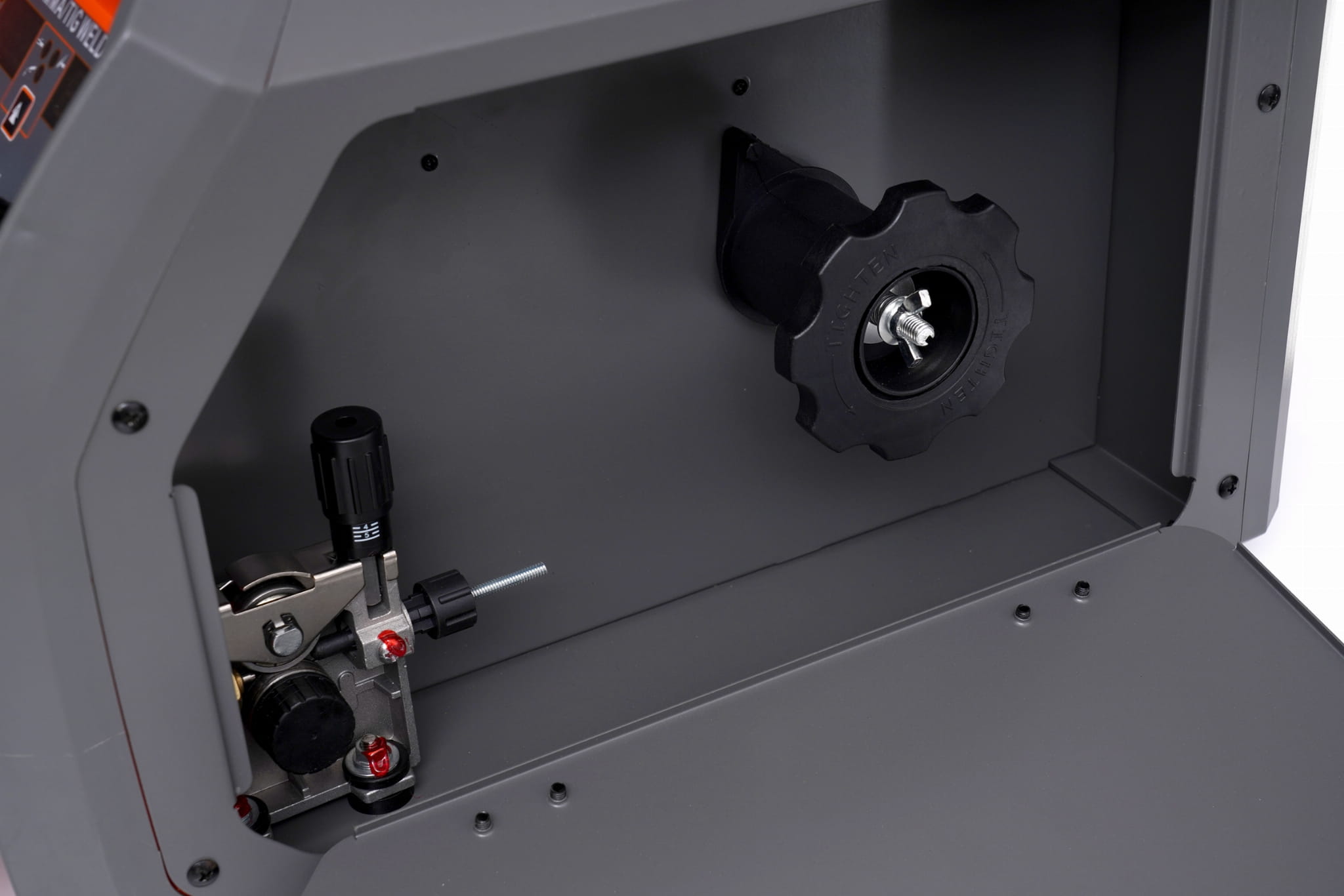 Wbudowany termostat monitoruje temperaturę pracy urządzenia i automatycznie ogranicza ryzyko przegrzania. Wentylator odprowadza ciepło podczas dłuższych sesji spawalniczych, co ma istotne znaczenie przy pracy ciągłej w wyższych zakresach prądu.