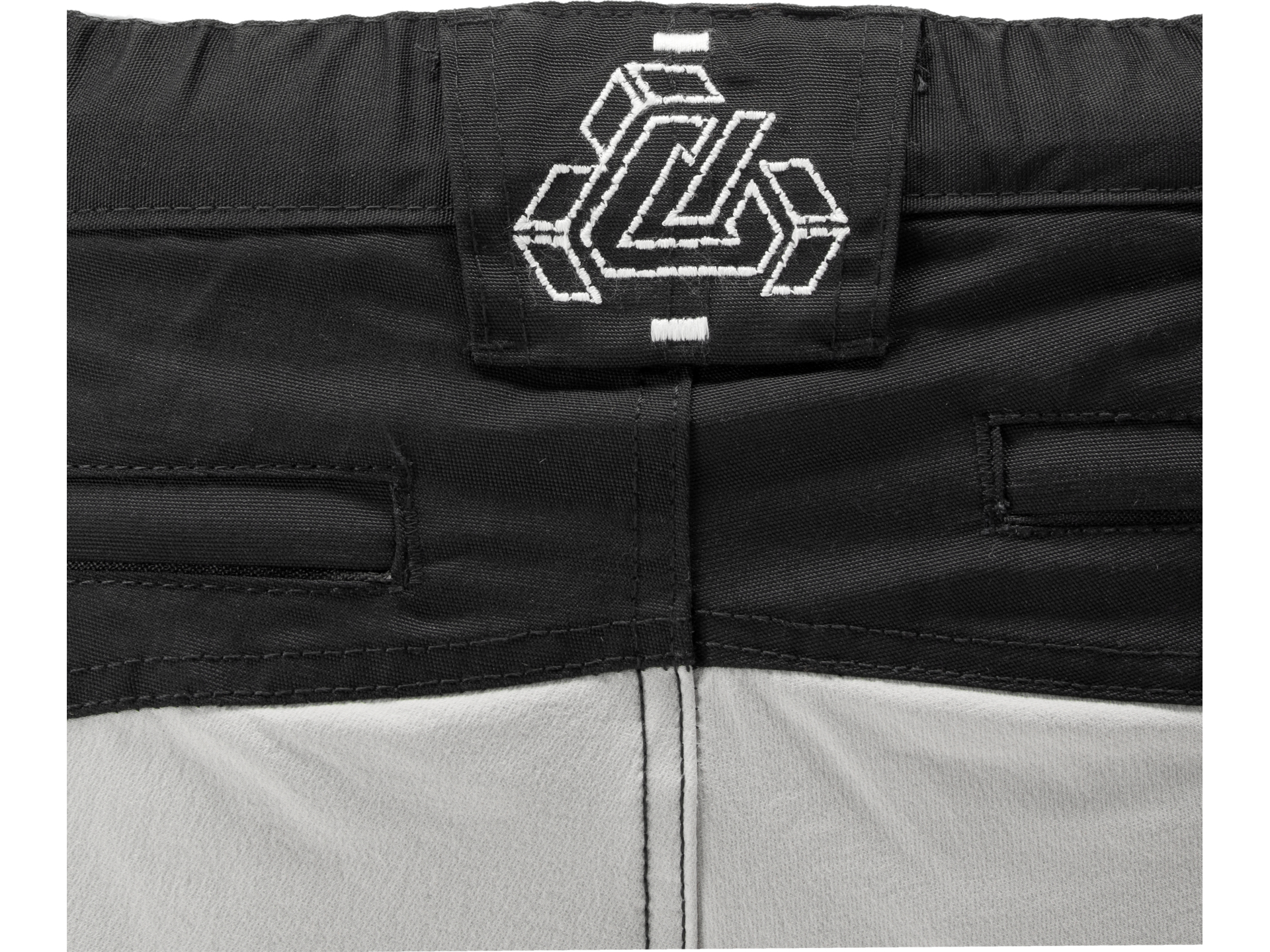 Wbudowane guziki na zatrzaski umożliwiają skrócenie nogawki o około 4 cm bez konieczności szycia. Funkcja pozwala dostosować spodnie do wzrostu użytkownika i zapobiega nadmiernemu zużyciu dolnej części nogawek podczas kontaktu z podłożem.