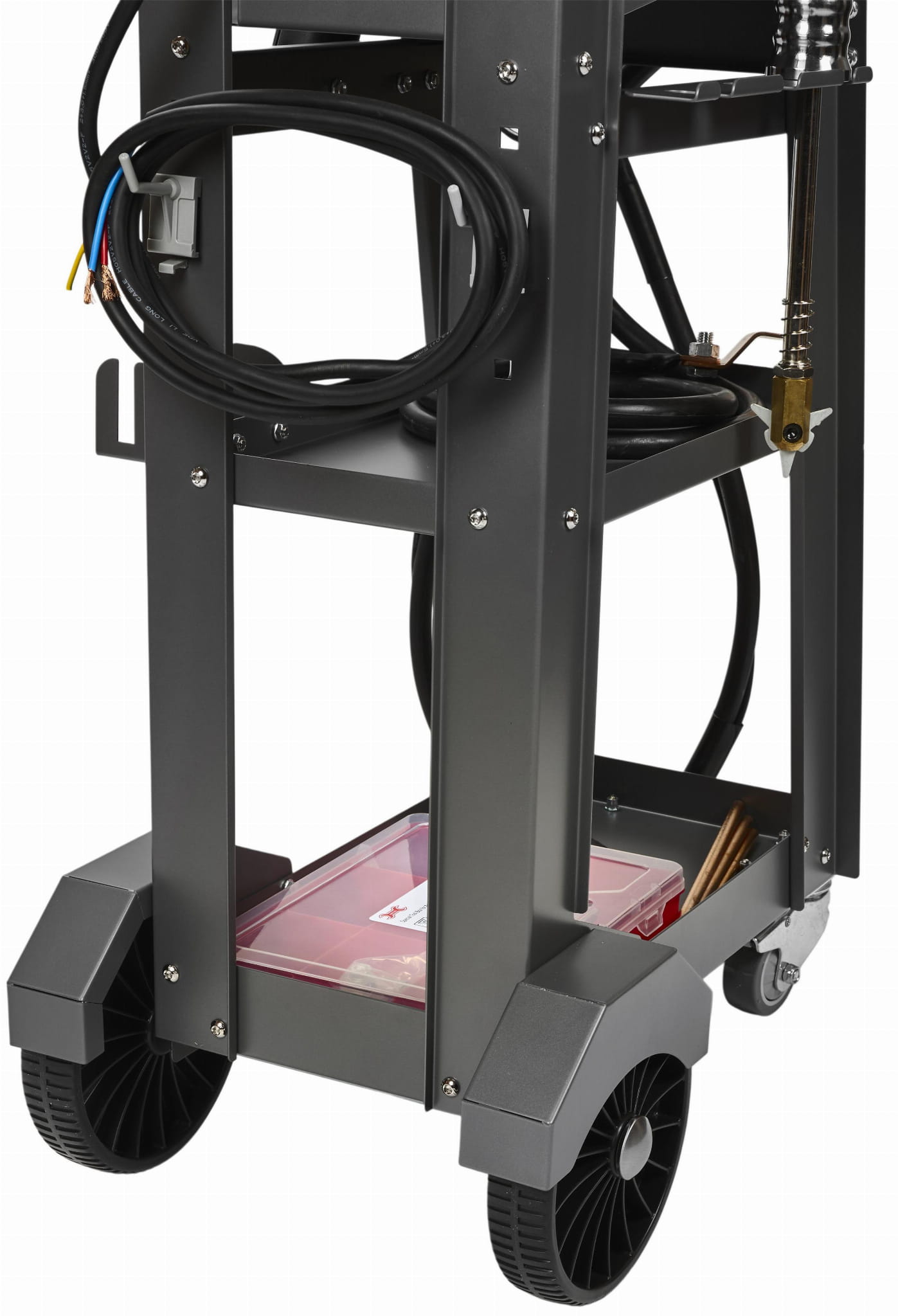 Wózek z czterema kołami — dwoma skrętnymi wyposażonymi w hamulec — umożliwia swobodne przemieszczanie zestawu po warsztacie i pewne zablokowanie w wybranym miejscu pracy. Przyssawka próżniowa o udźwigu 190 kg pozwala na mocowanie i prostowanie elementów karoserii bez konieczności spawania uchwytów.