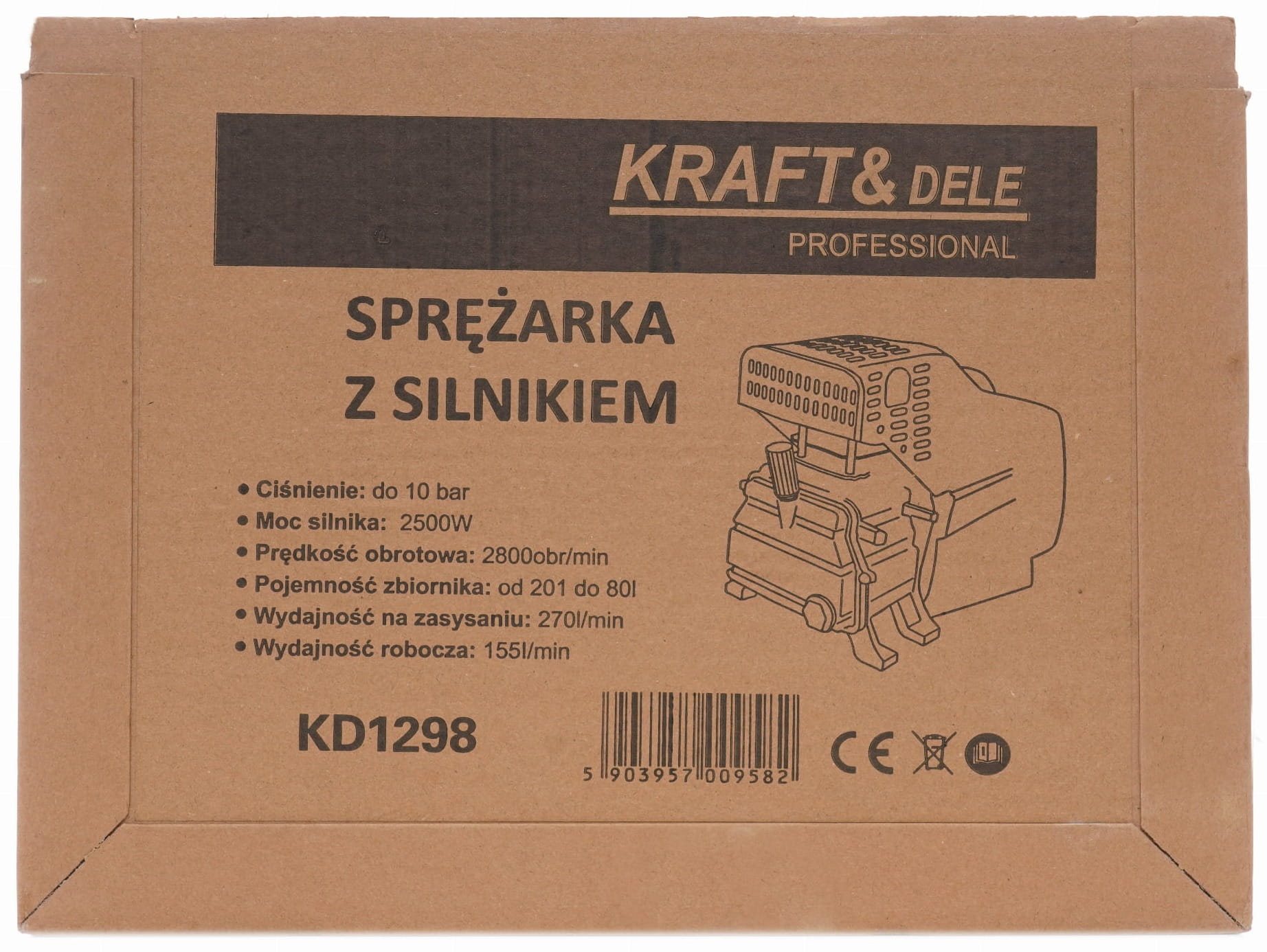 KD1298 to elektryczna sprężarka powietrza marki KRAFT&DELE przeznaczona do zastosowań domowych, warsztatowych i lekko przemysłowych. Urządzenie pracuje z silnikiem o mocy 2500 W, osiągając wydajność zasysania 270 L/min przy maksymalnym ciśnieniu roboczym 10 bar. Sprężarka współpracuje ze zbiornikami o pojemności od 20 do 80 litrów i waży 14 kg, co ułatwia jej przemieszczanie między stanowiskami pracy.