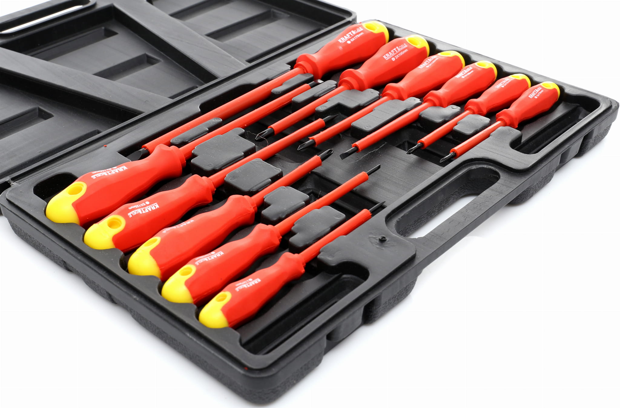 Śrubokręty izolowane przeznaczone do pracy pod napięciem powinny posiadać certyfikację zgodną z normą VDE (IEC 60900) oraz oznaczenie 1000 V. Przed użyciem przy elementach pod napięciem należy zawsze sprawdzić stan izolacji — brak uszkodzeń mechanicznych rękojeści i trzpienia jest warunkiem bezpiecznej pracy. Niniejszy zestaw KD10333 jest przeznaczony do prac elektrycznych — przed zastosowaniem przy napięciach powyżej bezpiecznego poziomu należy zweryfikować zakres certyfikacji producenta.