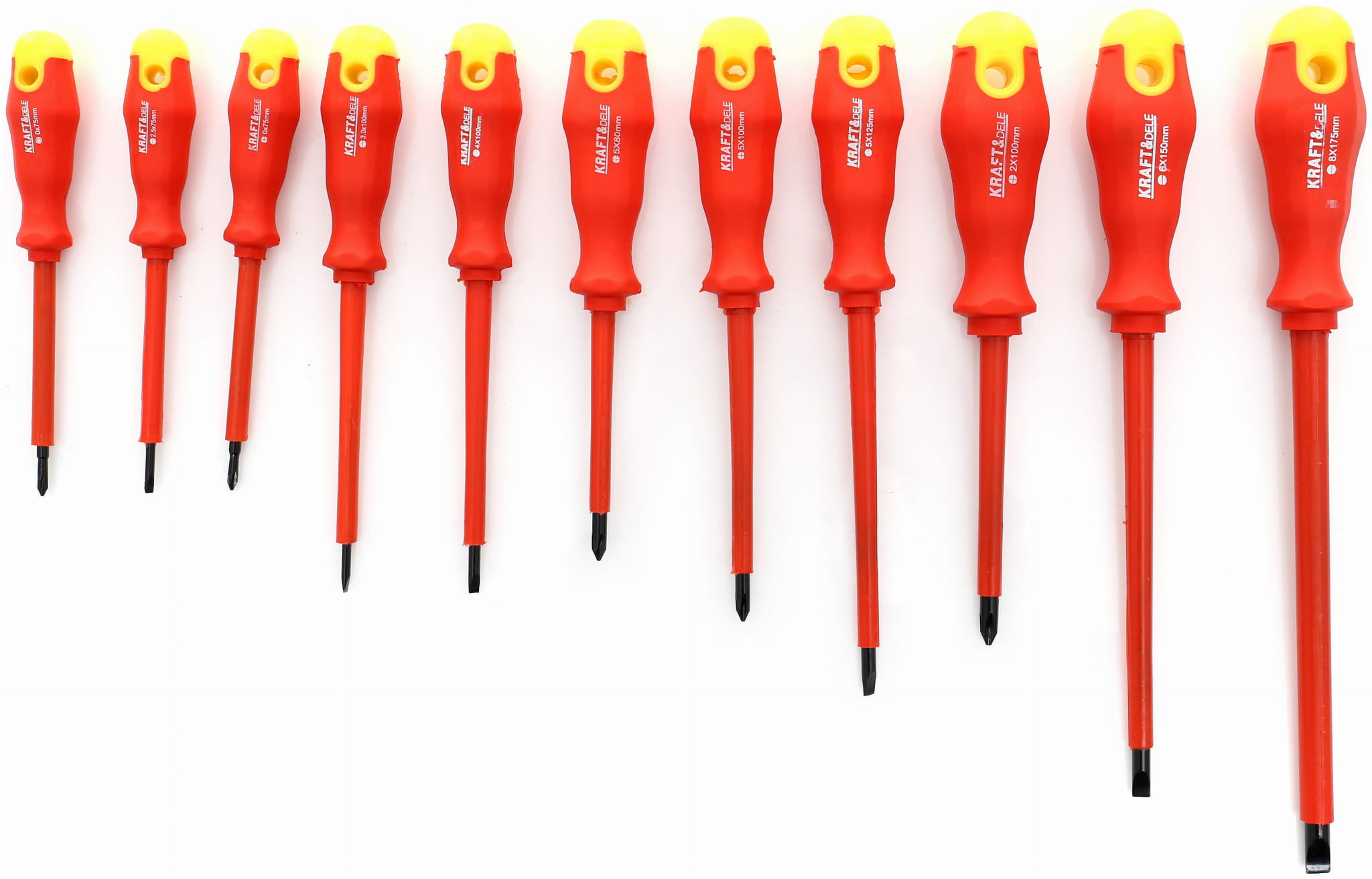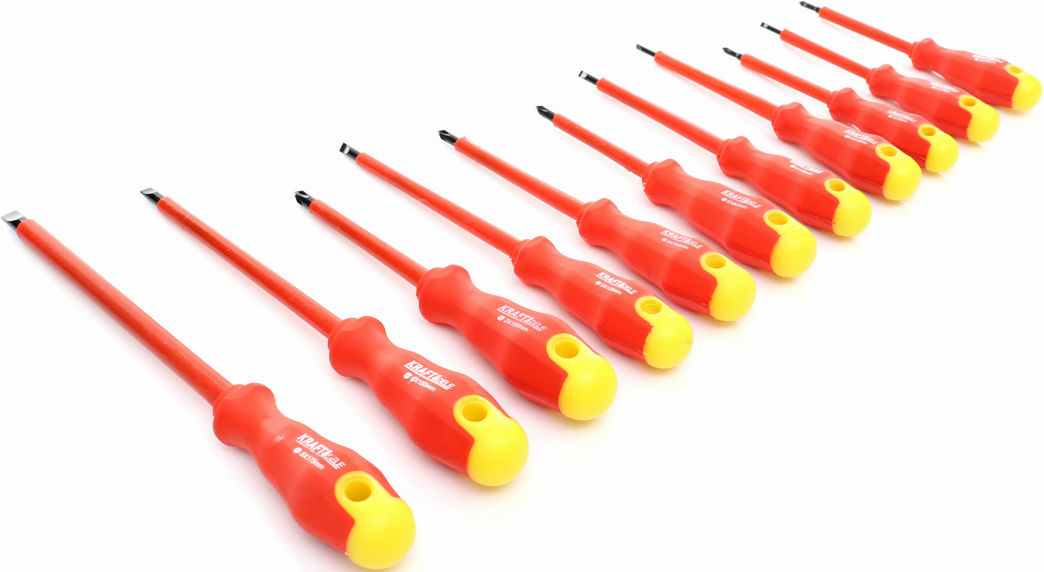 Zestaw 11 izolowanych śrubokrętów obejmujący trzy typy grotów — płaskie, krzyżowe PH oraz PZ — przeznaczony do prac przy instalacjach elektrycznych oraz ogólnych prac montażowych i serwisowych. Izolacja chroni użytkownika podczas kontaktu z elementami pod napięciem, a satynowe wykończenie grotów ogranicza ryzyko korozji przy długotrwałym użytkowaniu.