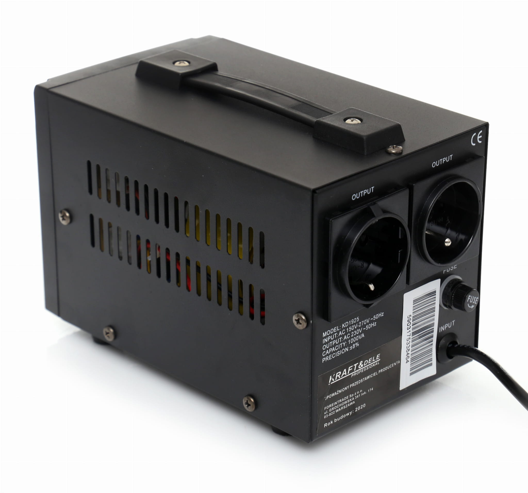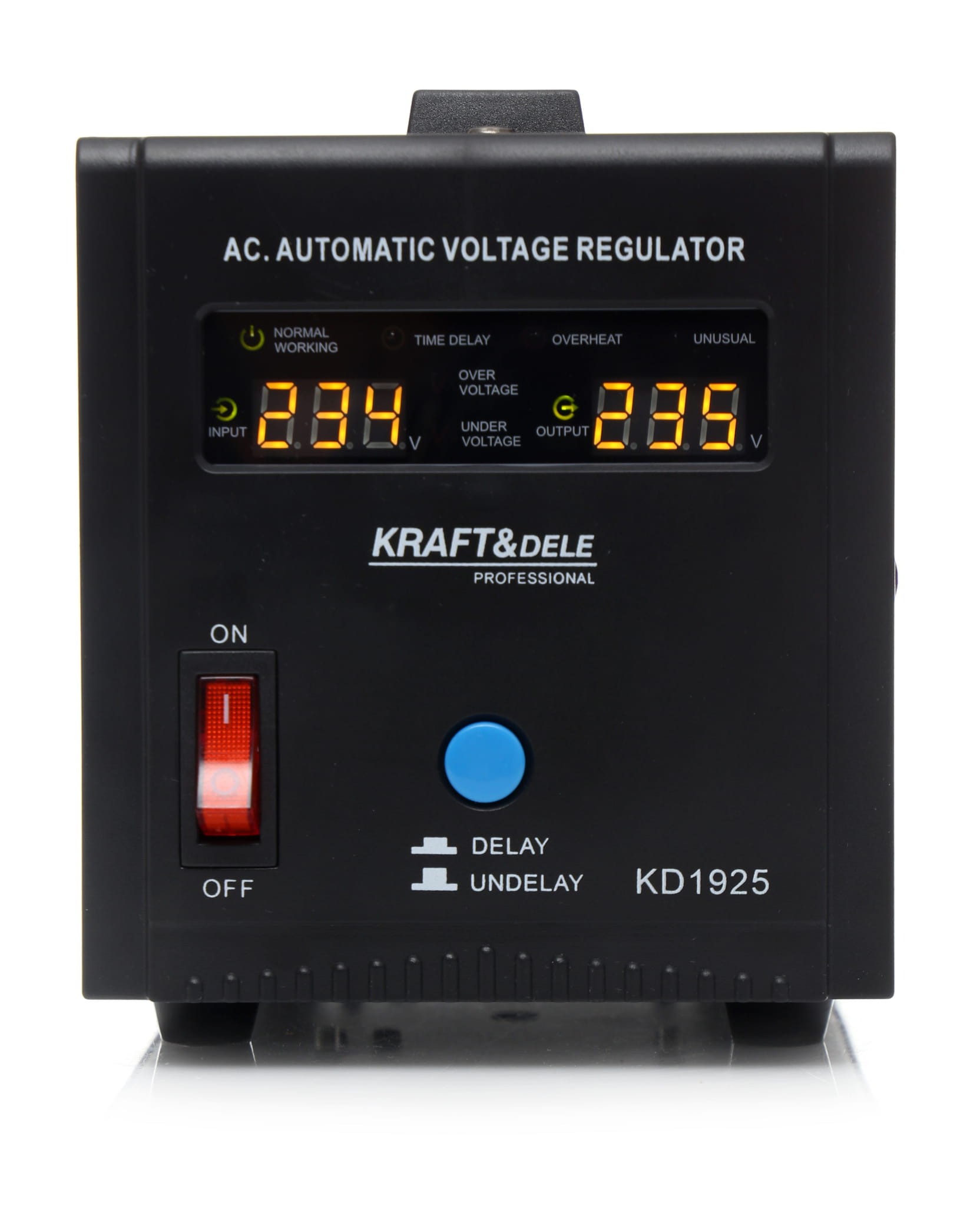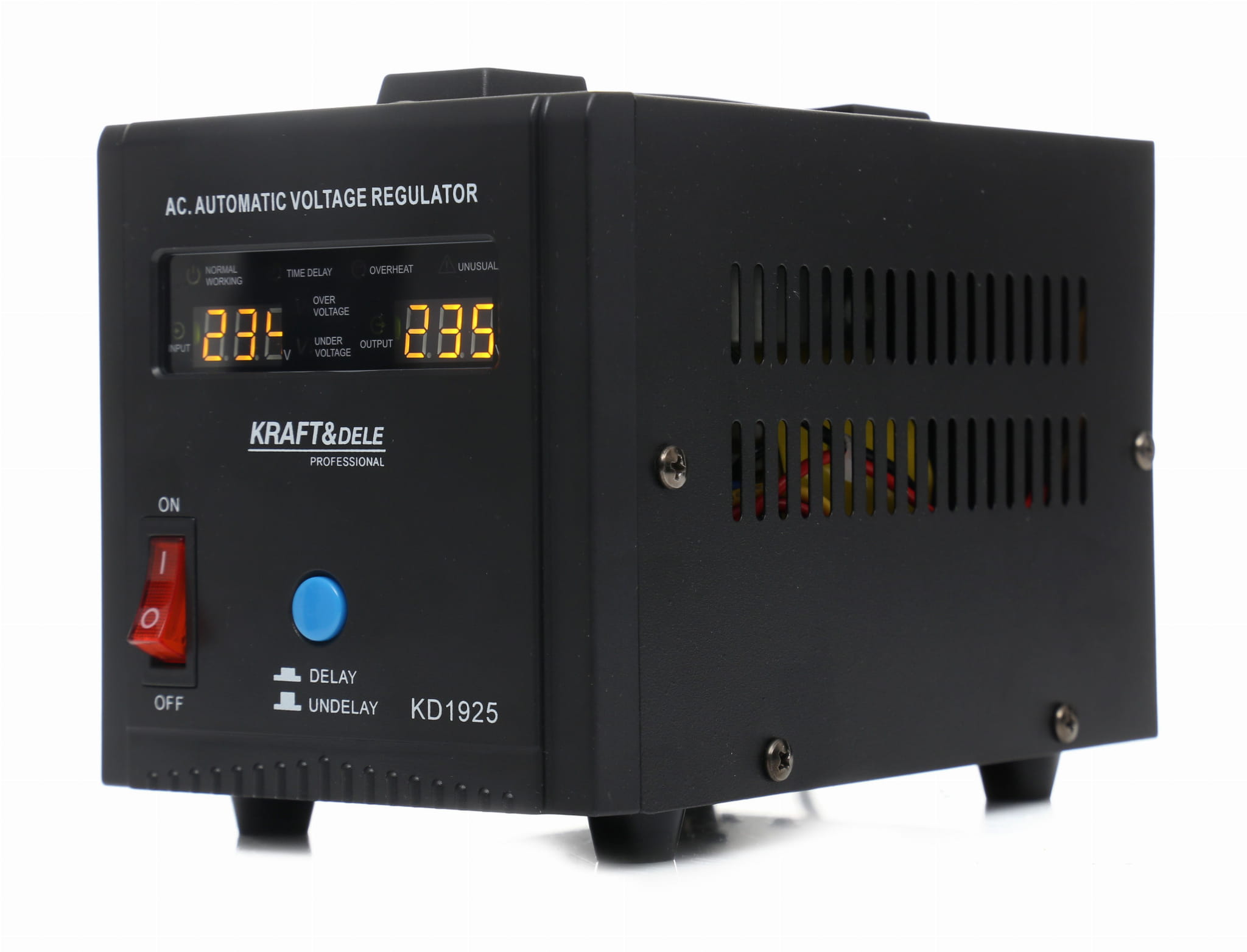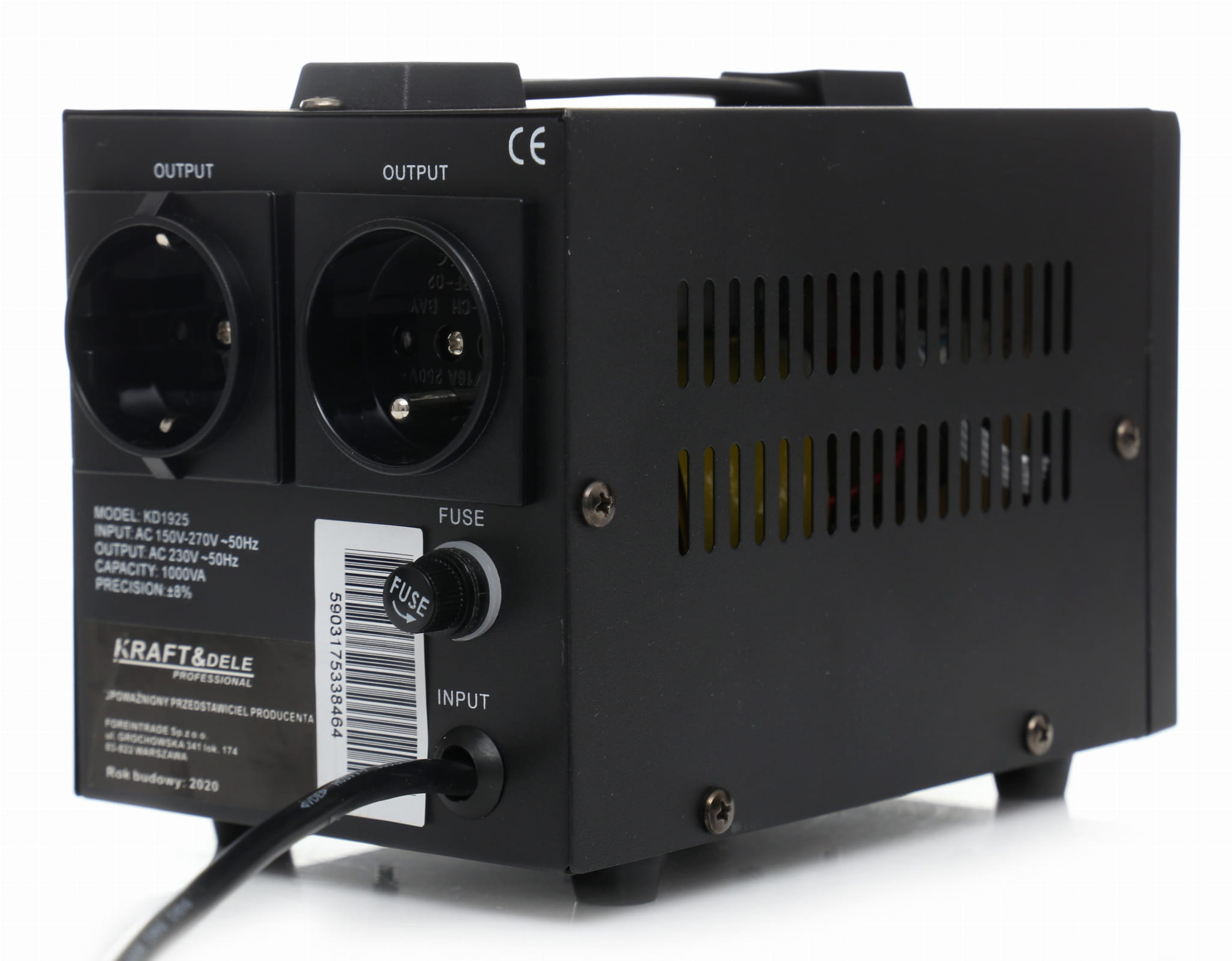 Stabilizator napięcia KD1925 to urządzenie przeznaczone do wyrównywania wahań napięcia sieciowego i ochrony podłączonych odbiorników elektrycznych. Akceptuje szeroki zakres napięcia wejściowego — od 150 V do 270 V — i utrzymuje stabilne wyjście 230 V przy częstotliwości 50 Hz.