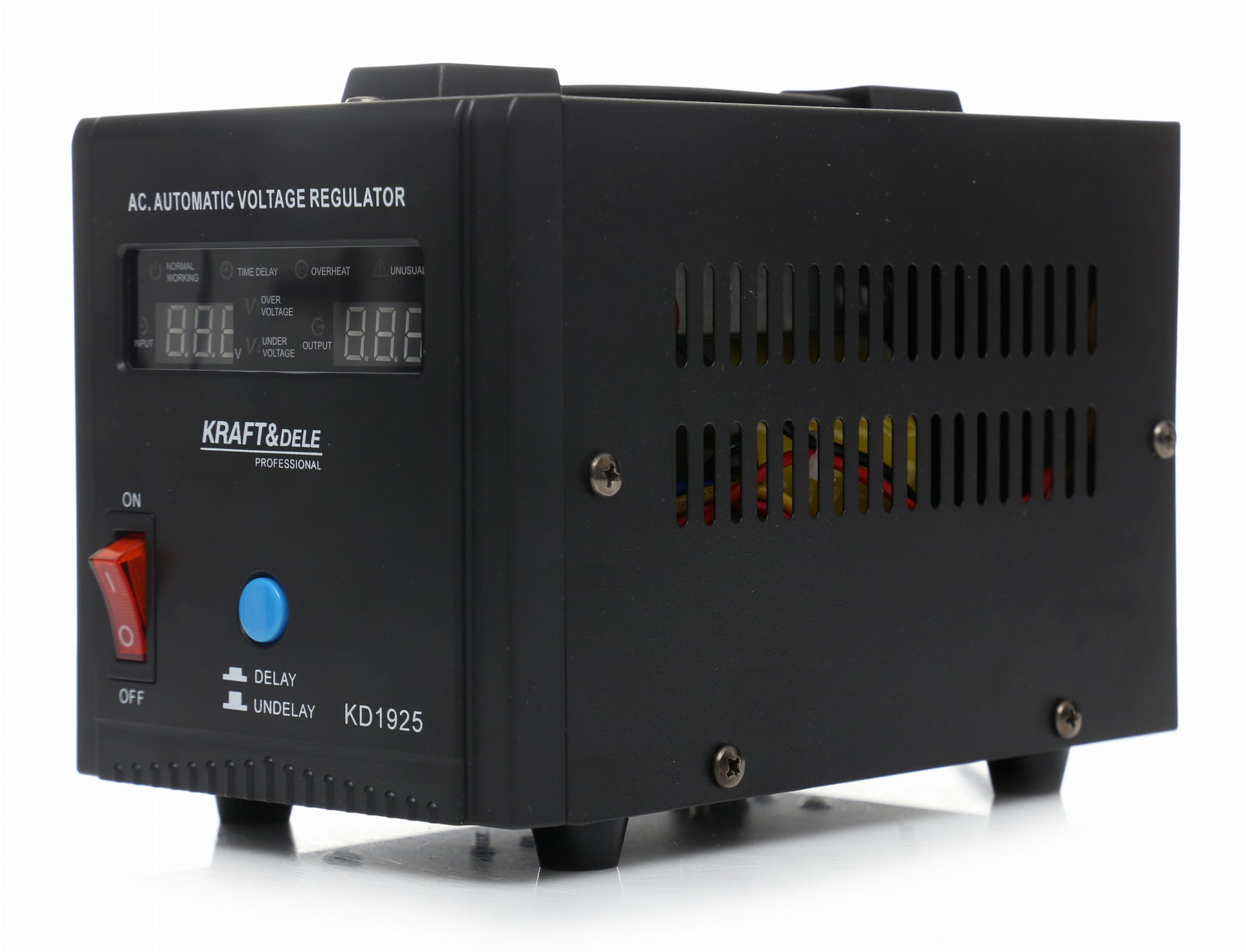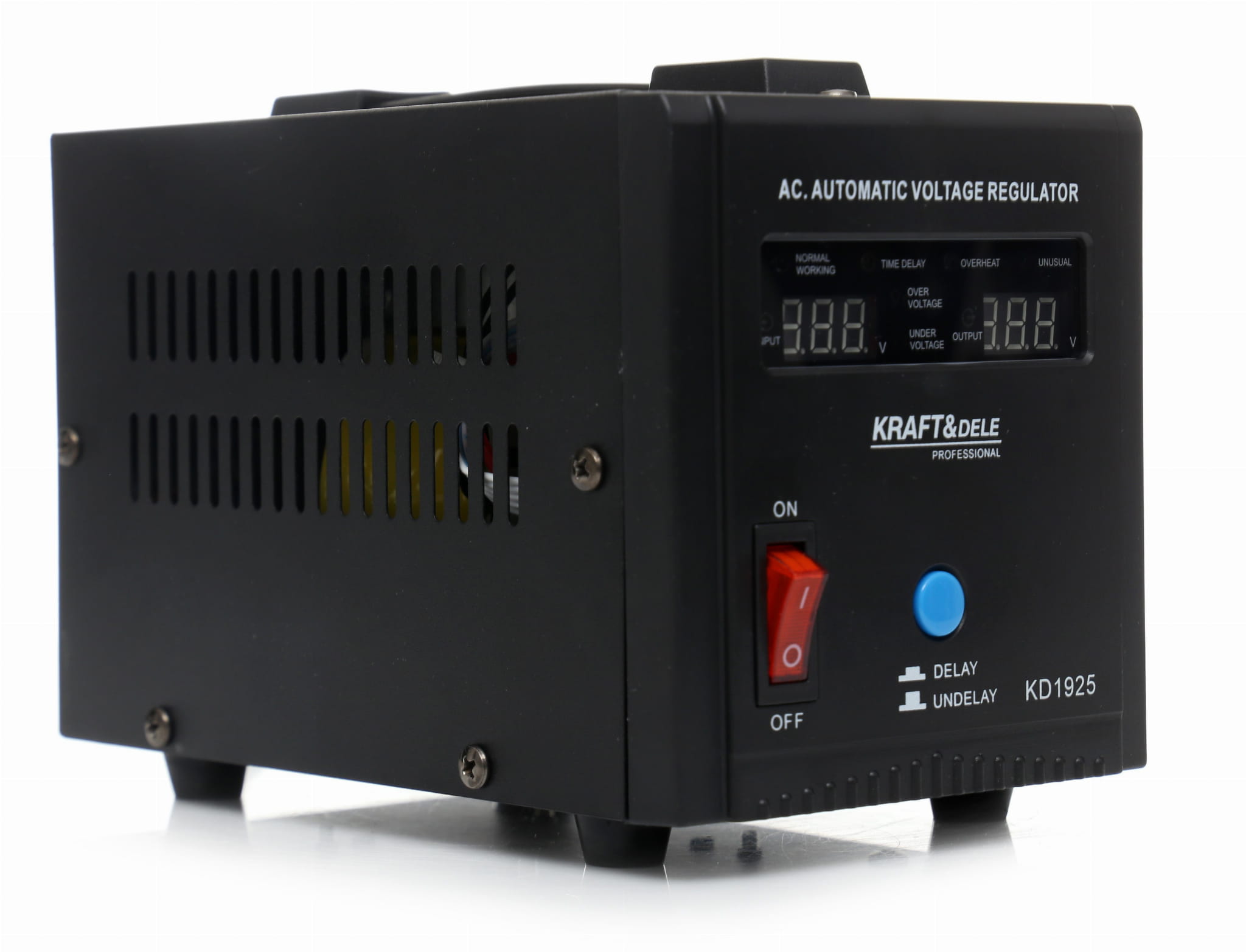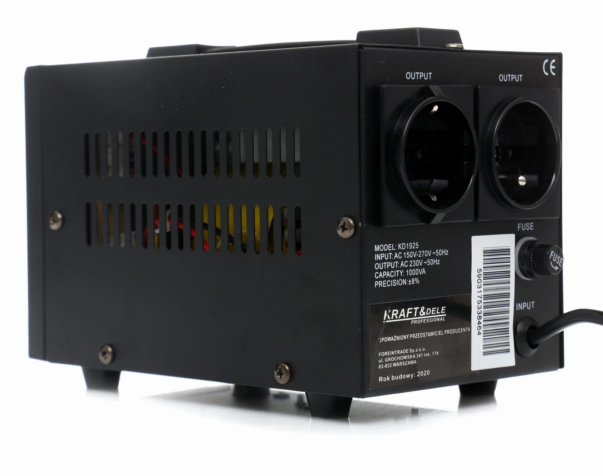 Stabilizator napięcia KD1925 to urządzenie przeznaczone do wyrównywania wahań napięcia sieciowego i ochrony podłączonych odbiorników elektrycznych. Akceptuje szeroki zakres napięcia wejściowego — od 150 V do 270 V — i utrzymuje stabilne wyjście 230 V przy częstotliwości 50 Hz.