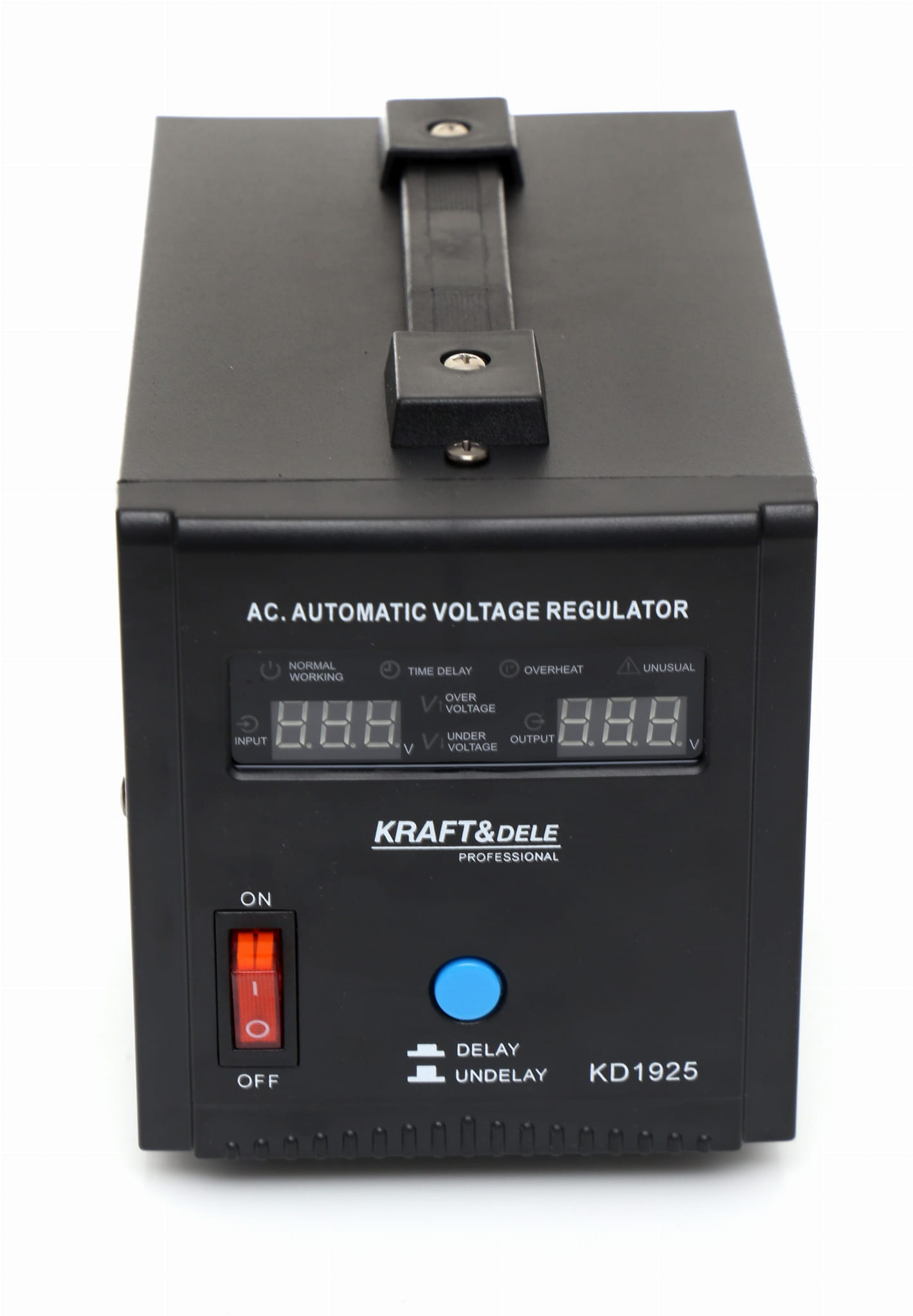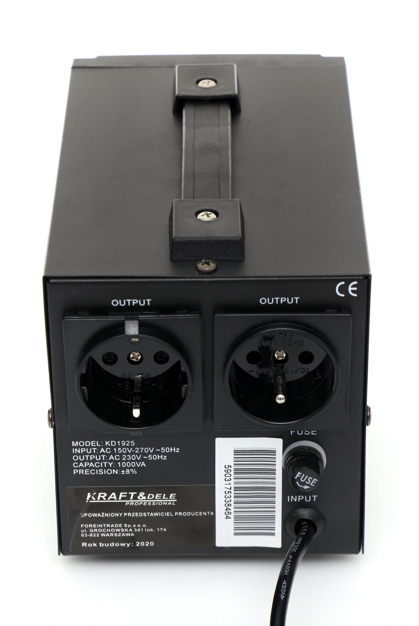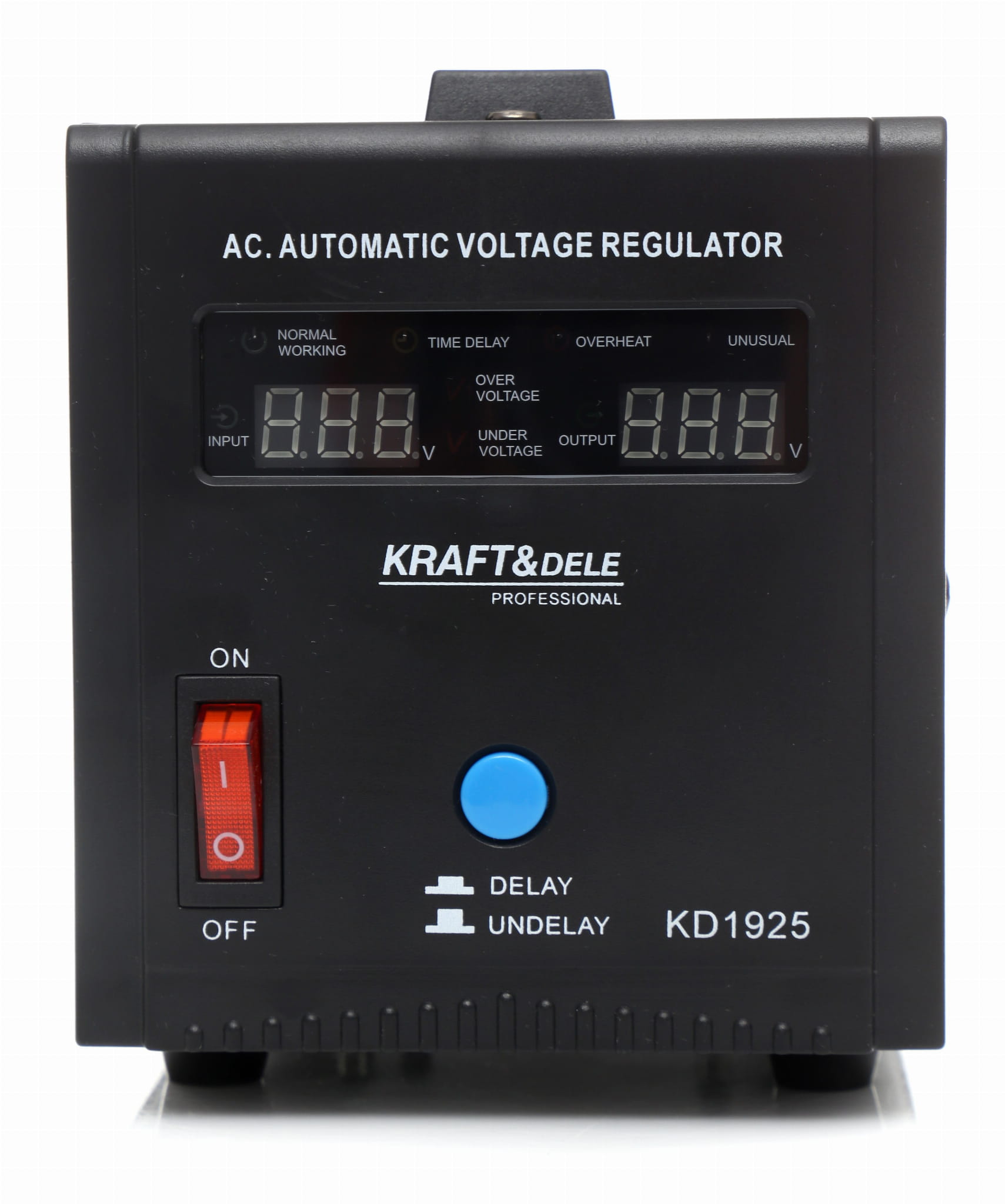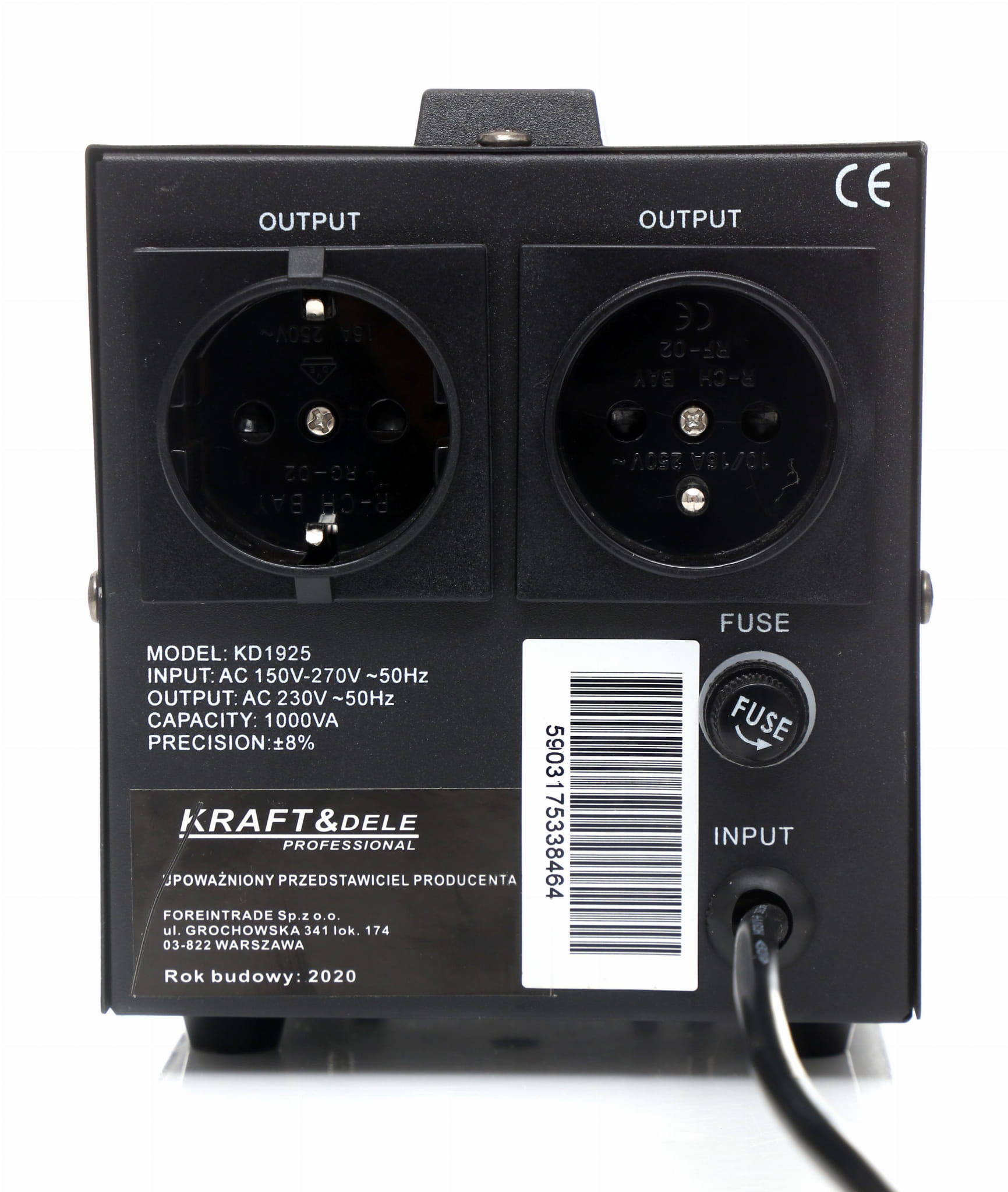 Stabilizator napięcia KD1925 to urządzenie przeznaczone do wyrównywania wahań napięcia sieciowego i ochrony podłączonych odbiorników elektrycznych. Akceptuje szeroki zakres napięcia wejściowego — od 150 V do 270 V — i utrzymuje stabilne wyjście 230 V przy częstotliwości 50 Hz.
