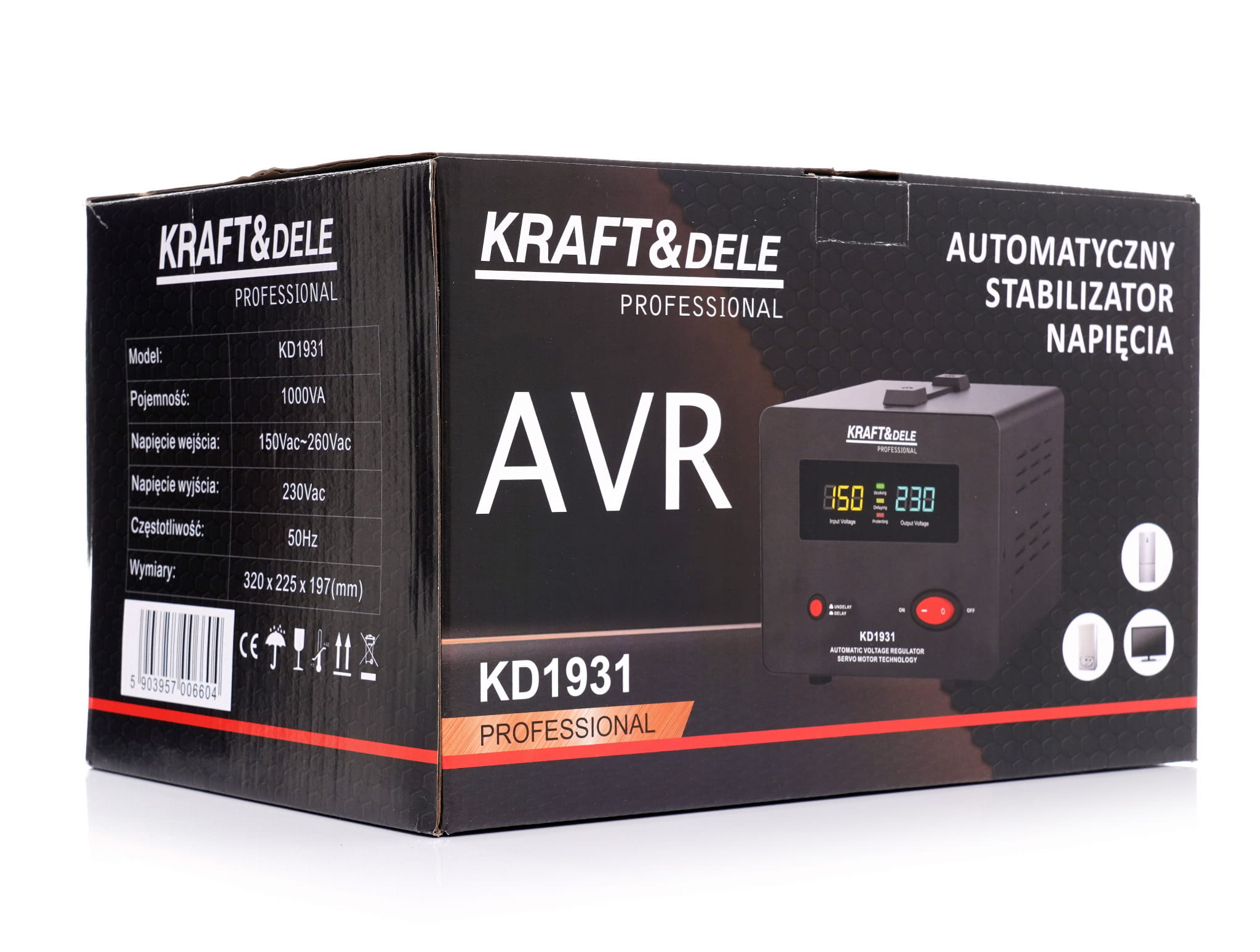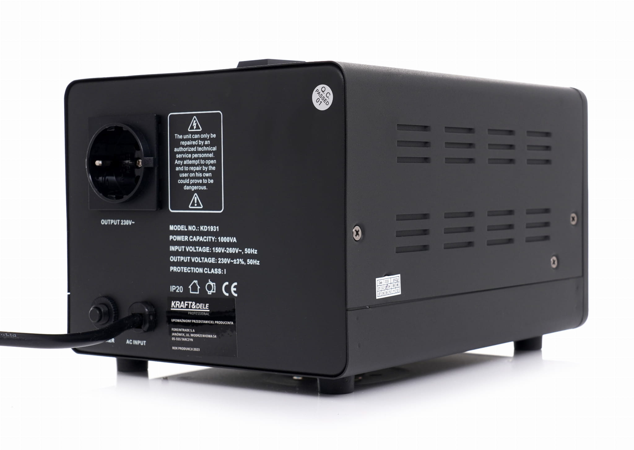 KD1931 to automatyczny stabilizator napięcia (AVR) o mocy 1000 VA, przeznaczony do ochrony urządzeń elektrycznych przed skutkami niestabilnego napięcia w sieci. Urządzenie wyrównuje napięcie wejściowe z zakresu 160–260 V do stabilnych 230 V, jednocześnie pełniąc funkcję zabezpieczenia przeciwprzepięciowego.