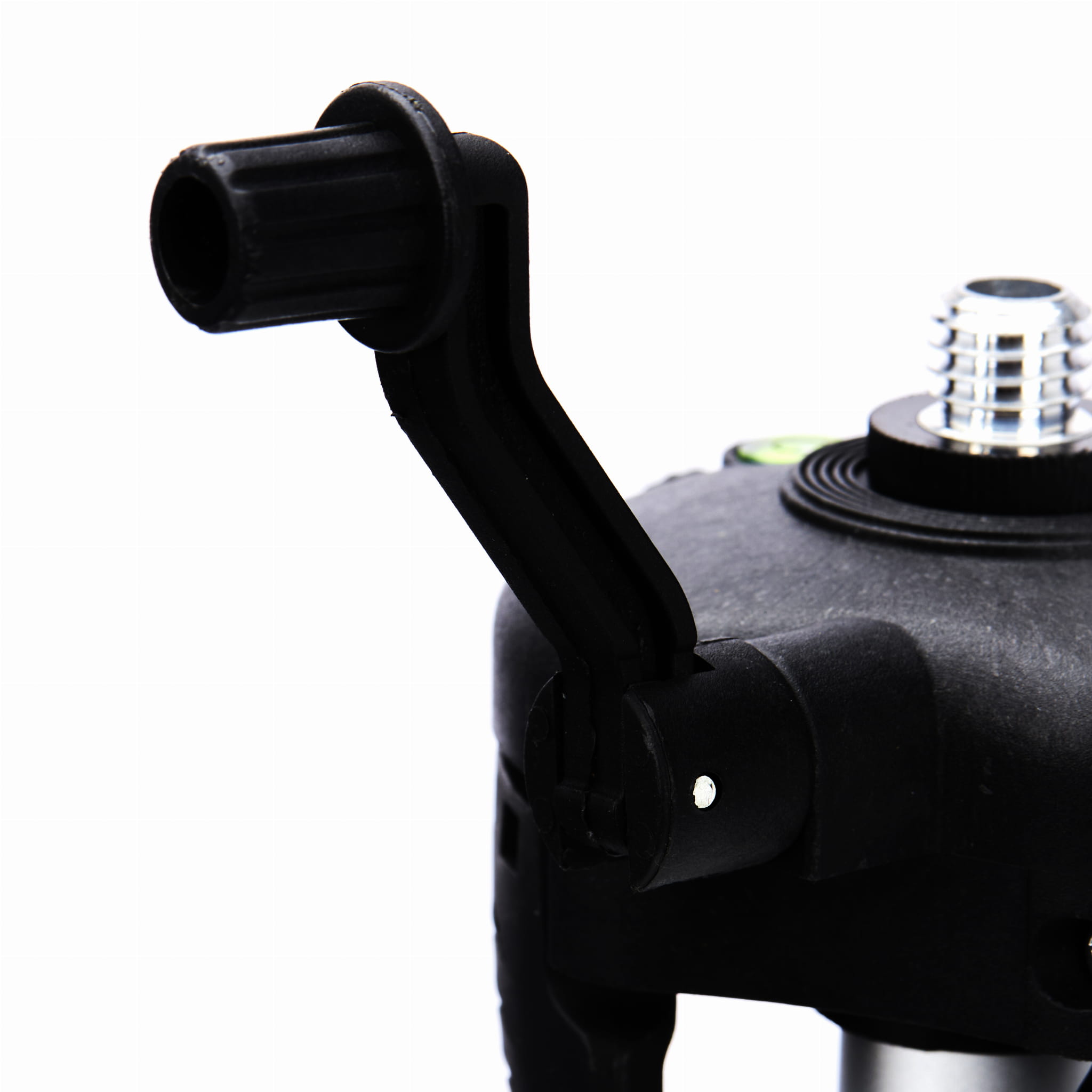 Nogi statywu wysuwa się manualnie, natomiast sztyca centralna regulowana jest za pomocą korby. Mechanizm korby umożliwia precyzyjne, płynne ustawianie wysokości roboczej bez ryzyka gwałtownego opadnięcia głowicy — istotne przy pracy z wrażliwymi urządzeniami laserowymi.