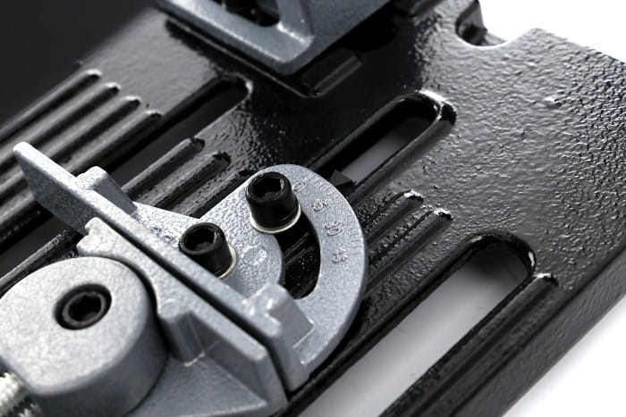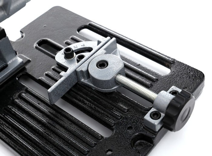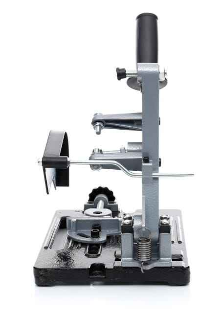 Wbudowany zacisk mocuje obrabiany materiał bezpośrednio na podstawie stojaka, eliminując konieczność stosowania oddzielnych imadeł lub uchwytów. Pozwala to na powtarzalne cięcia pod stałym kątem bez konieczności każdorazowego ustawiania elementu.