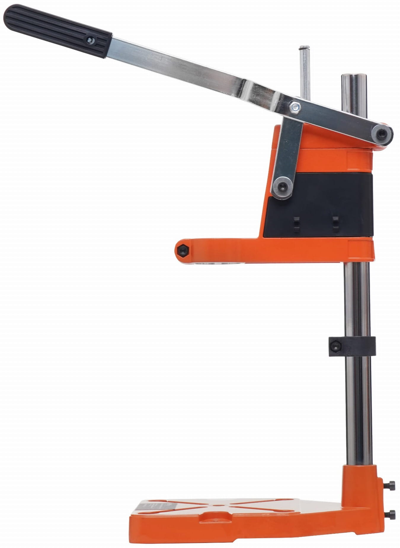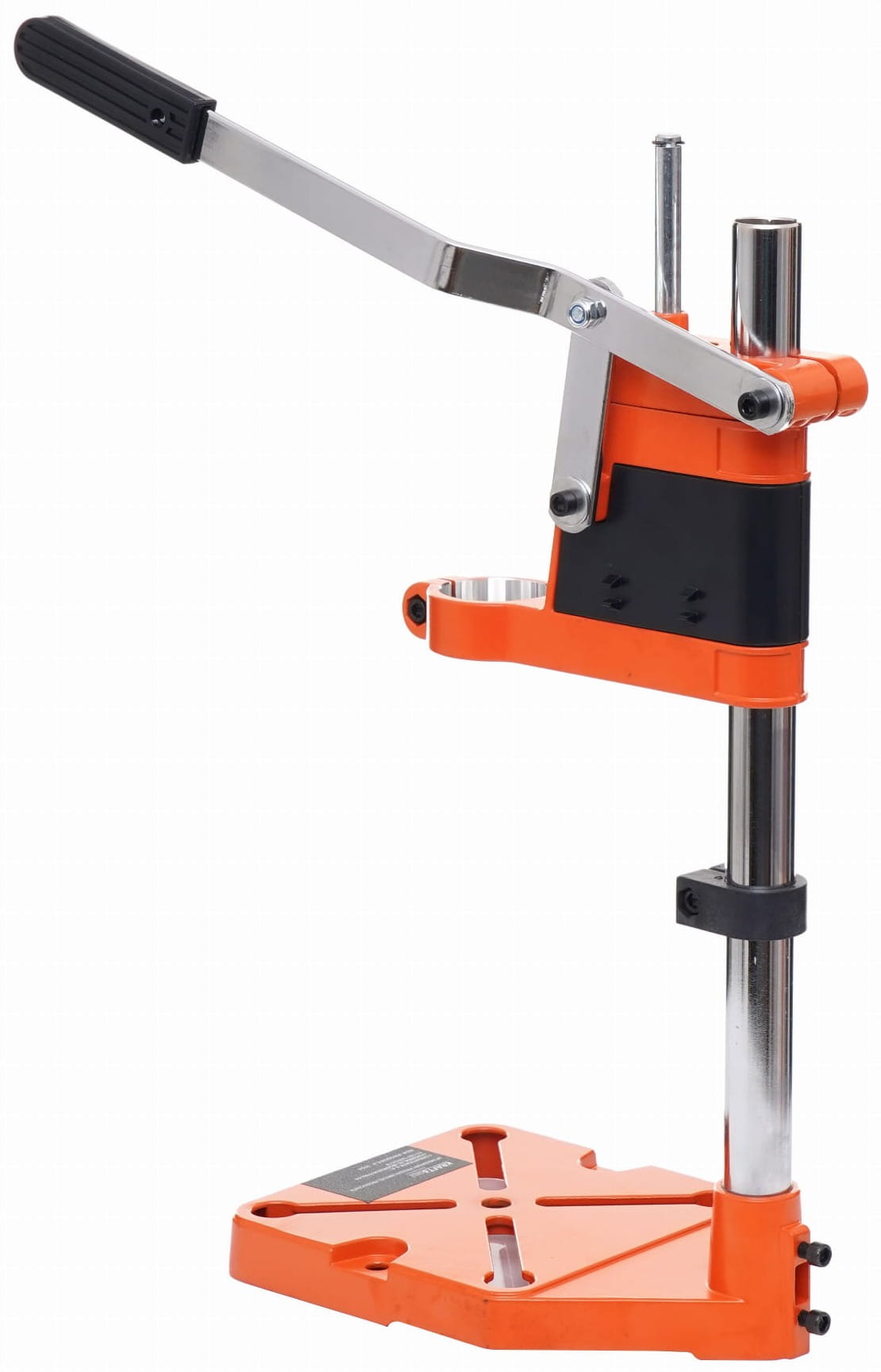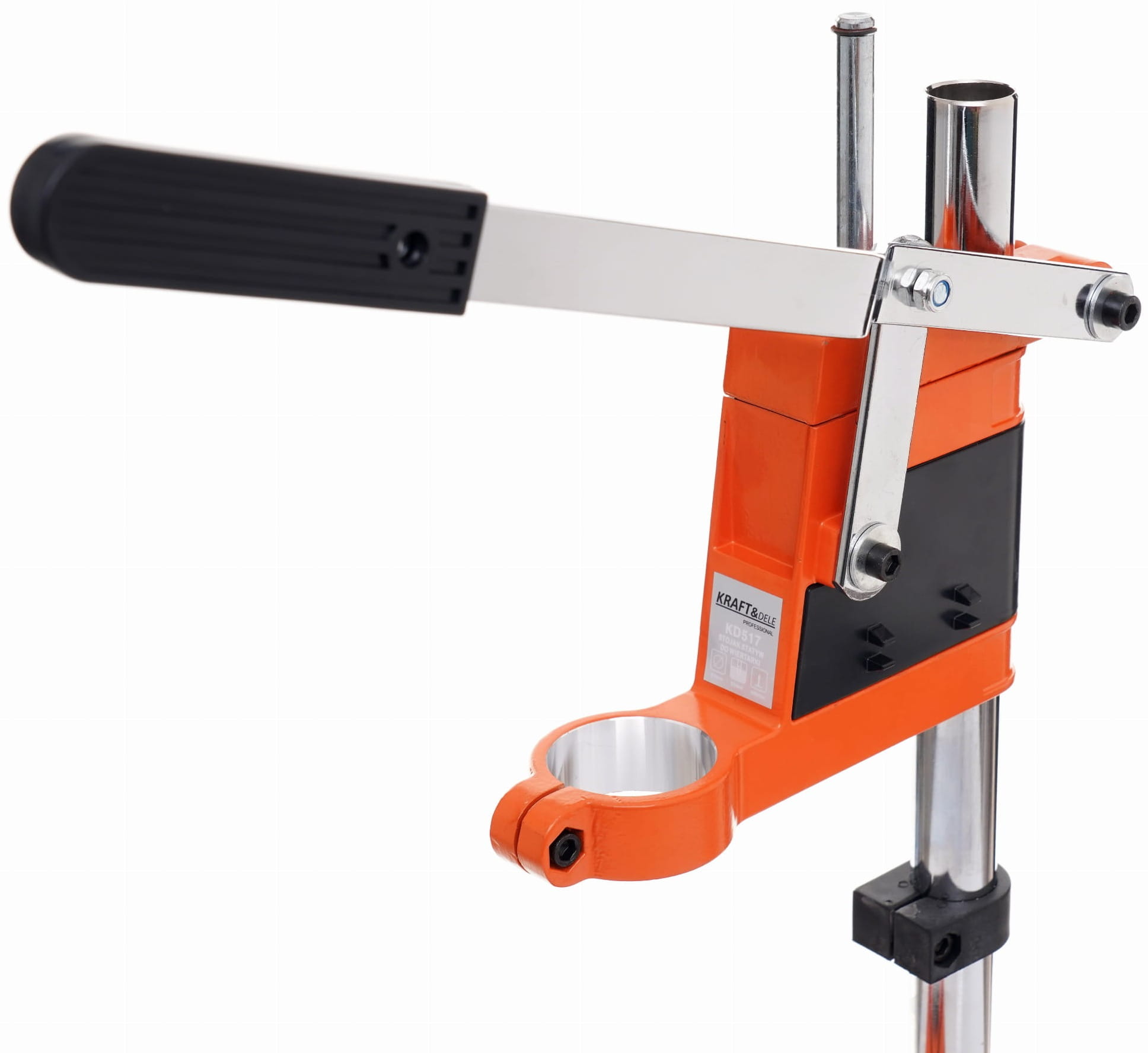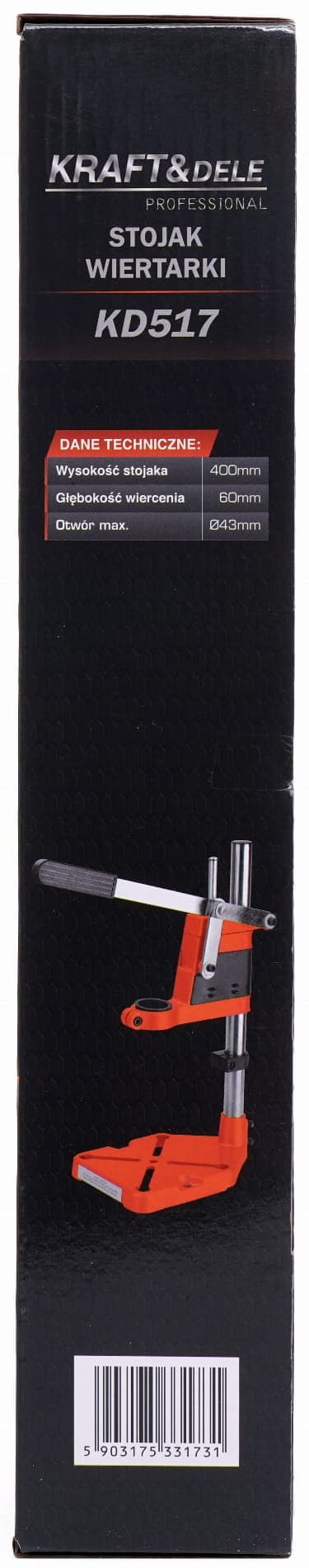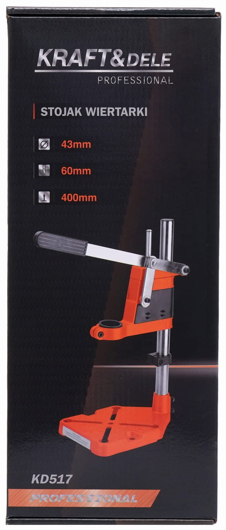 KD517 to statyw do wiertarki wykonany z aluminium i tworzywa sztucznego, przeznaczony do prowadzonego, powtarzalnego wiercenia otworów pod kątem prostym. Umożliwia zamianę ręcznej wiertarki elektrycznej w uproszczoną wiertarkę stołową, bez konieczności zakupu dedykowanego urządzenia stacjonarnego.