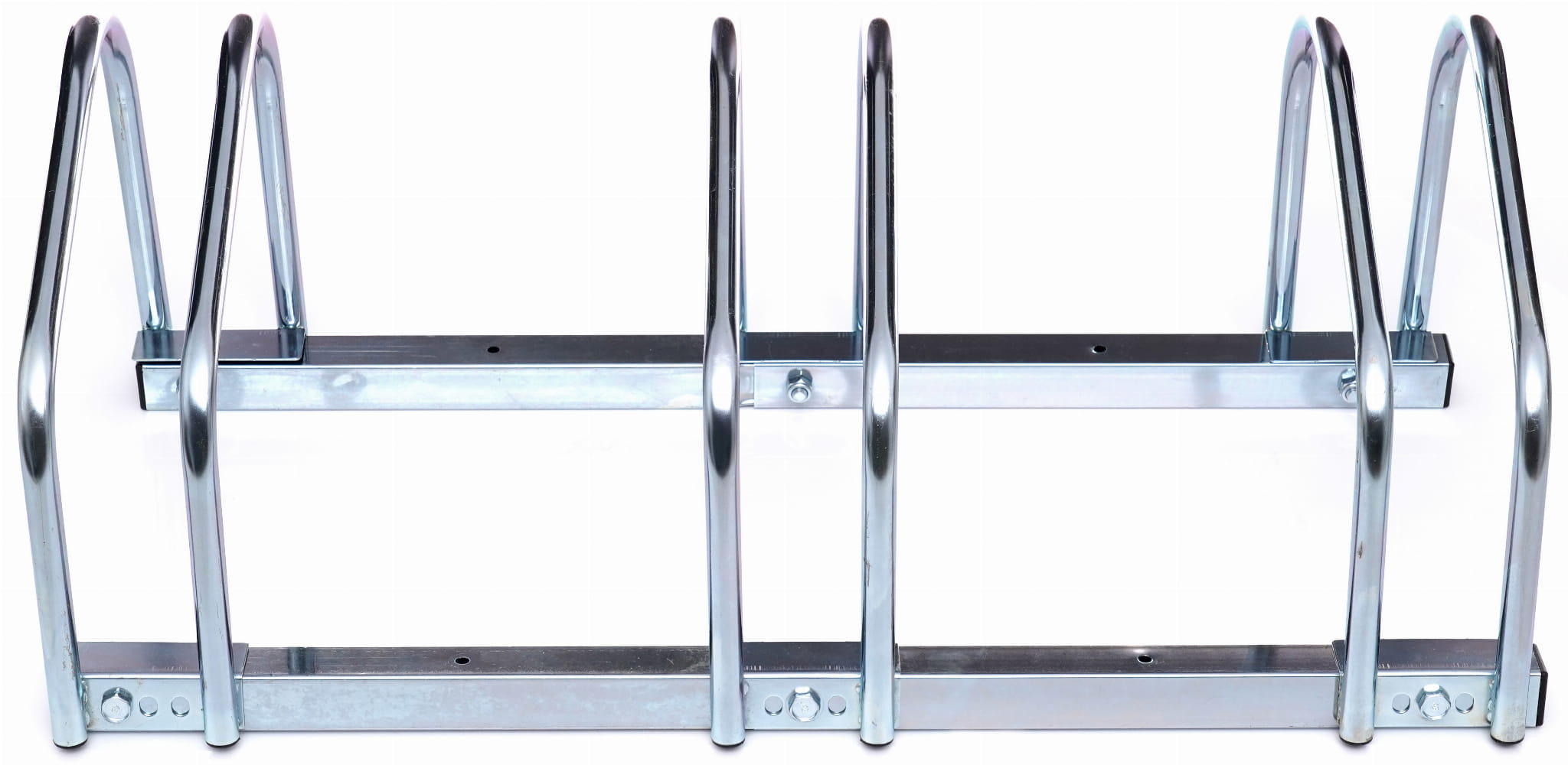 Konstrukcja przewiduje punkty mocowania do podłoża (elementy montażowe w zestawie). Zakotwiczony stojak nie przesuwa się podczas wsuwania roweru i stanowi punkt oparcia dla zapięcia rowerowego — co jest istotne przy parkowaniu w miejscach publicznych lub przy wejściu do budynku.