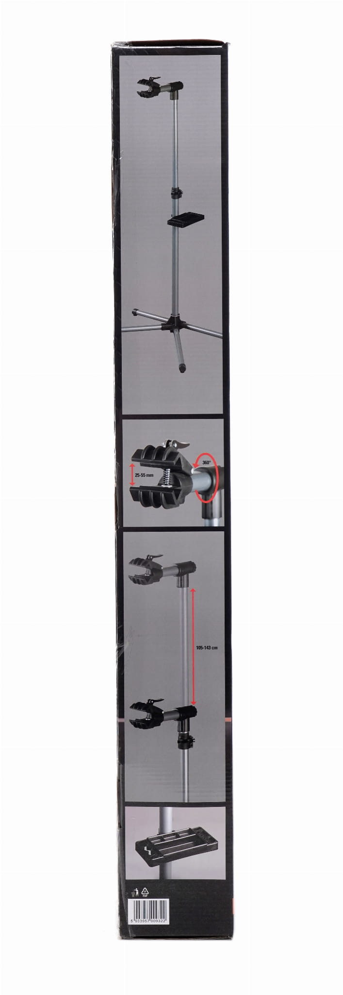 Stojak umożliwia płynną regulację wysokości w zakresie 105–143 cm. Pozwala to dopasować pozycję roweru do wzrostu użytkownika i rodzaju wykonywanej czynności serwisowej, co ogranicza przeciążenie kręgosłupa przy dłuższej pracy.