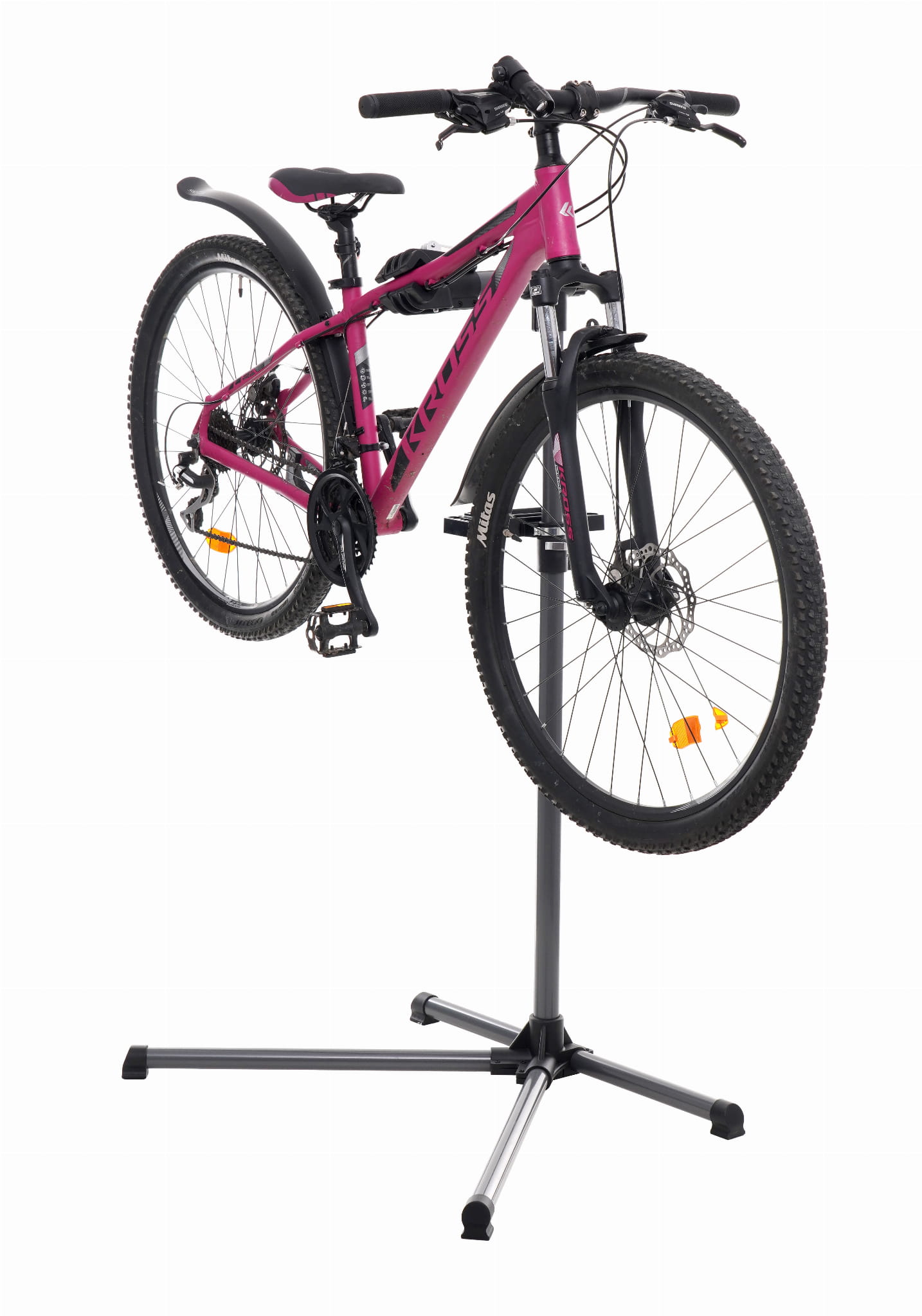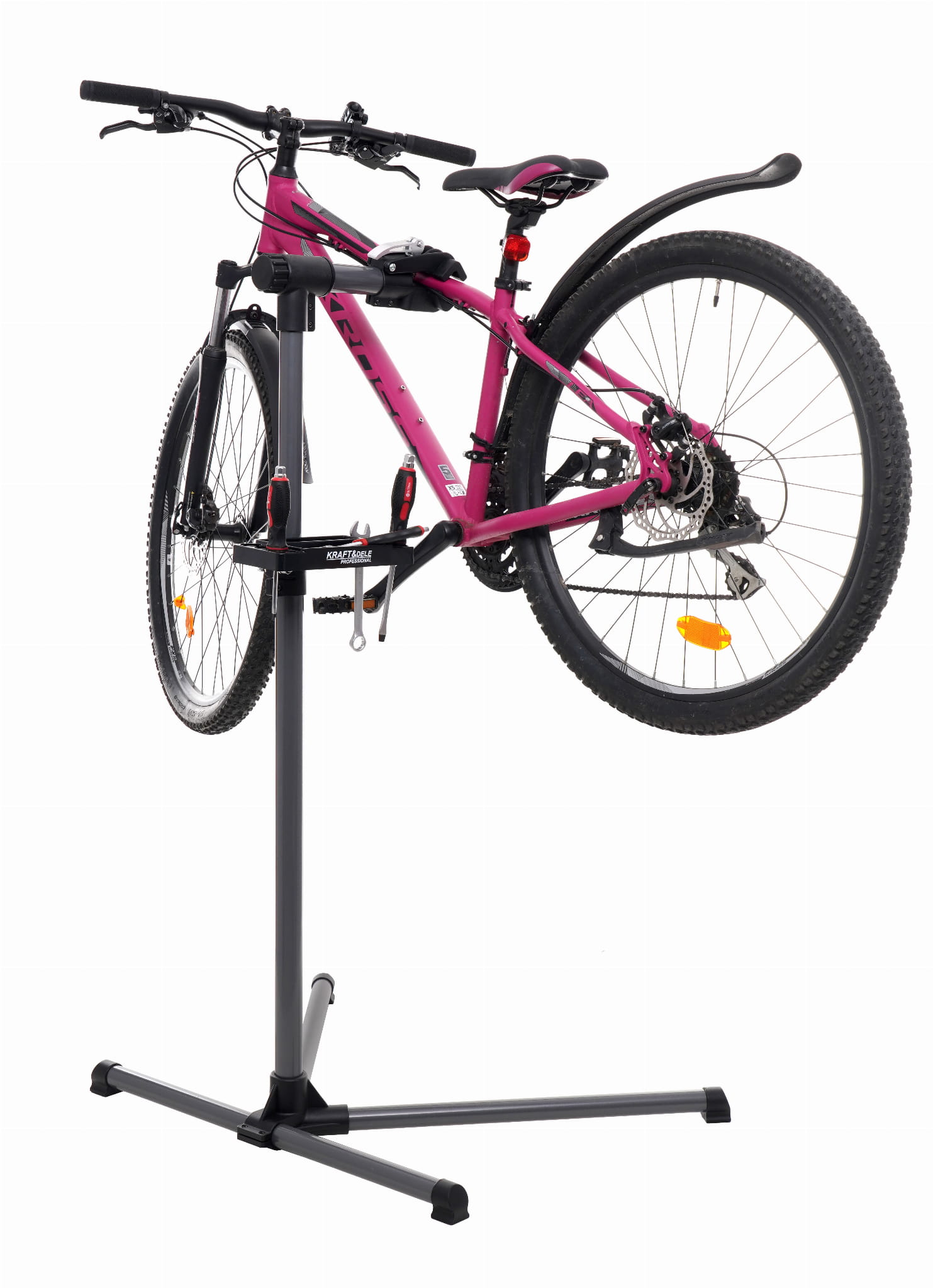 Wolnostojący stojak serwisowy przeznaczony do montażu i naprawy rowerów różnych typów — w tym rowerów elektrycznych, oversize oraz z ramą w kształcie litery Y. Stalowa konstrukcja z regulowaną wysokością i obrotową głowicą umożliwia wygodną pracę bez konieczności schylania się.