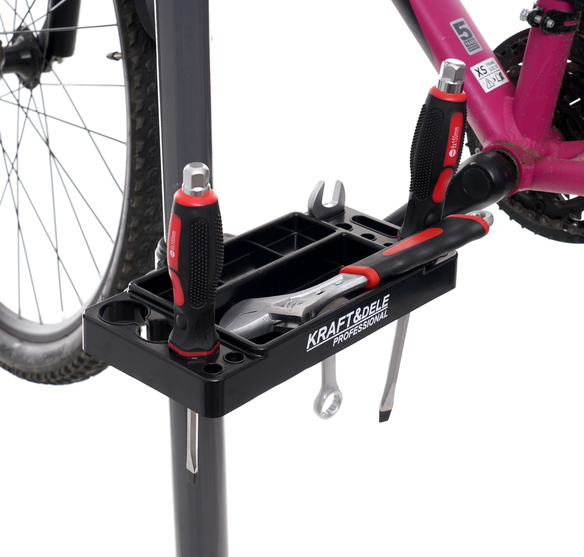 Regulowana taca montowana do kolumny stojaka zapewnia miejsce na klucze, śruby i drobny osprzęt bezpośrednio przy stanowisku pracy. Eliminuje konieczność odkładania narzędzi na podłogę lub szukanie ich w trakcie naprawy.