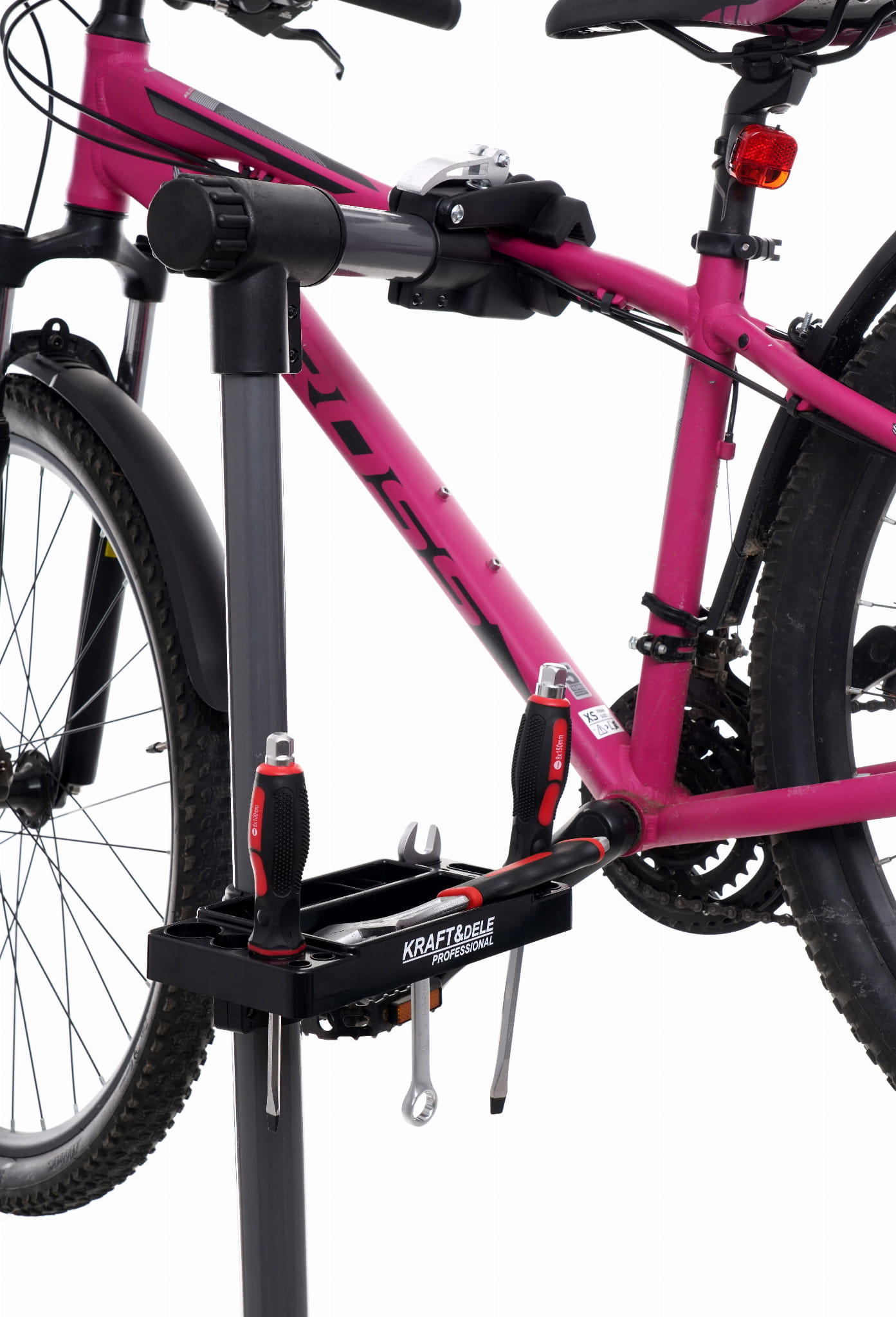 Zamontowany rower można swobodnie obracać wokół osi poziomej bez konieczności zdejmowania go ze stojaka. Ułatwia to dostęp do wszystkich elementów napędowych, hamulcowych i karoserii bez zmiany pozycji roboczej.