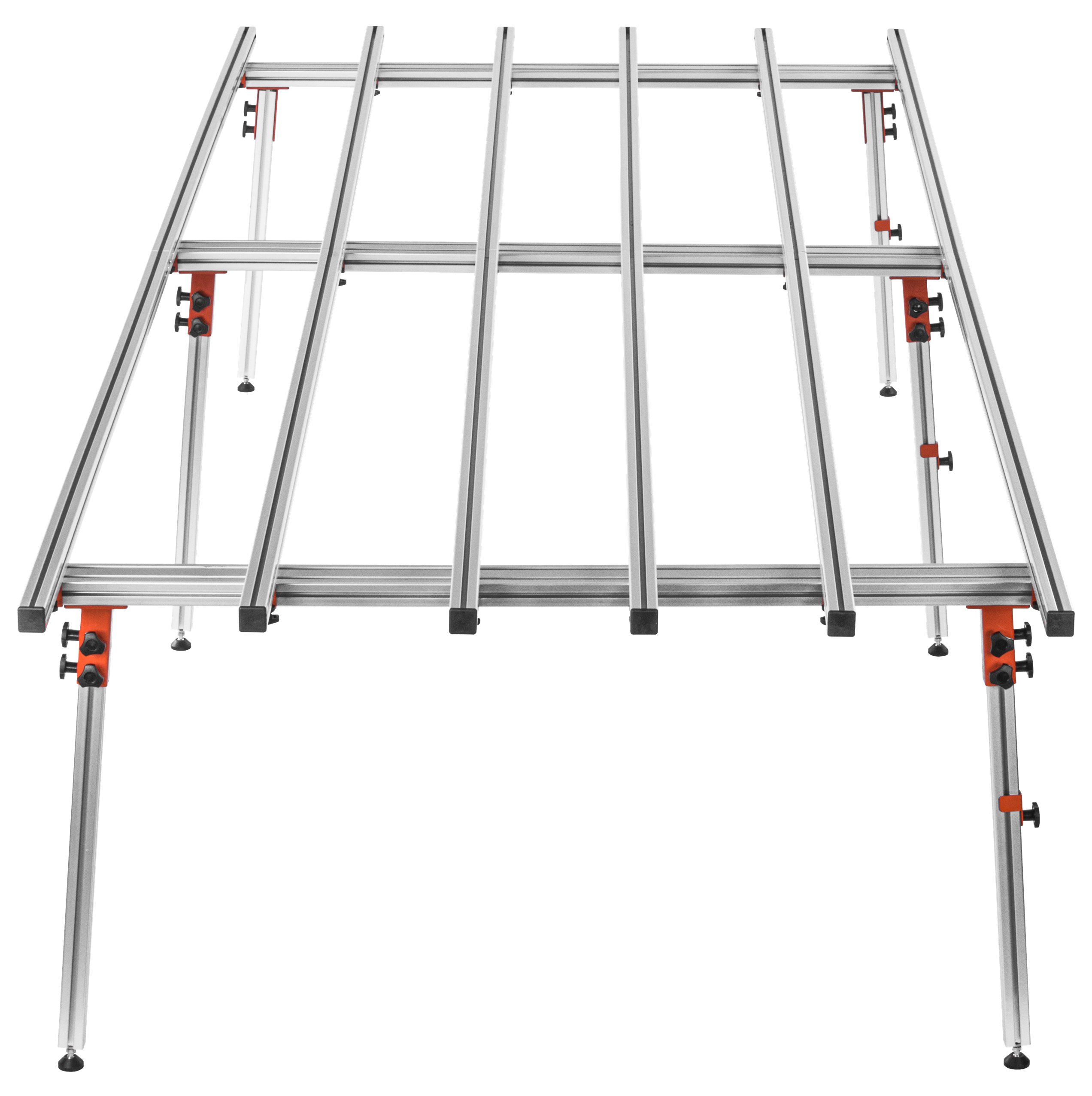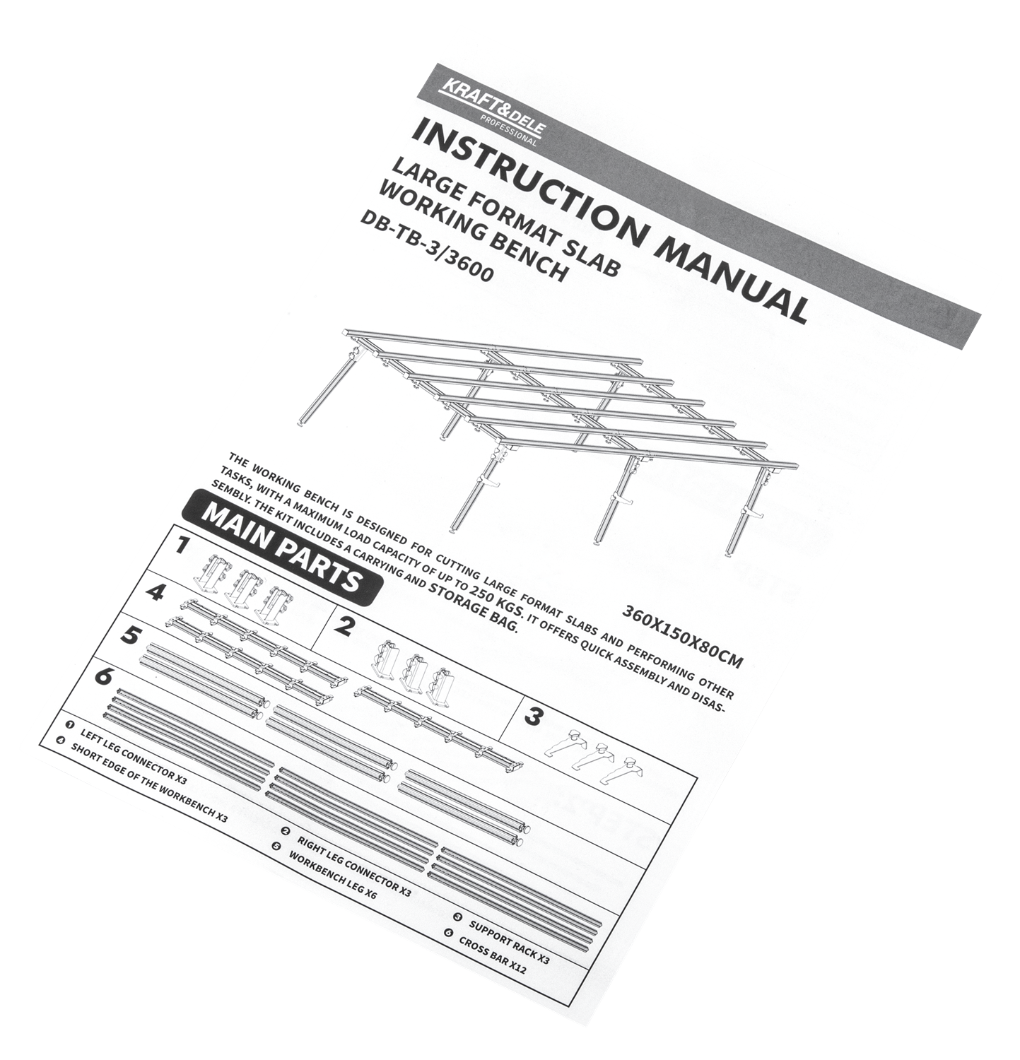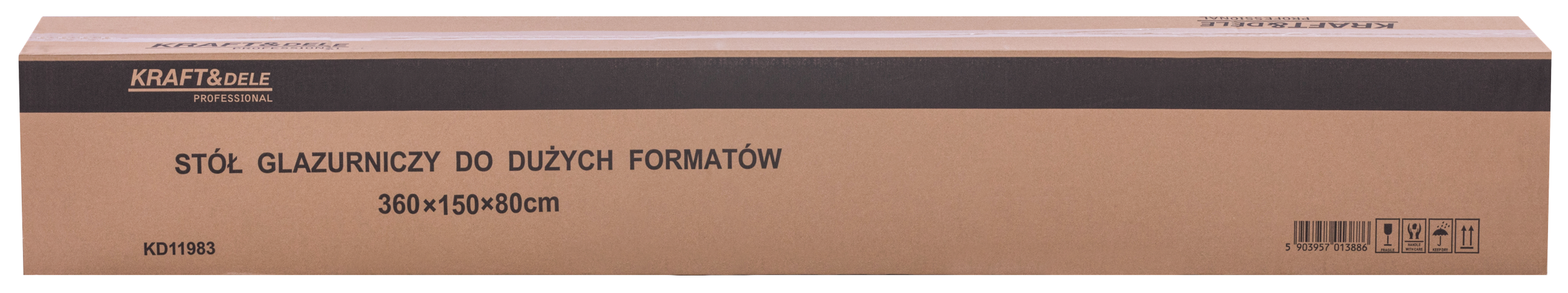 Stół roboczy KD11983 to składana konstrukcja aluminiowo-stalowa przeznaczona do obróbki wielkoformatowych płyt ceramicznych, kamiennych i kompozytowych. Powierzchnia robocza 360×150 cm pozwala na swobodną pracę z płytami o dużych wymiarach bez konieczności ich przycinania na podłodze lub prowizorycznych podkładach.