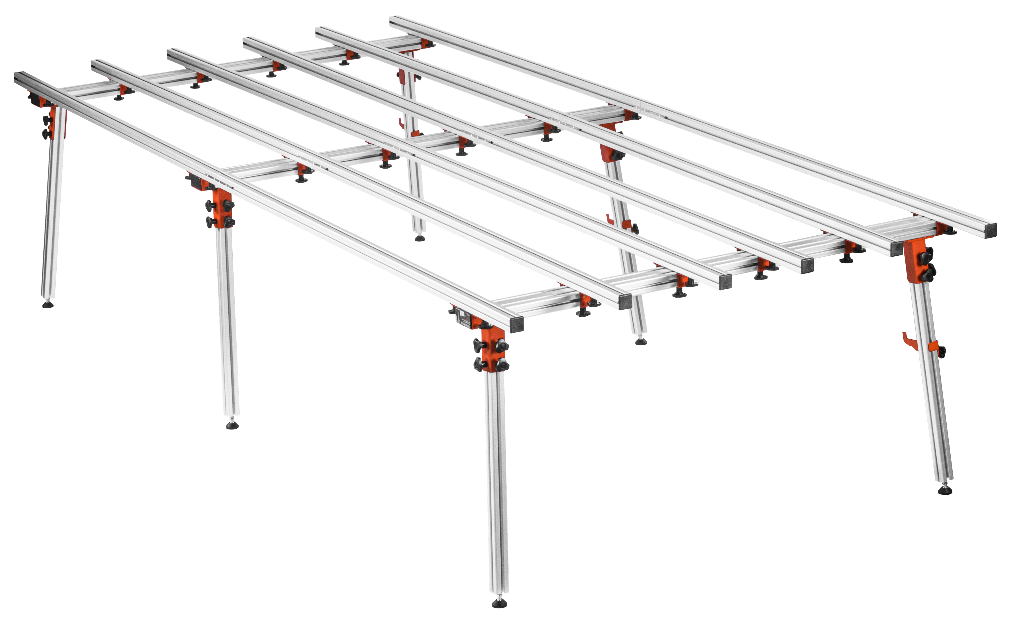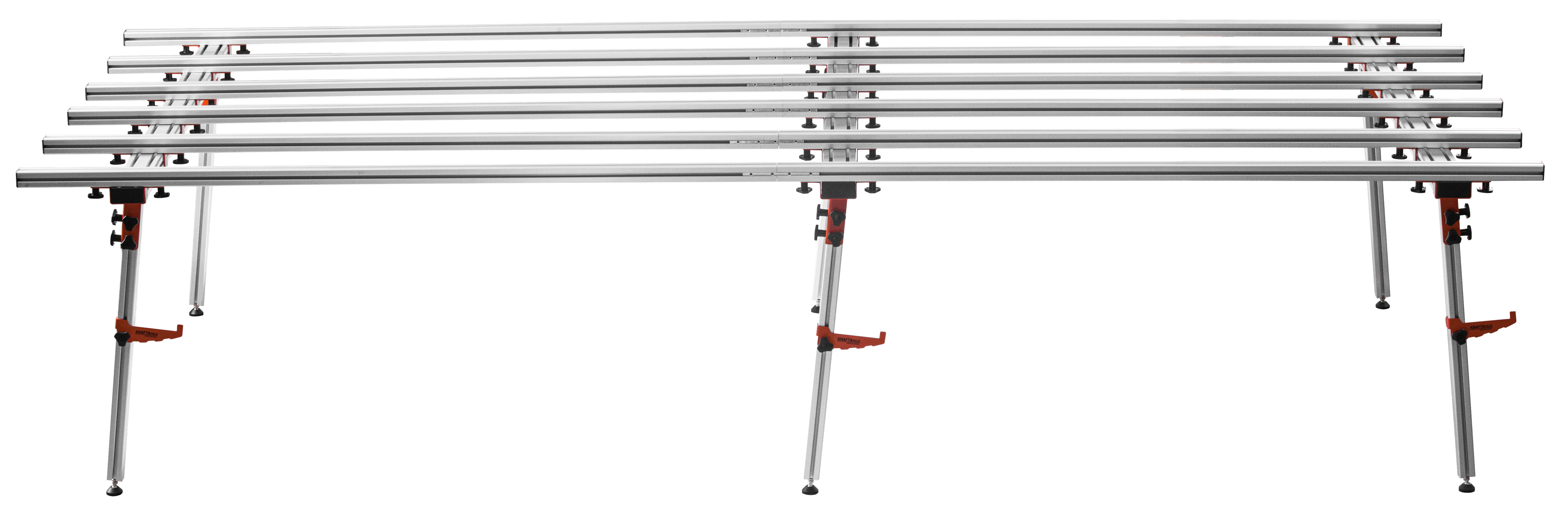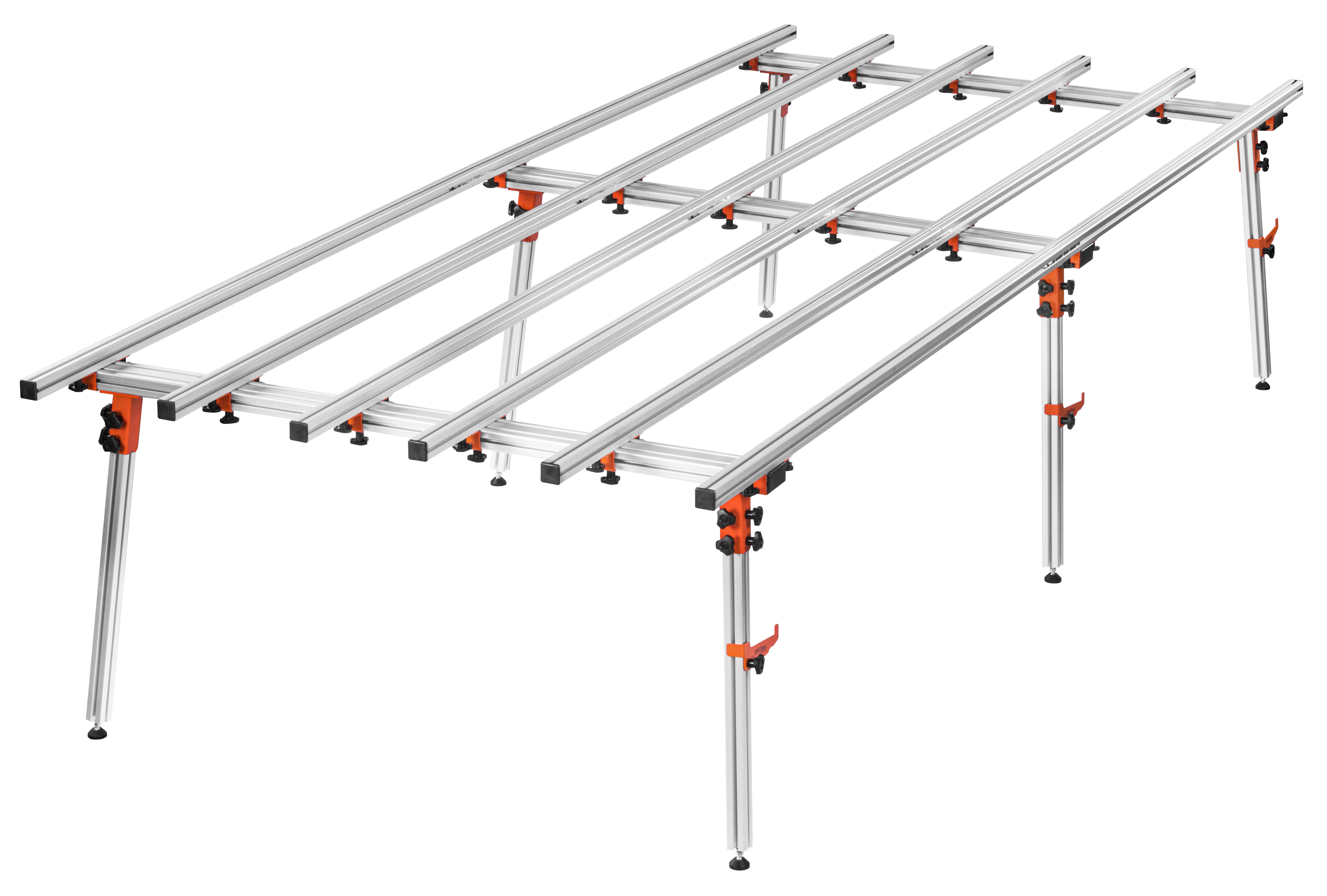 Stół składa się do kompaktowej formy umożliwiającej transport w samochodzie dostawczym lub na przyczepie. Dołączona torba transportowa chroni elementy przed uszkodzeniem i ułatwia załadunek na budowie lub w magazynie.